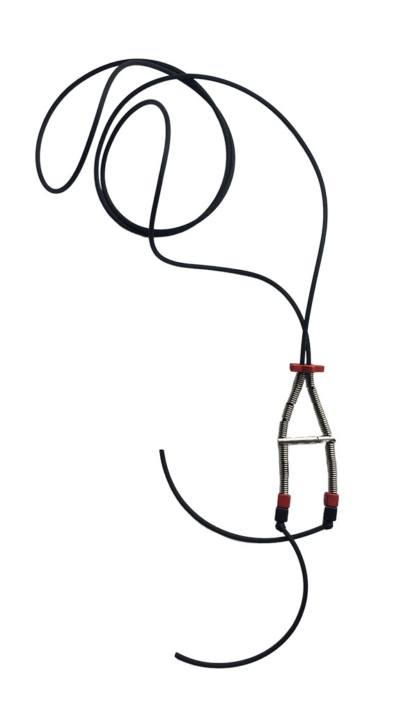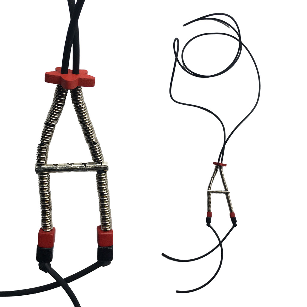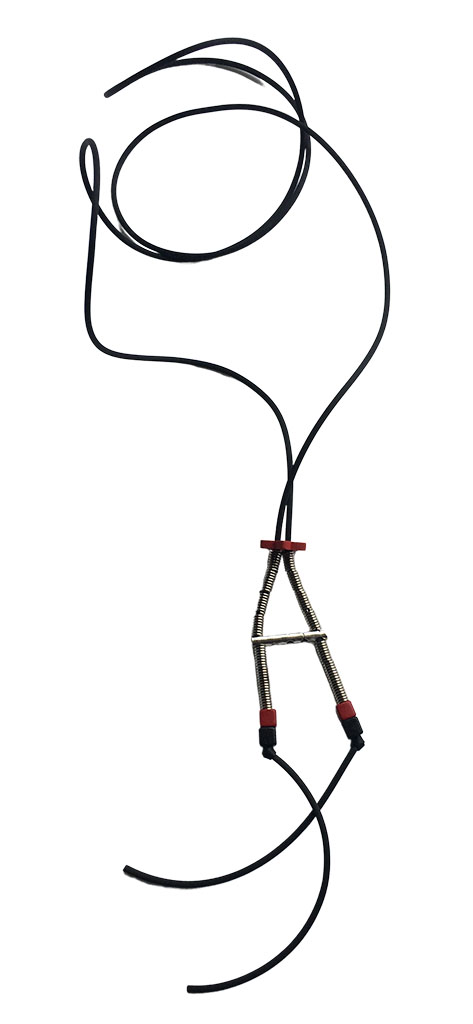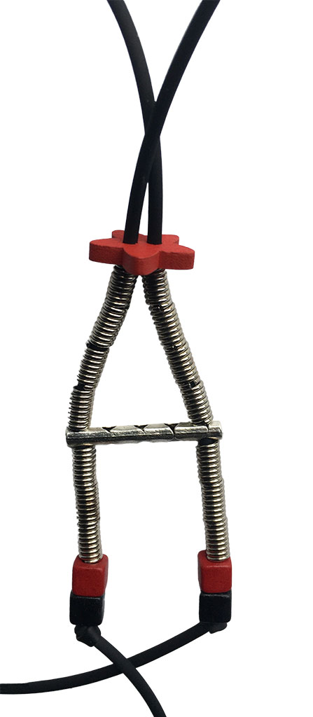 υλικά: 2 χιλ. μαύρο καουτσούκ, 14 κομ/3 χιλ. x 6 χιλ. ανάγλυφη μεταλλική χάντρα σχήμα σωλήνα ελατήριο, ξύλινη κόκκινη χάντρα σχήμα λουλουδιού 2 χιλ X 1,5 εκ, 2 τετράγωνες χάντρες από πηλό σε μαύρο χρώμα και 2 σε κόκκινο χρώμα 5 εκ Χ 5 εκ