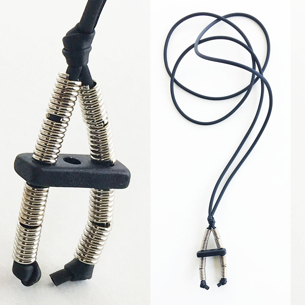 υλικά: 2 χιλ. μαύρο καουτσούκ, 3 χιλ. x 6 χιλ. ανάγλυφη μεταλλική χάντρα σχήμα σωλήνα, 2 χιλ. X 1,8 εκ. χάντρα από πηλό σε μαύρο χρώμα