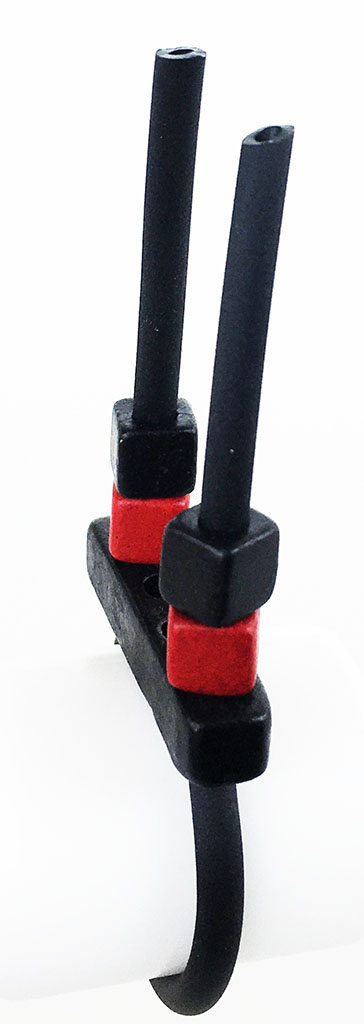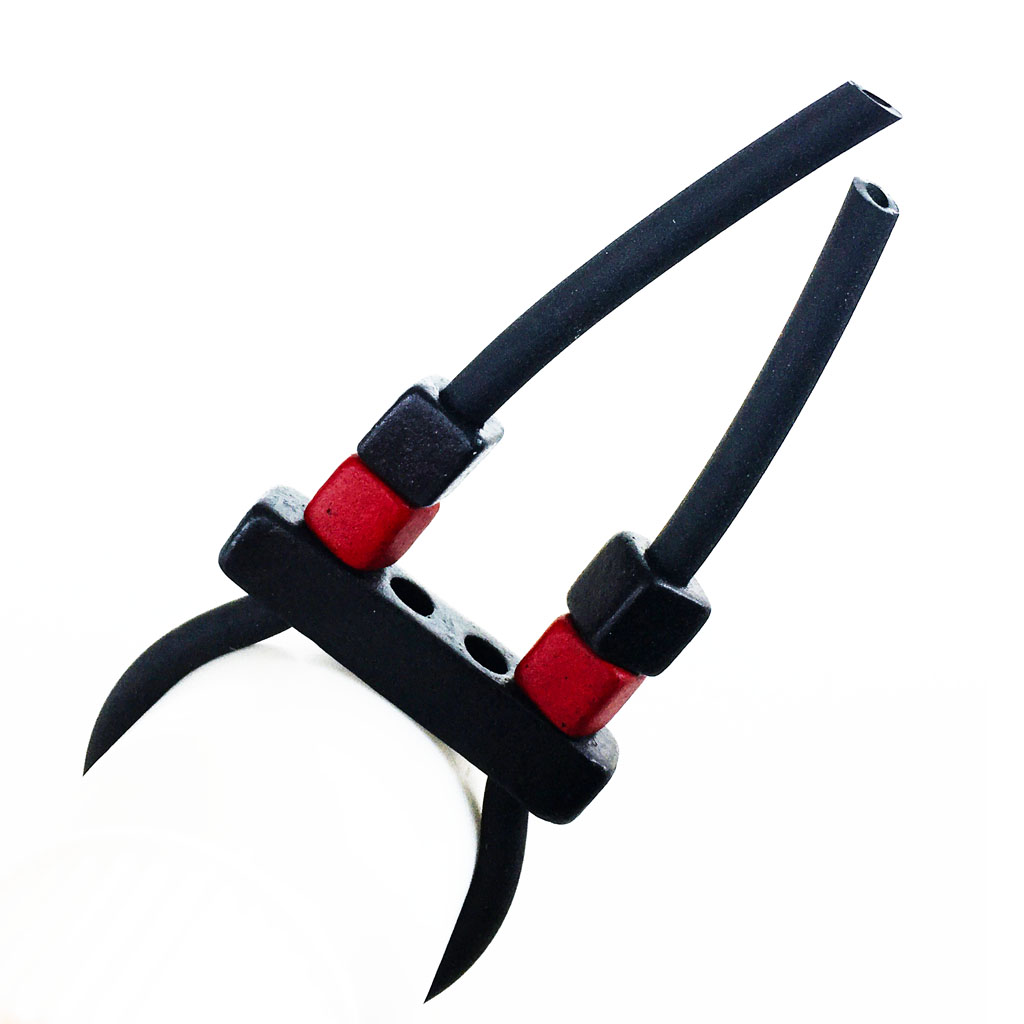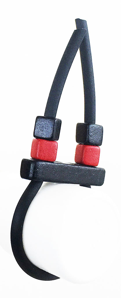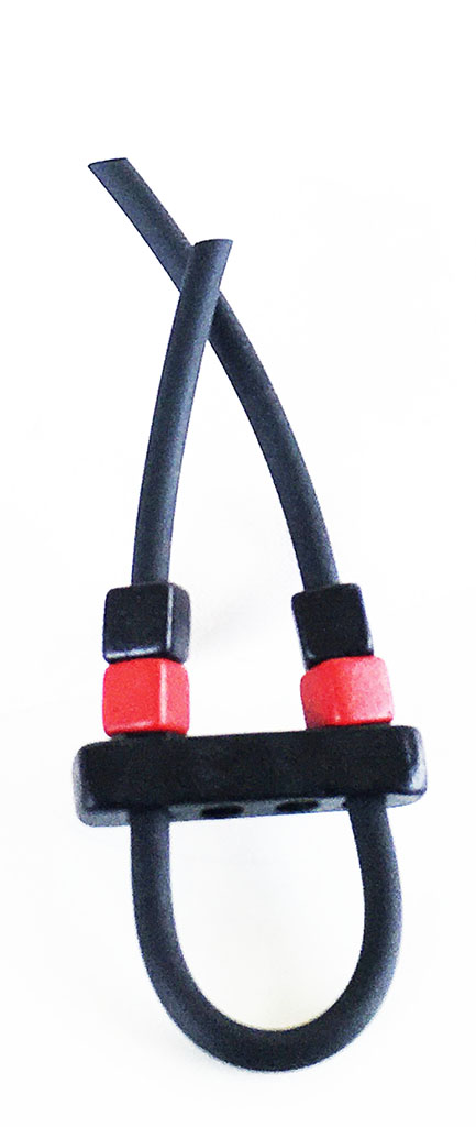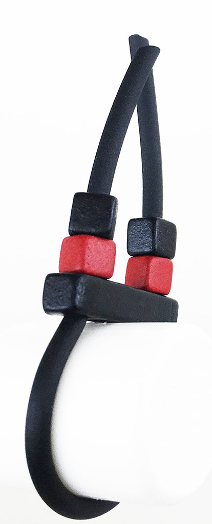 υλικά: 3 χιλ. μαύρο καουτσούκ, 5 χιλ. X 3 εκ. χάντρα από πηλό σε μαύρο χρώμα, 5 χιλ. τετράγωνες χάντρες από πηλό σε κόκκινο και μαύρο χρώμα