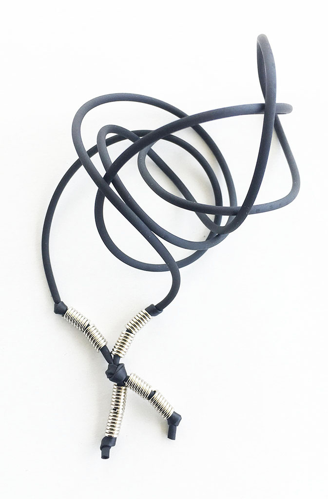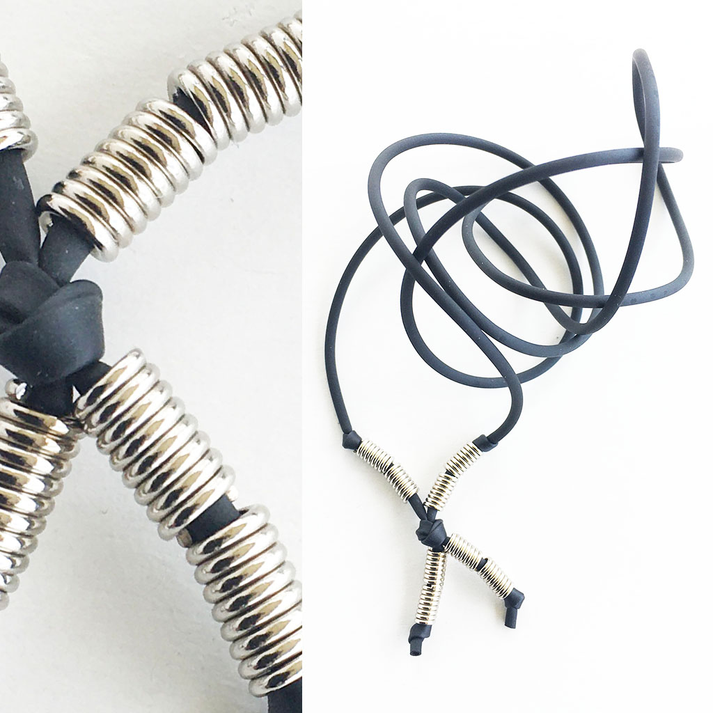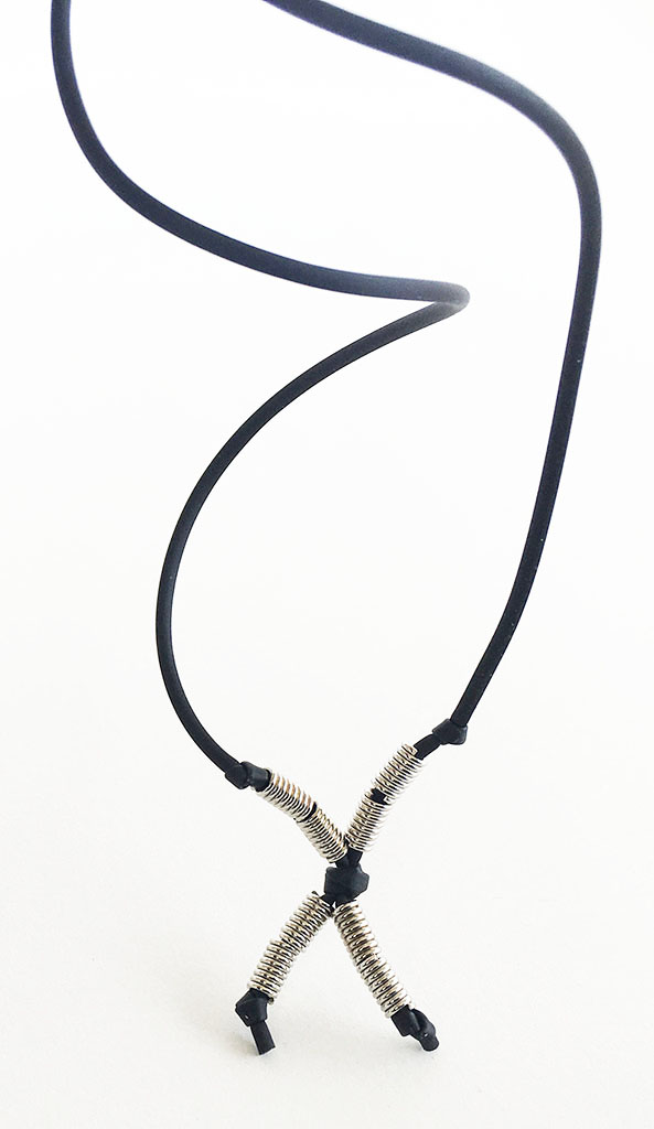 υλικά: 2 χιλ. μαύρο καουτσούκ, 3 χιλ. x 6 χιλ. ανάγλυφη μεταλλική χάντρα σχήμα σωλήνα
