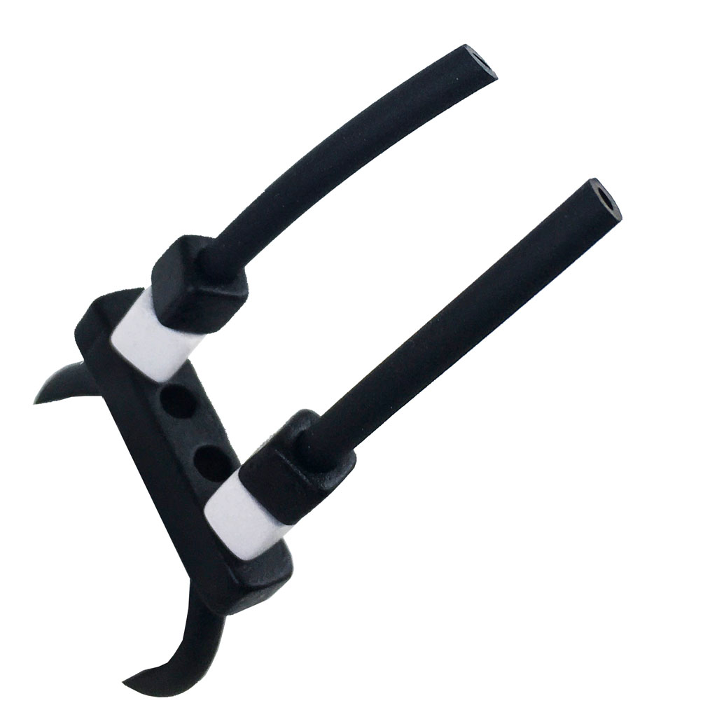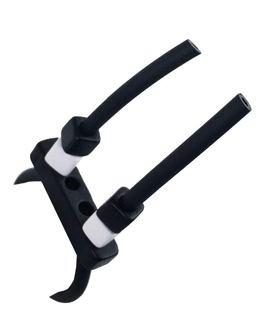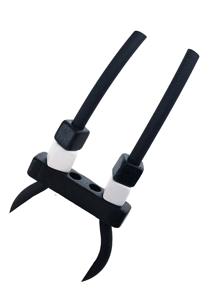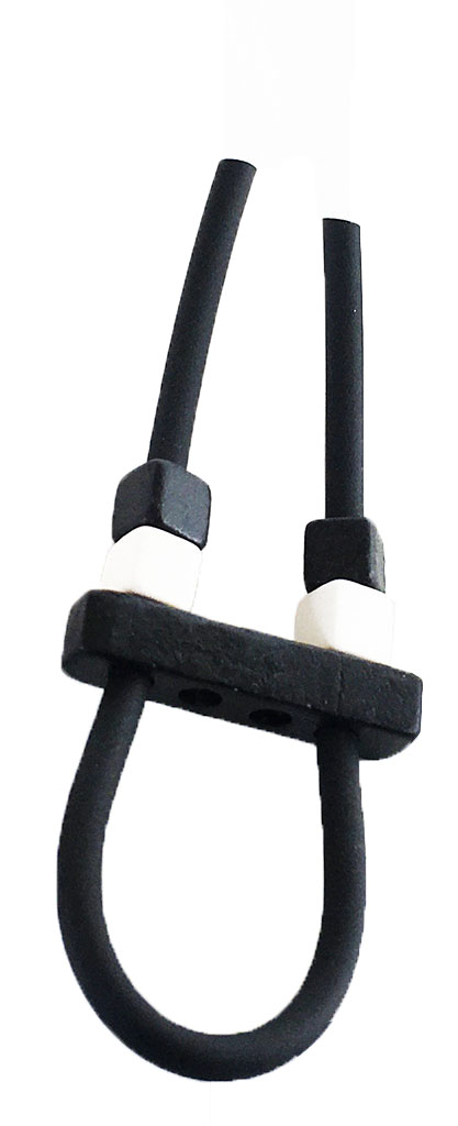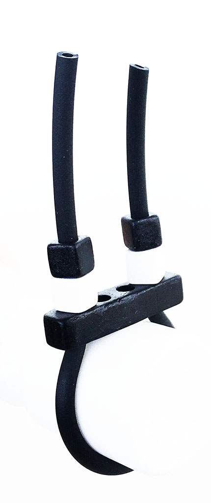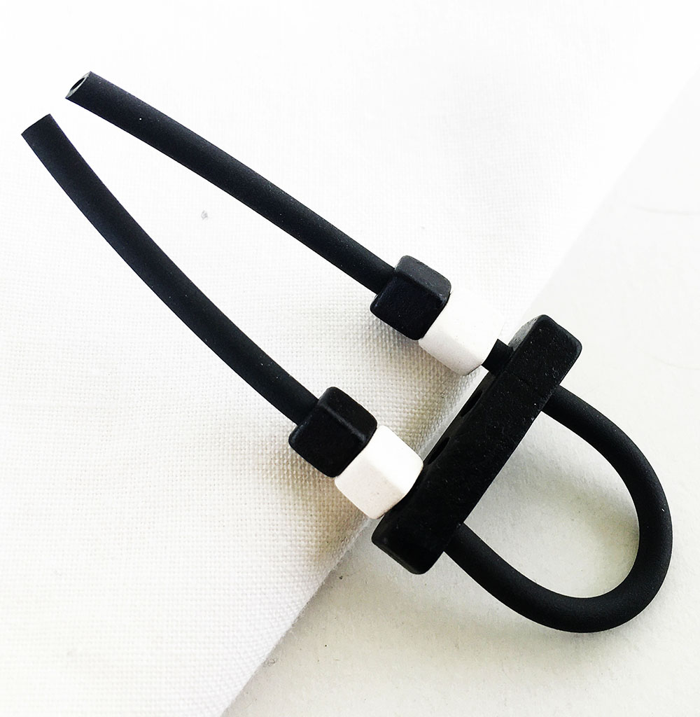 υλικά: 3 χιλ. μαύρο καουτσούκ, 5 χιλ. X 3 εκ. χάντρα από πηλό σε μαύρο χρώμα, 5 χιλ. τετράγωνες χάντρες από πηλό σε άσπρο και μαύρο χρώμα