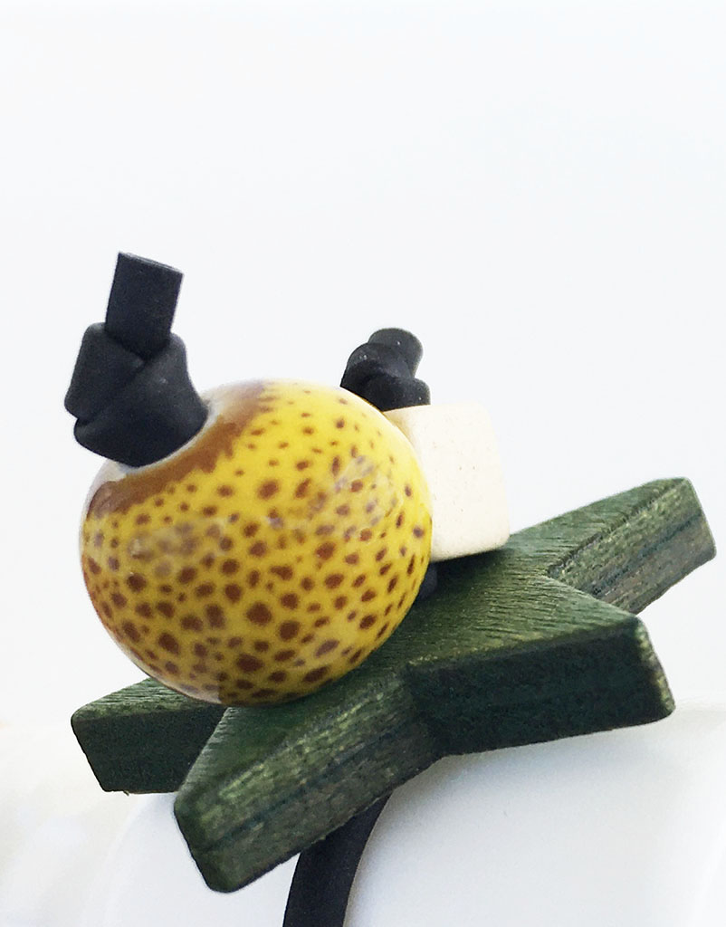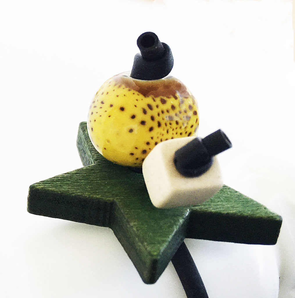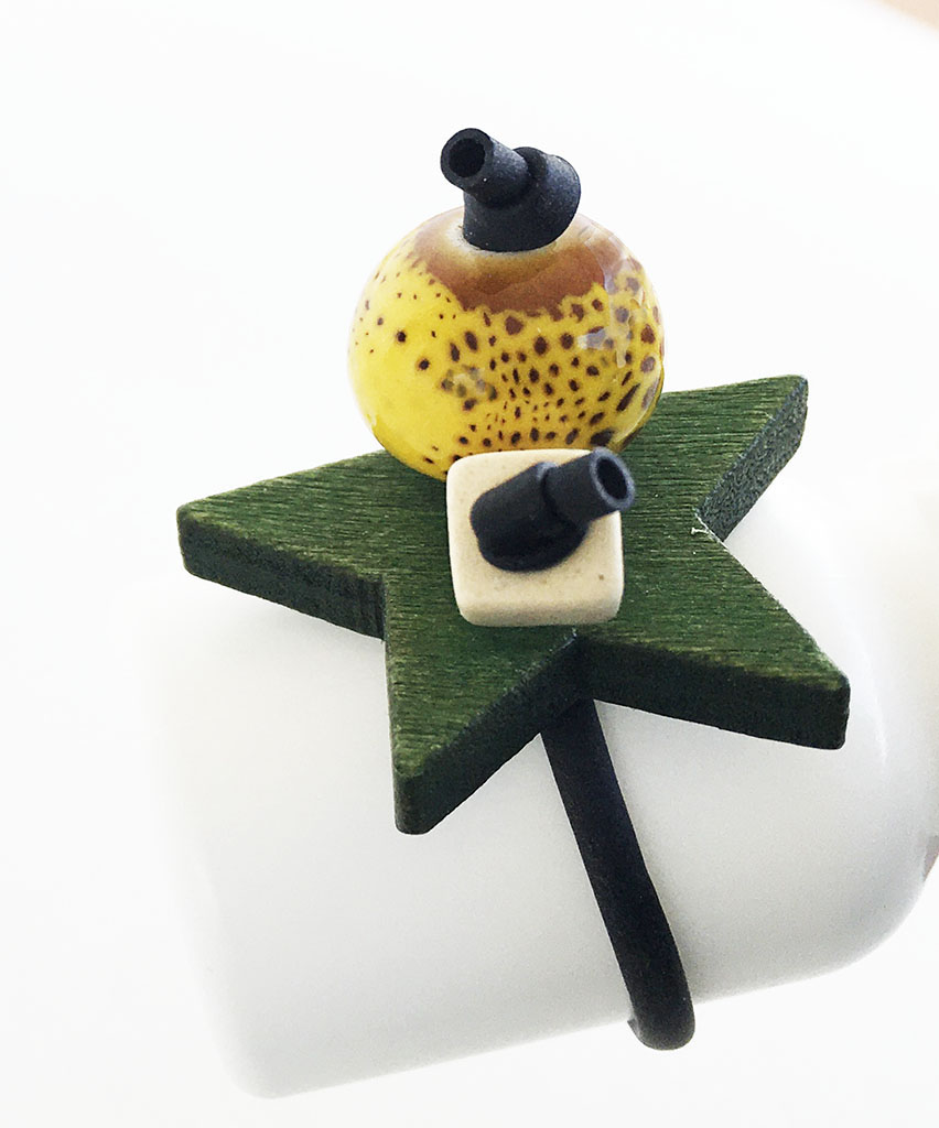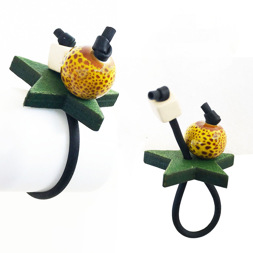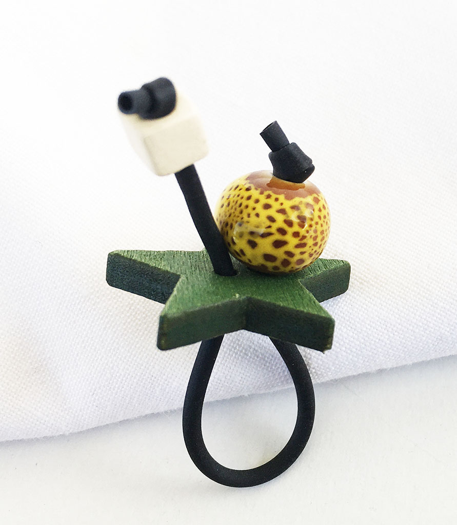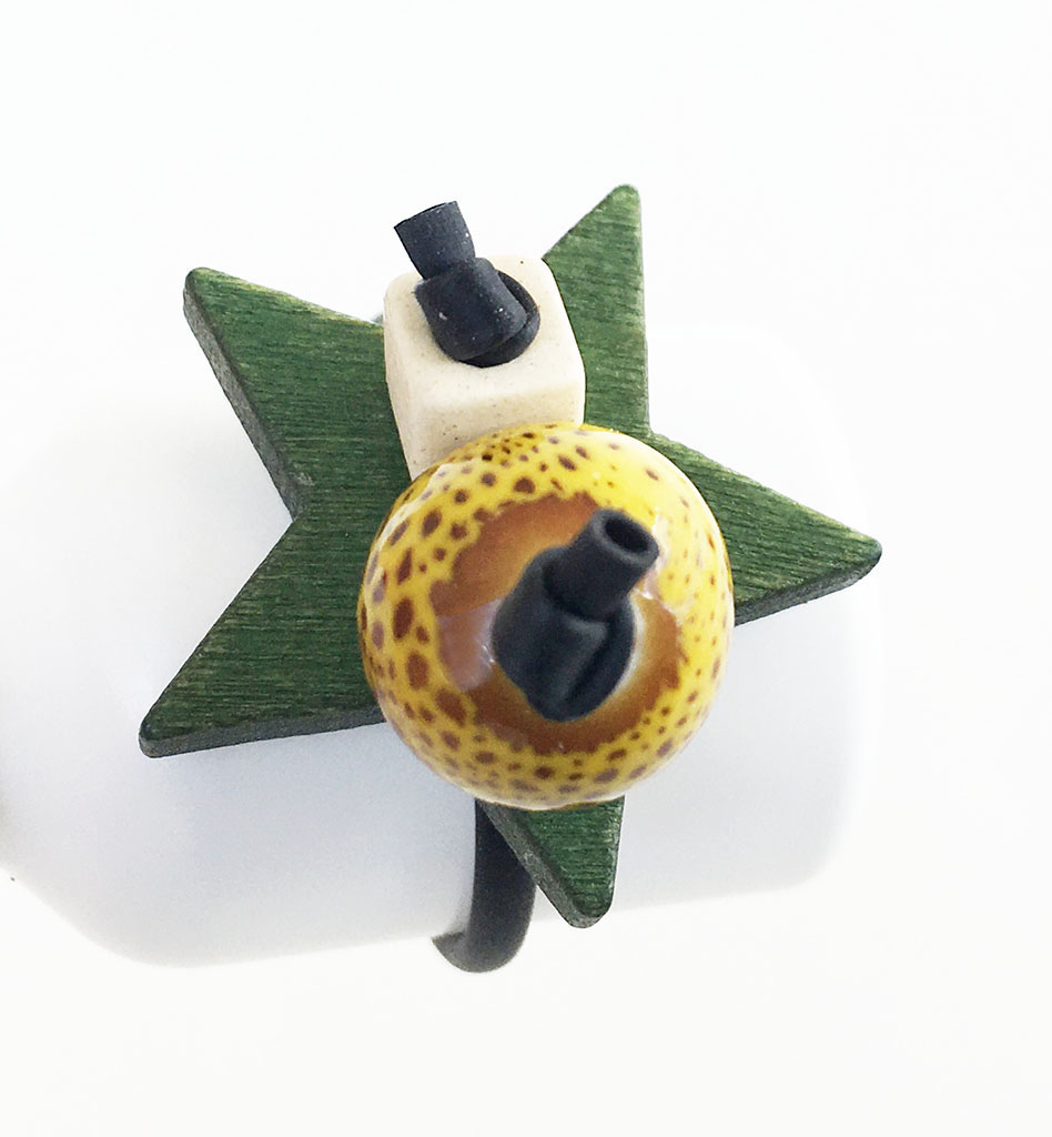 υλικά: 2 χιλ. μαύρο καουτσούκ, 10 χιλ. διάμετρος χάντρα από πηλό σε κίτρινο χρώμα με καφέ στίγματα, 5 χιλ. τετράγωνη χάντρα από πηλό σε εκρού χρώμα, 4 χιλ. X 2,5 εκ. ξύλινη επιφάνεια σχήμα αστέρι σε πράσινη απόχρωση