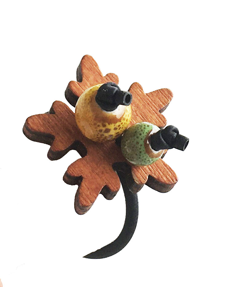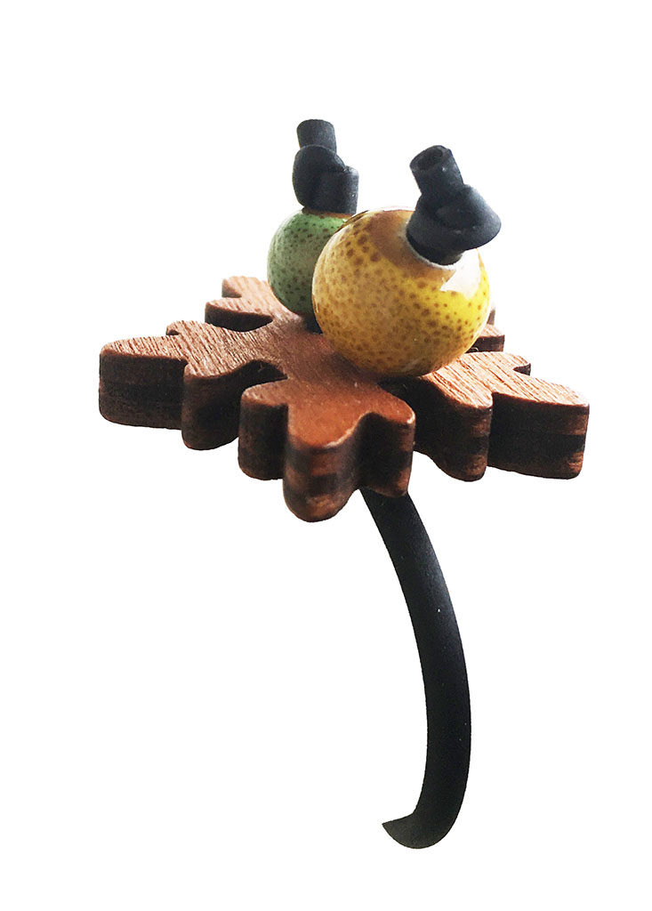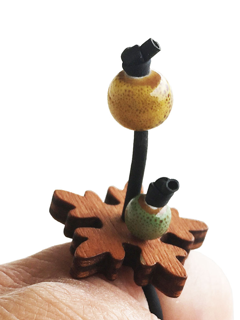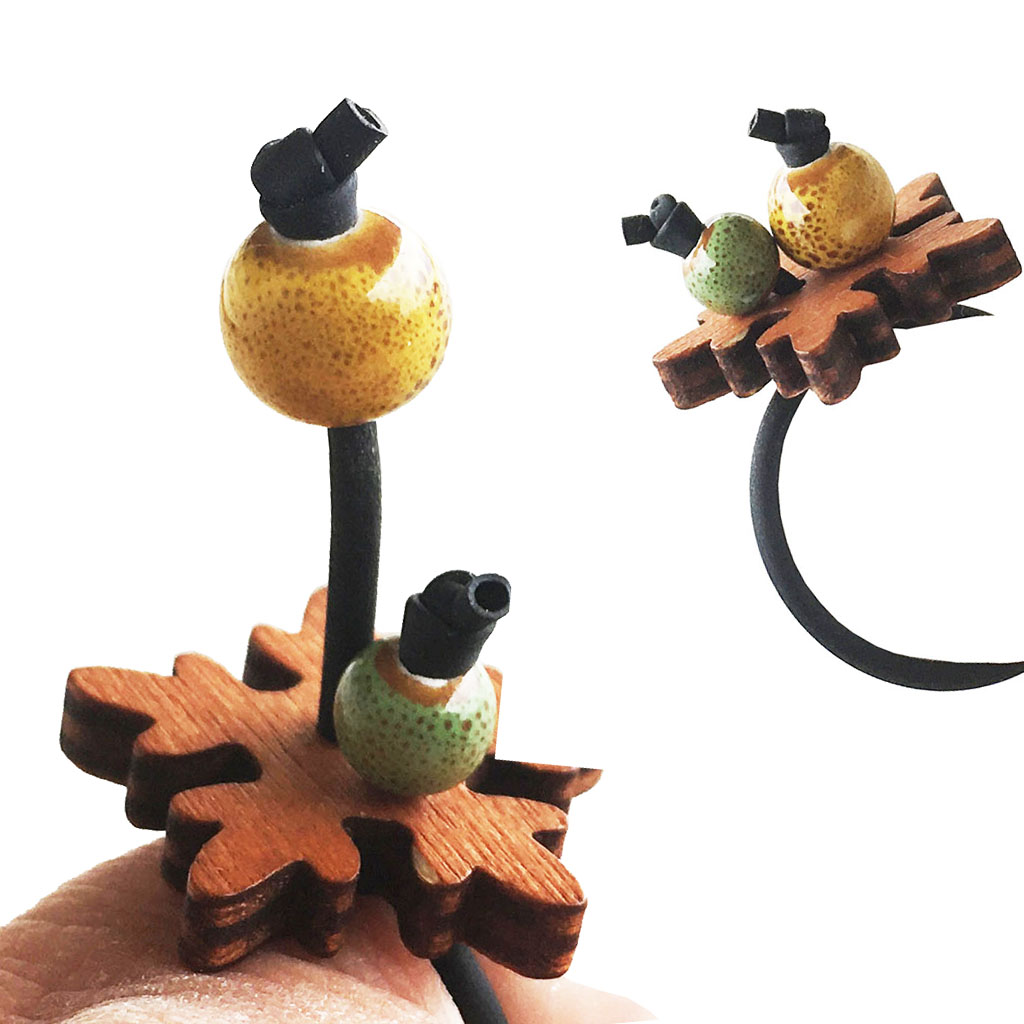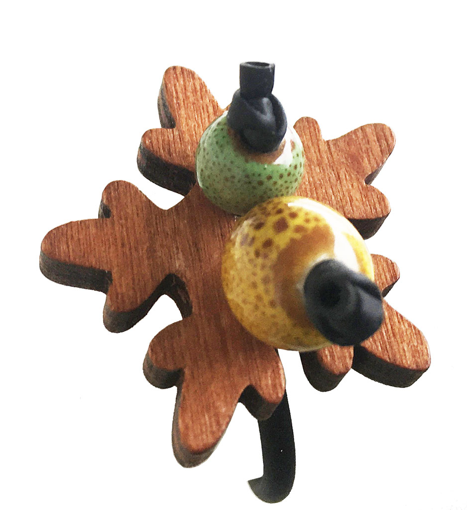 υλικά: 2 χιλ. μαύρο καουτσούκ, 4 χιλ. σε πάχος ξύλινη επιφάνεια στο χρώμα του ξύλου, 5 εκ. διάμετρο χάντρα από πηλό σε πράσινο χρώμα με καφέ στίγματα, 7 εκ. διάμετρο χάντρα από πηλό σε κίτρινο χρώμα με καφέ στίγματα…