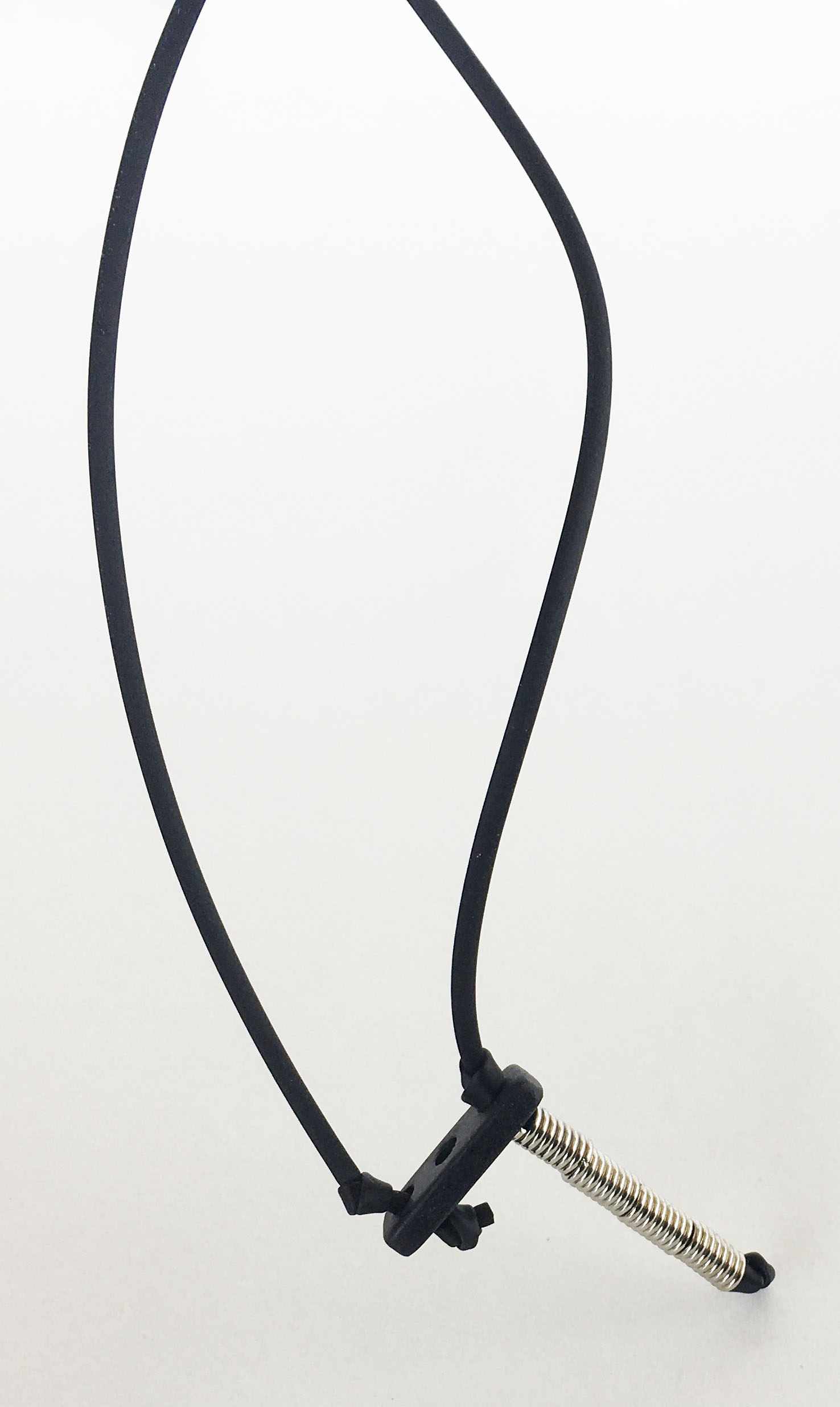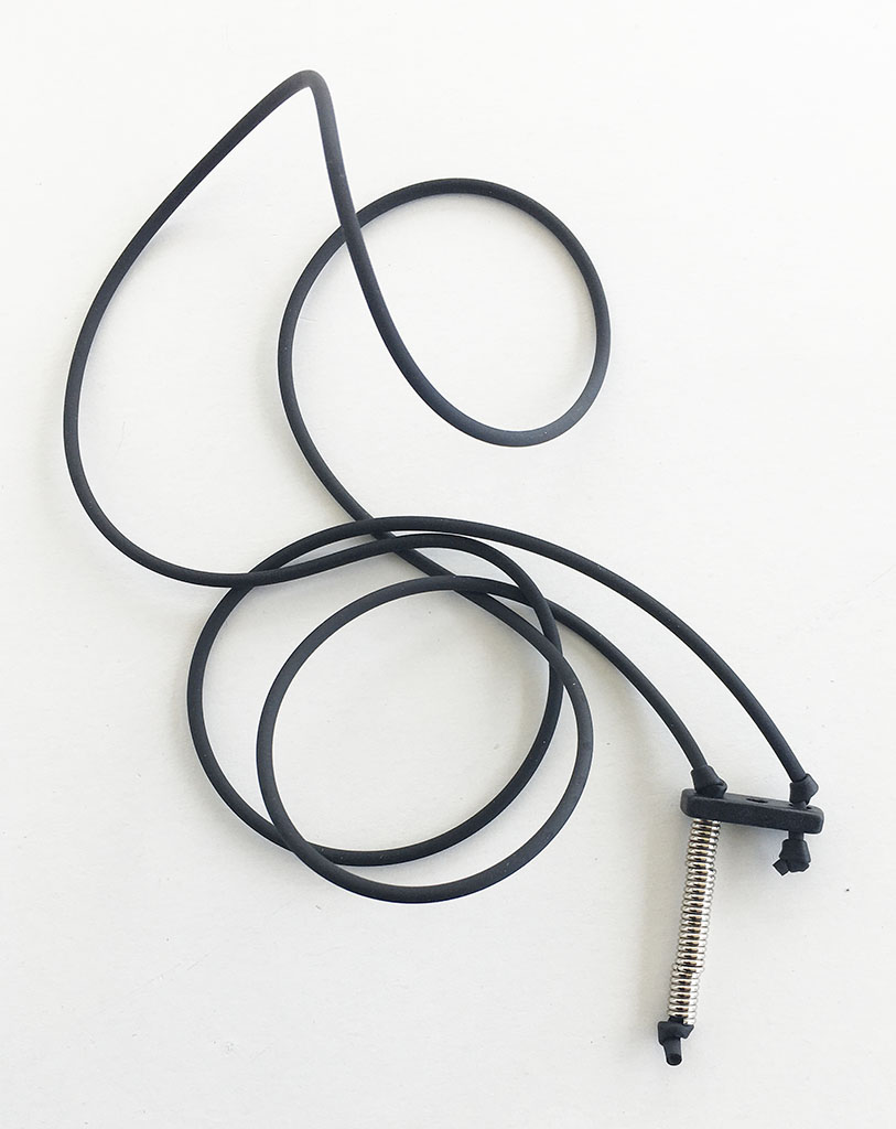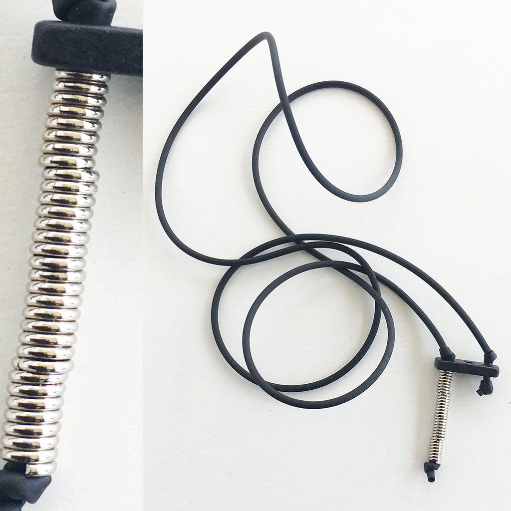 υλικά: 2 χιλ. μαύρο καουτσούκ, 3 χιλ. x 6 χιλ. ανάγλυφη μεταλλική χάντρα σχήμα σωλήνα, 2 χιλ. X 1,8 εκ. χάντρα από πηλό σε μαύρο χρώμα