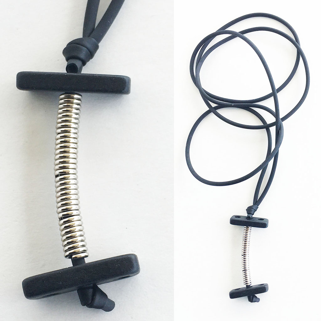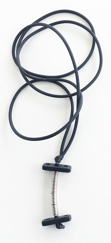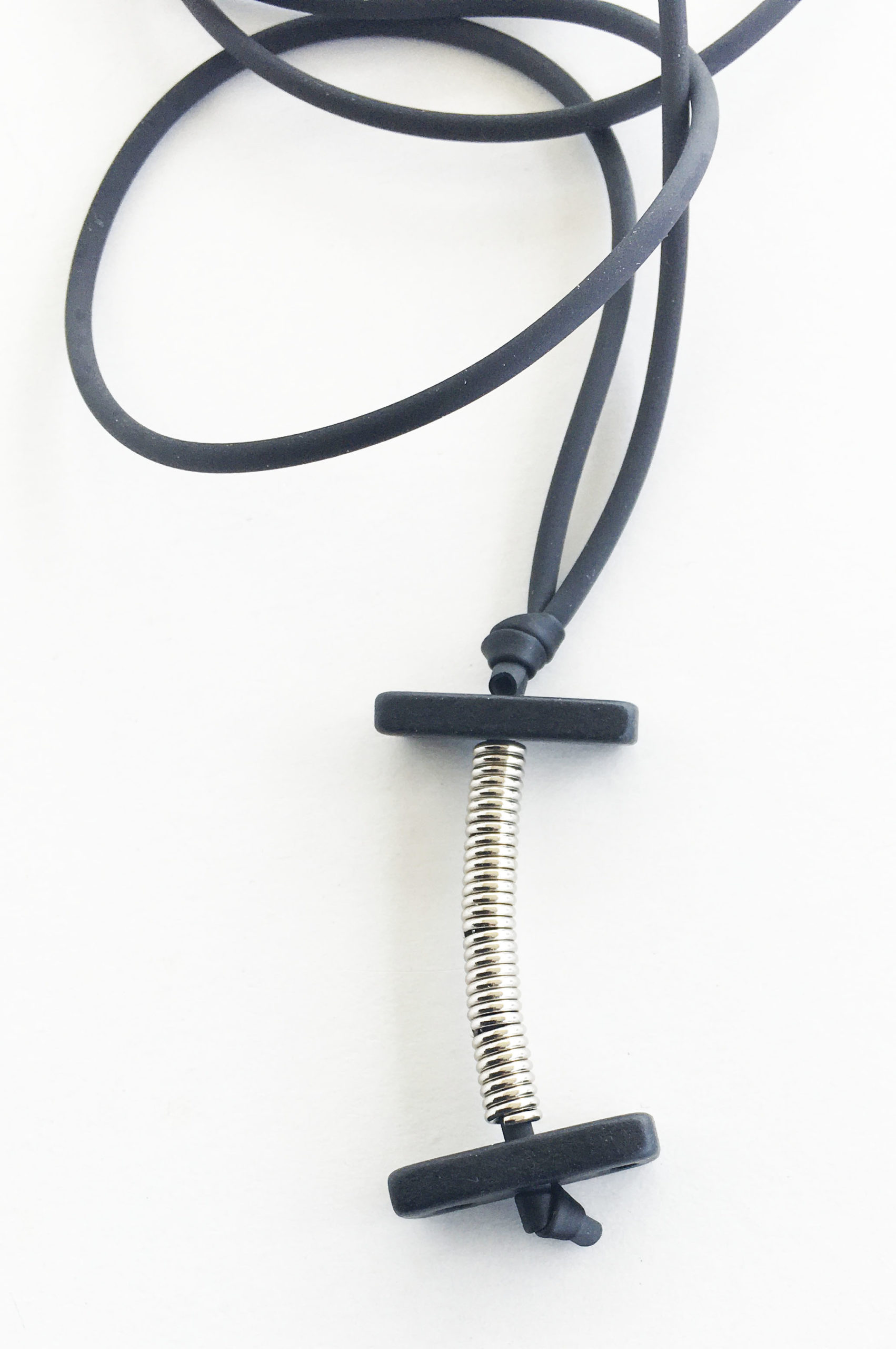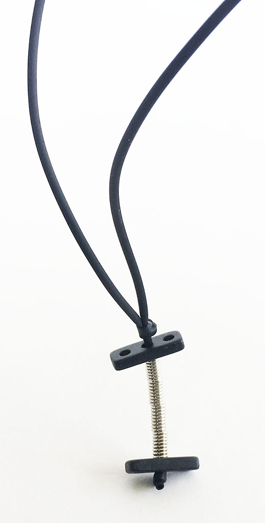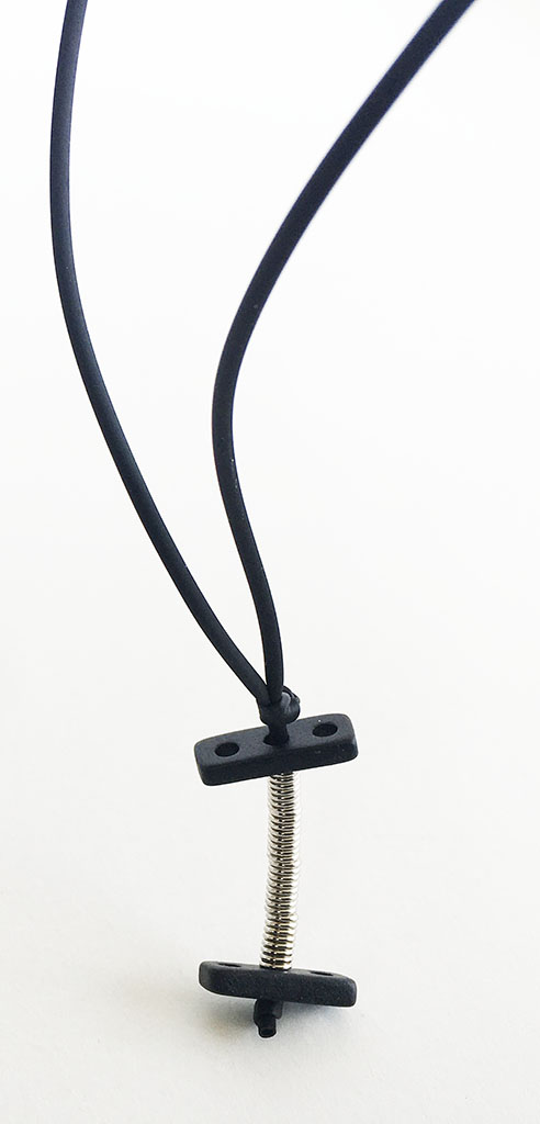υλικά: 2 χιλ. μαύρο καουτσούκ, 3 χιλ. x 6 χιλ. ανάγλυφη μεταλλική χάντρα σχήμα σωλήνα, 2 χιλ. X 1,8 εκ. χάντρα από πηλό σε μαύρο χρώμα