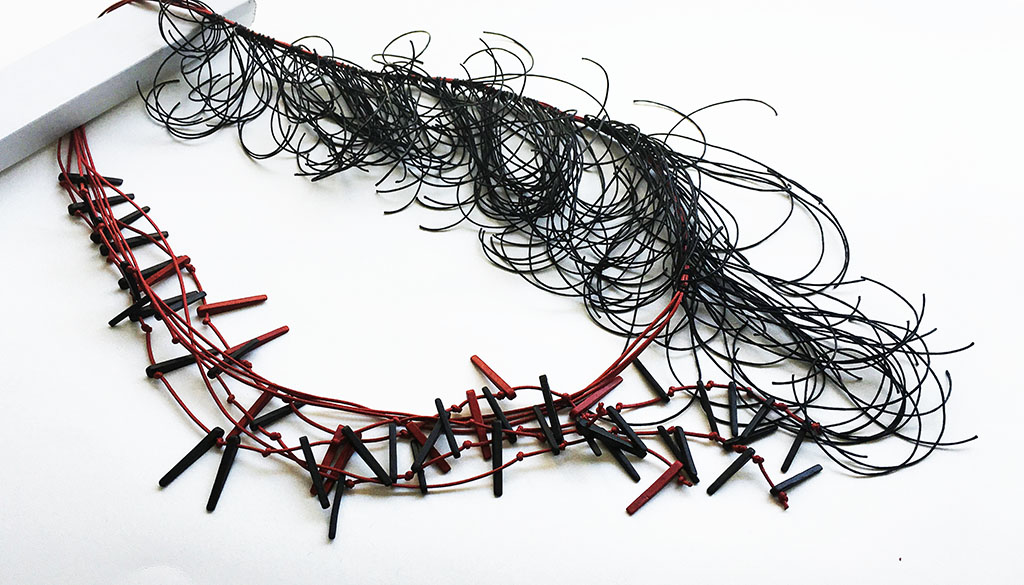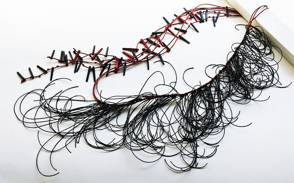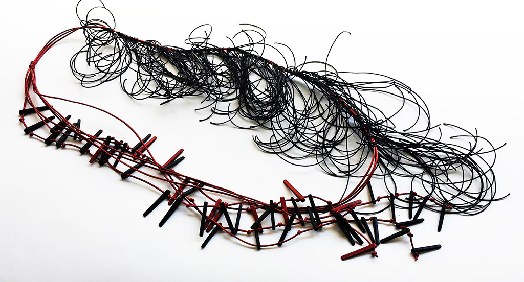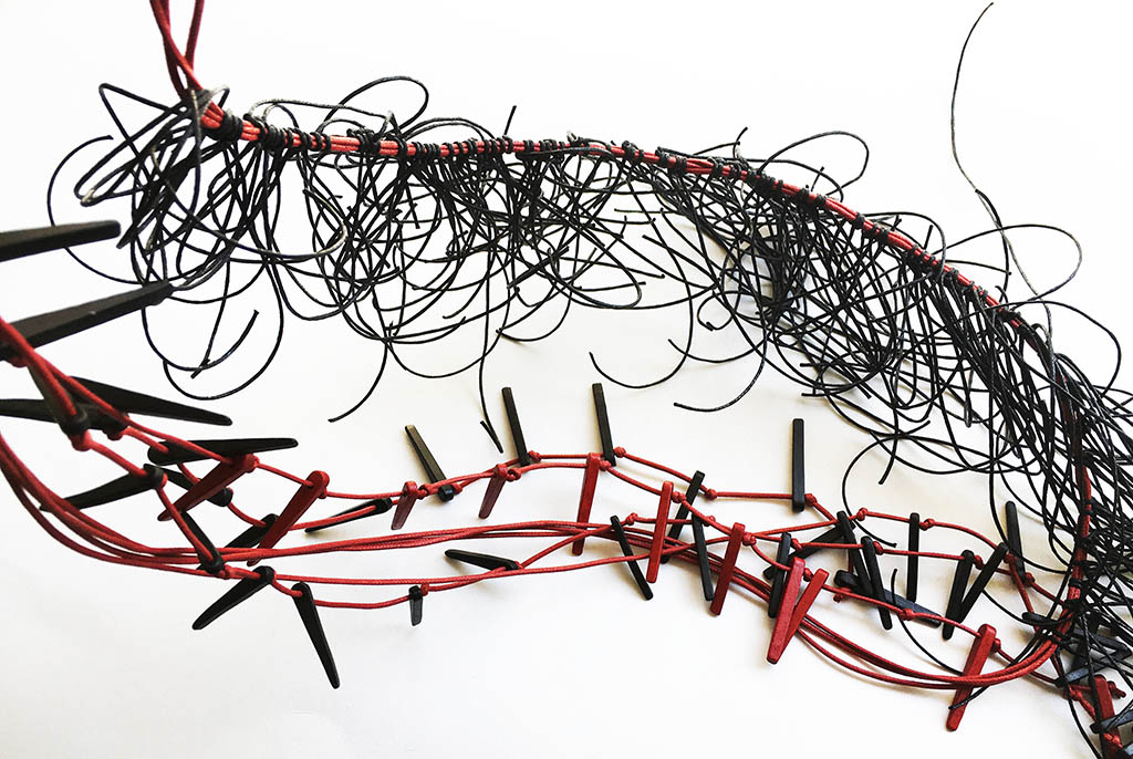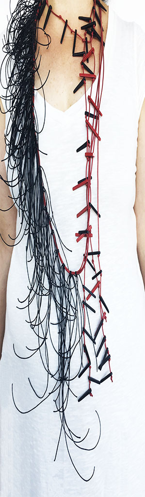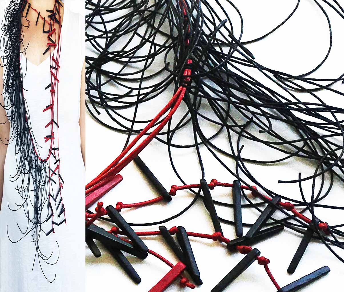υλικά: 3 χιλ. x  2,2 εκ. χάντρες από πηλό και βαμβακερά σχοινιά σε 2 χιλ. κόκκινο και 1 χιλ. μαύρο χρώμα