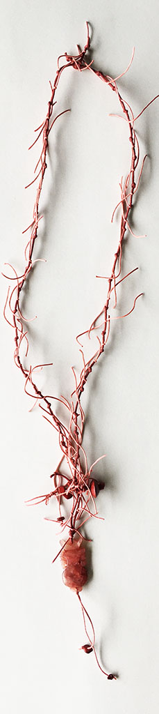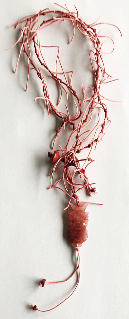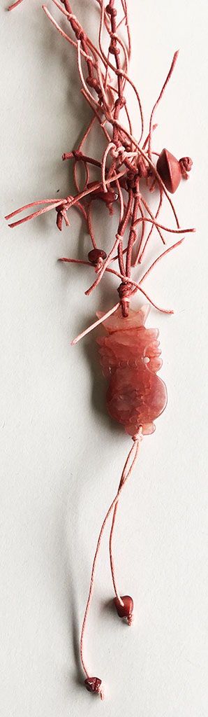 υλικά: 1 εκ. x 1,2 εκ. ξύλινη χάντρα με σχήμα ρόμβος σε φούξια σκούρο χρώμα, 5 χιλ. τετράγωνη χάντρα από πηλό σε φούξια σκούρο χρώμα, 2 χιλ. γυάλινες χάντρες σε φούξια σκούρο χρώμα, πλάτος 4,9 εκ. x ύψος 2,4 εκ. x πάχος: 5 χιλ.. ειδώλιο από πέτρα σε φούξια αποχρώσεις, 1 χιλ./2 χιλ. βαμβακερό σχοινί σκούρο και ανοιχτό φούξια