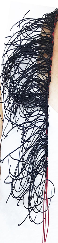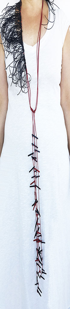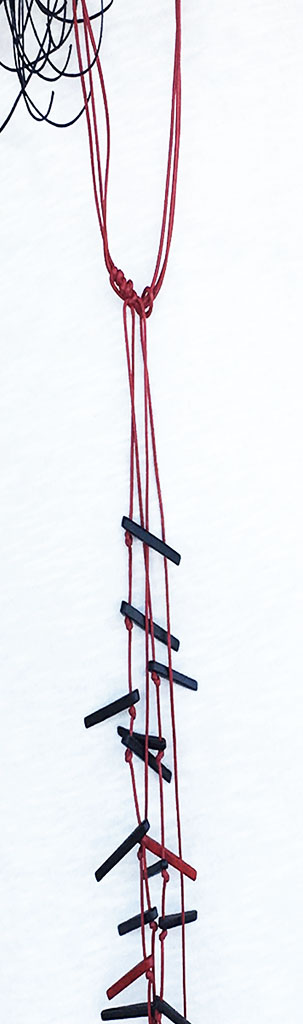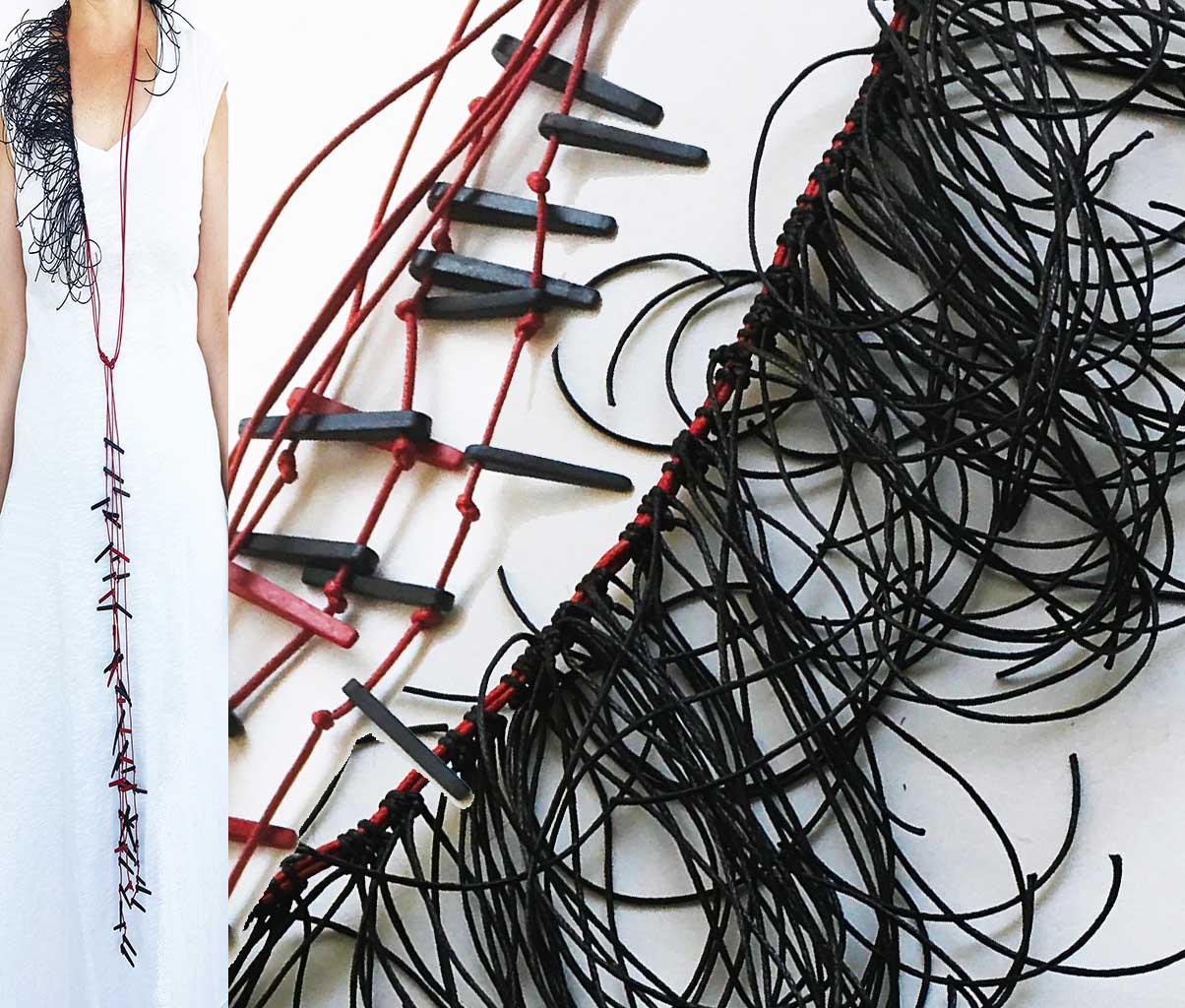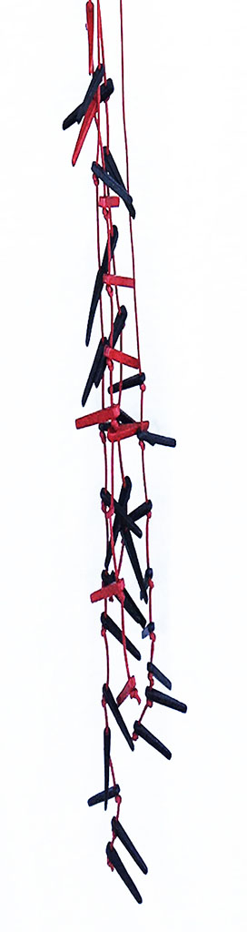 υλικά: 3 χιλ. x 2,2 εκ. χάντρες από πηλό και βαμβακερά σχοινιά σε 2 χιλ. κόκκινο και 1 χιλ. μαύρο χρώμα