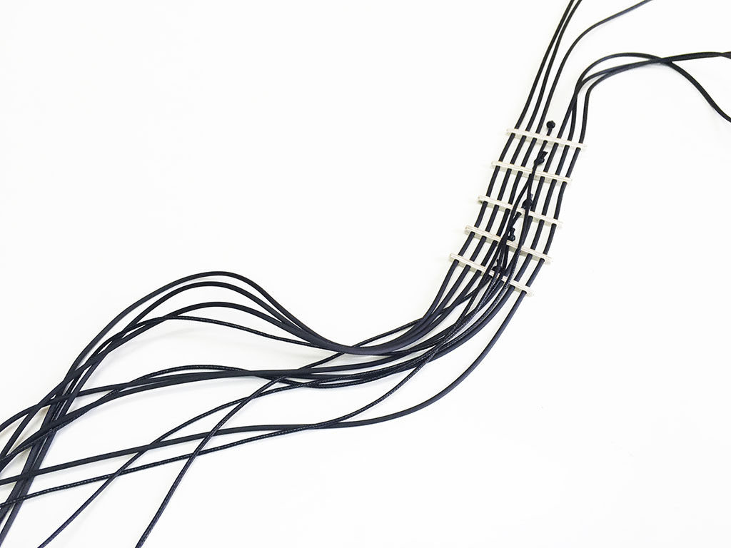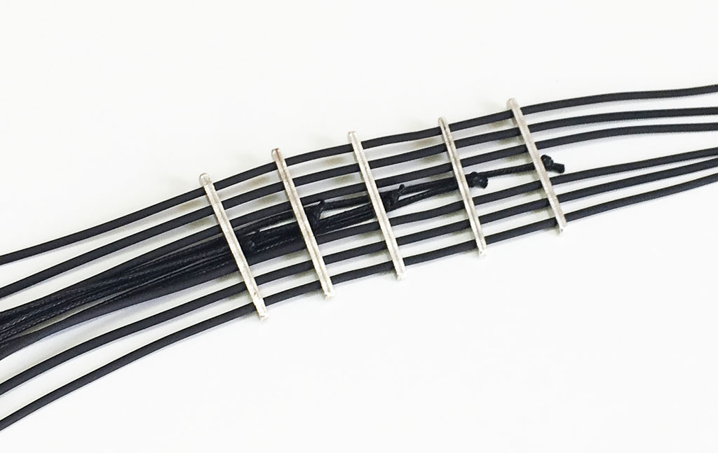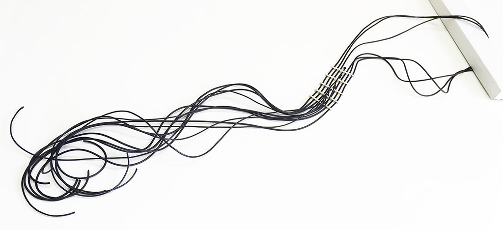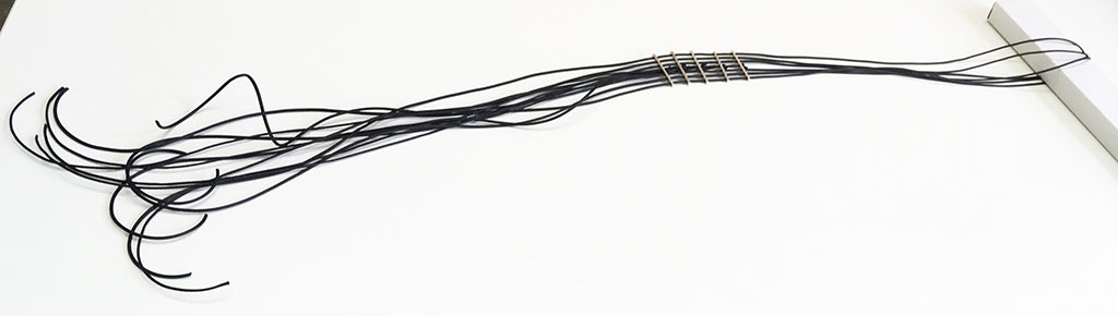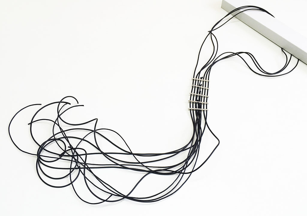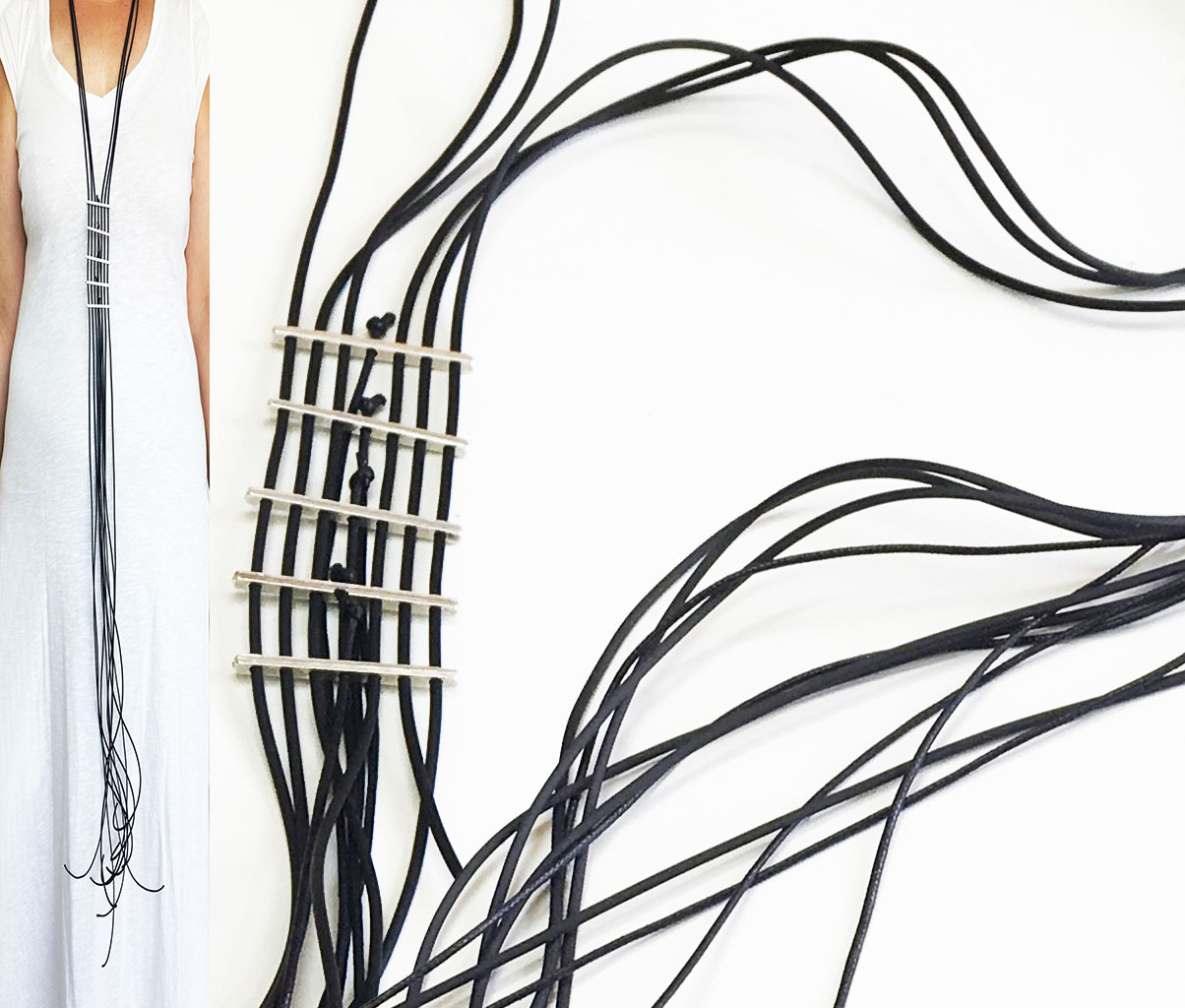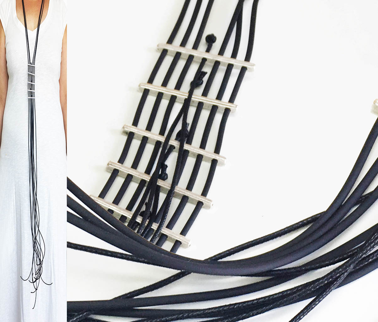 υλικά: 5 μεταλλικές χάντρες σε σχήμα ράβδους, καουτσούκ και βαμβακερό σχοινί σε μαύρο χρώμα
