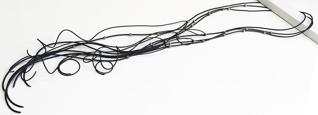 υλικά: 5 χιλ. x 6 χιλ. μεταλλικές ανάγλυφες χάντρες, 2 χιλ./3χιλ. μαύρο καουτσούκ