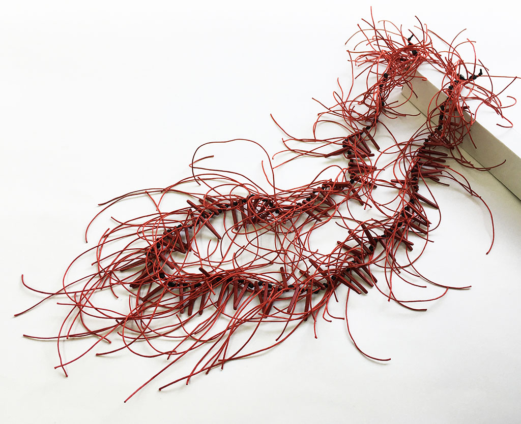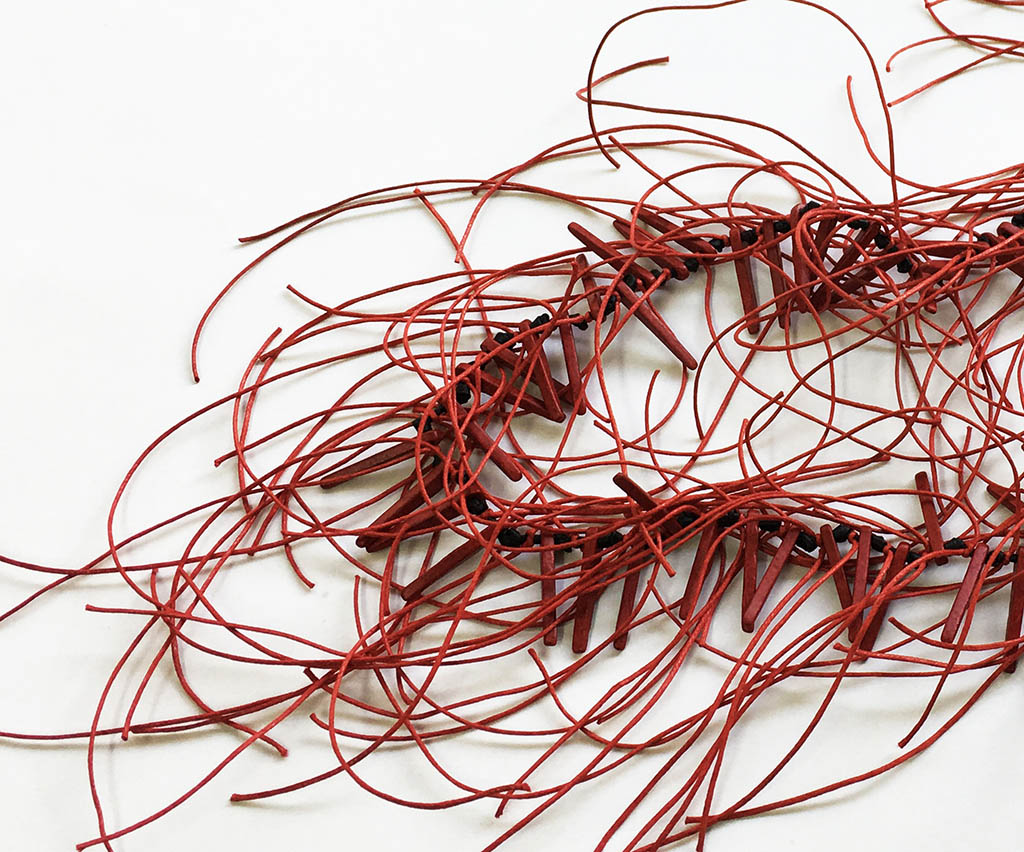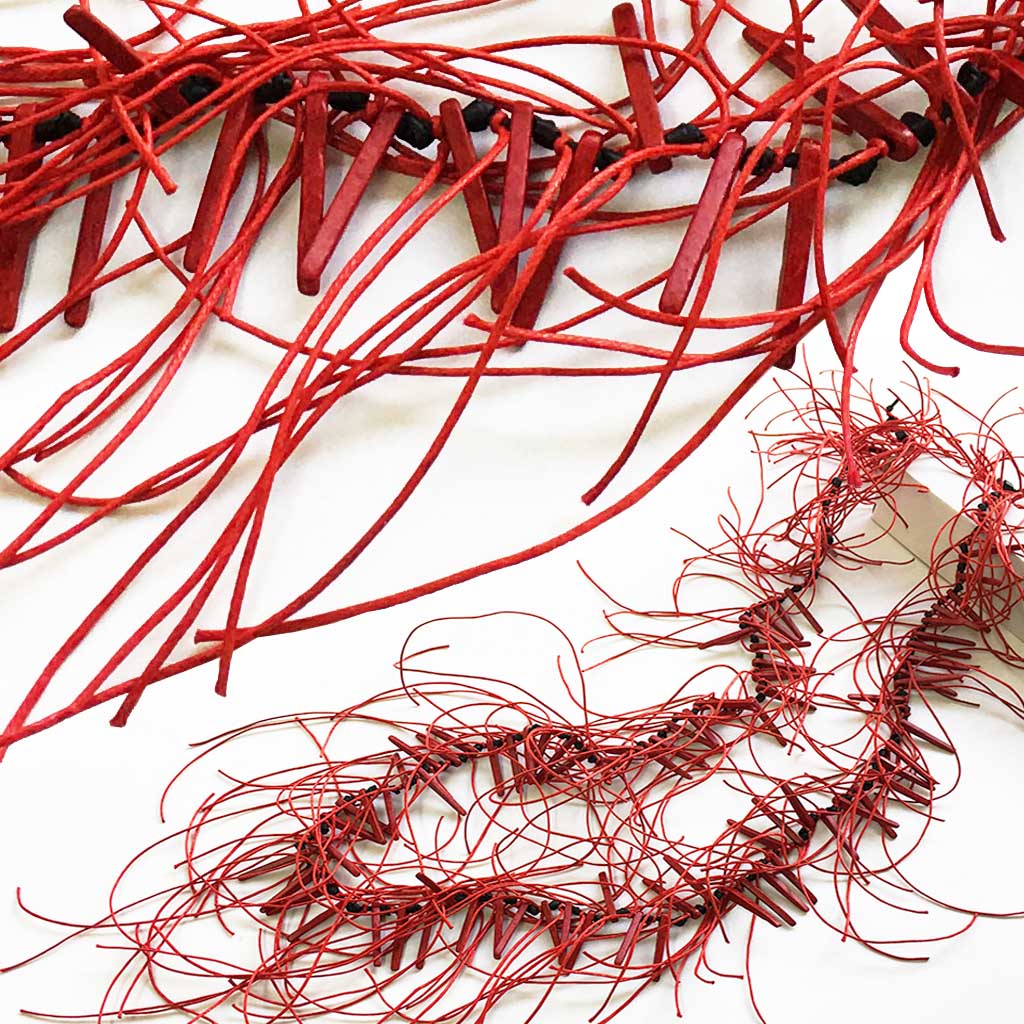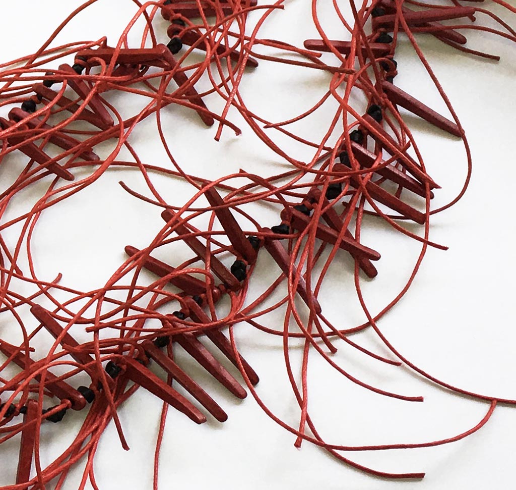 υλικά/πάχος: 3 χιλ. x 3 εκ. χάντρες από πηλό σε κόκκινο χρώμα, 5 χιλ. χάντρες από πηλό σε μαύρο χρώμα, 1 χιλ. βαμβακερό σχοινί σε κόκκινο χρώμα, 2 χιλ. μαύρο καουτσούκ