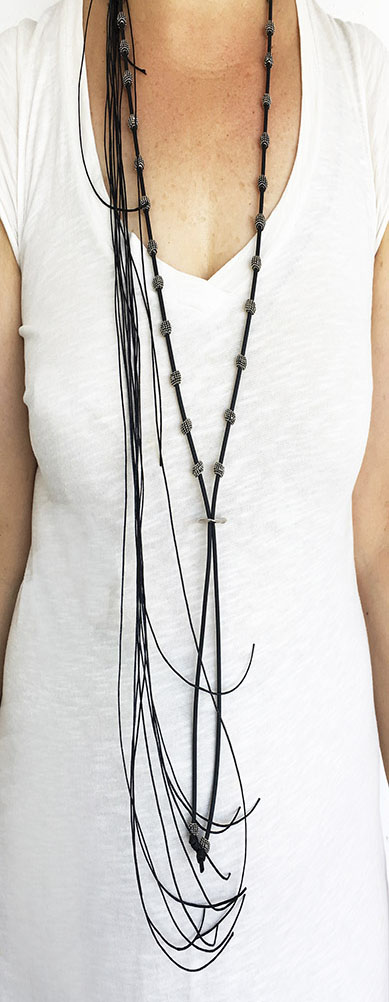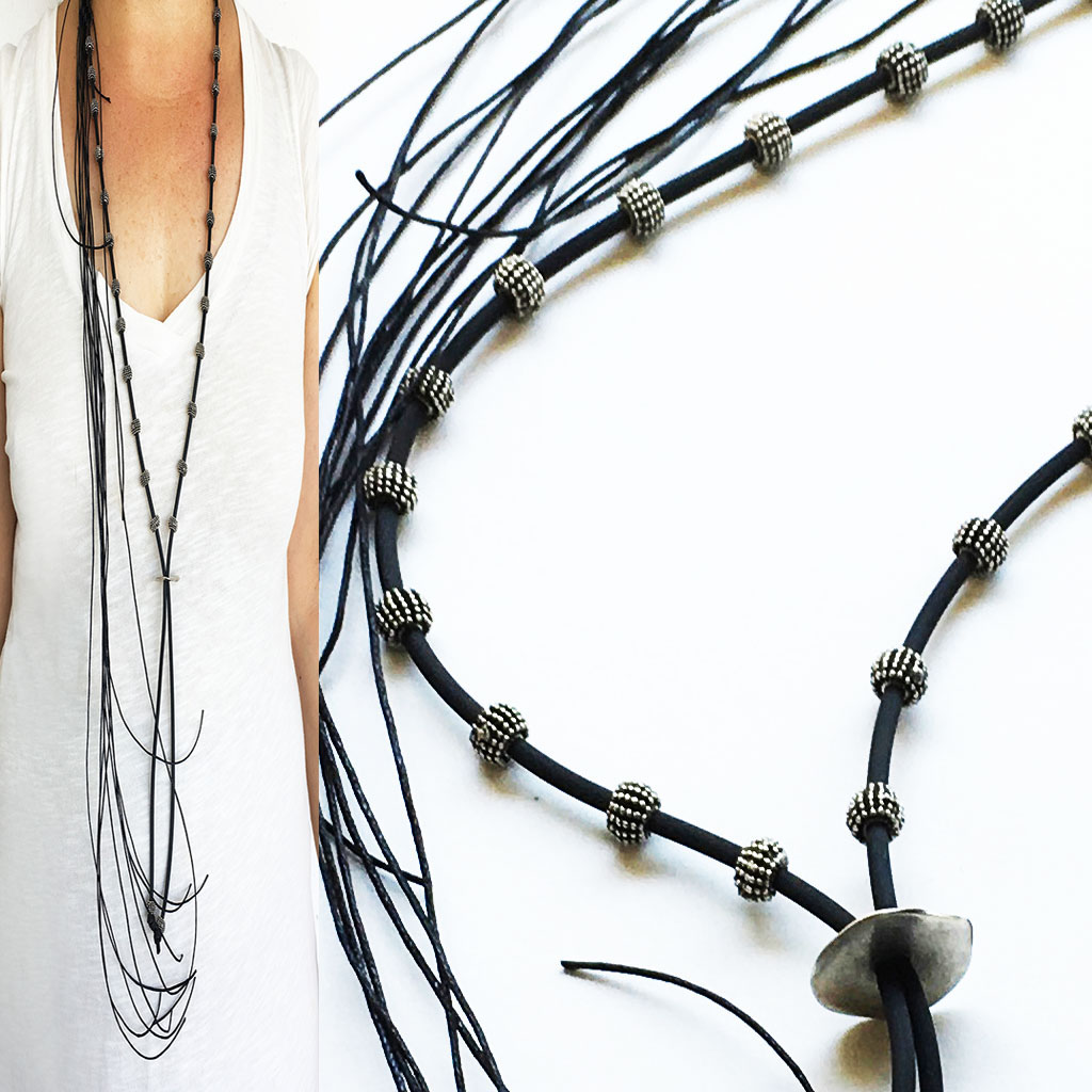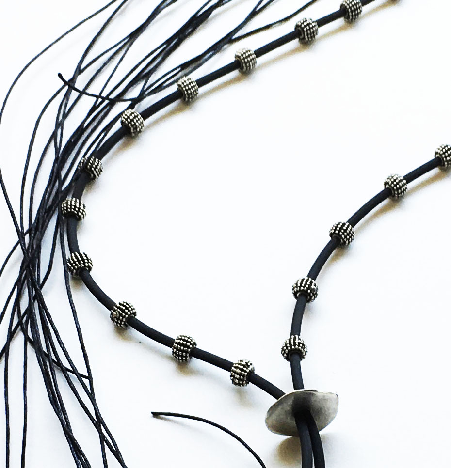υλικά: 5 χιλ. x 6 χιλ. ανάγλυφες μεταλλικές χάντρες, 0,5 χιλ. x 2,2 εκ. μεταλλική χάντρα σχήμα ροδέλας, 3 χιλ. καουτσούκ και 2 χιλ. βαμβακερό σχοινί σε μαύρο χρώμα
