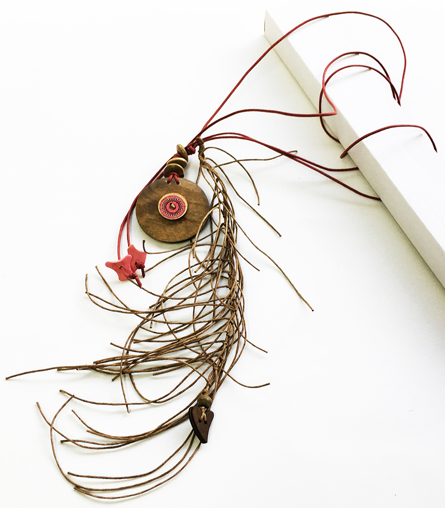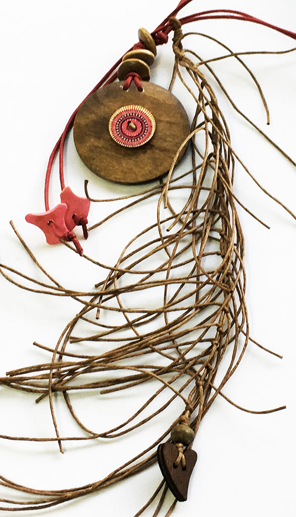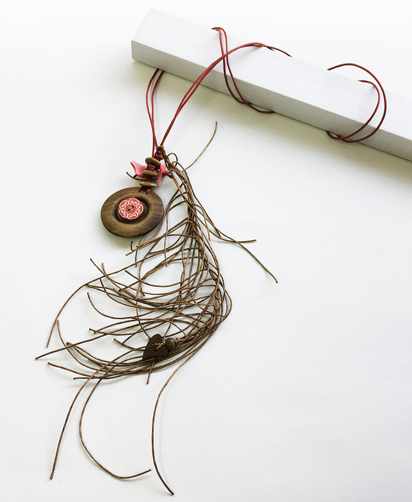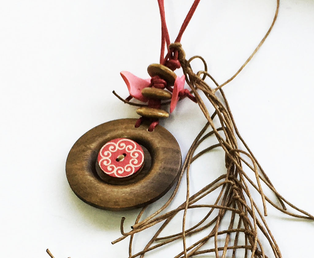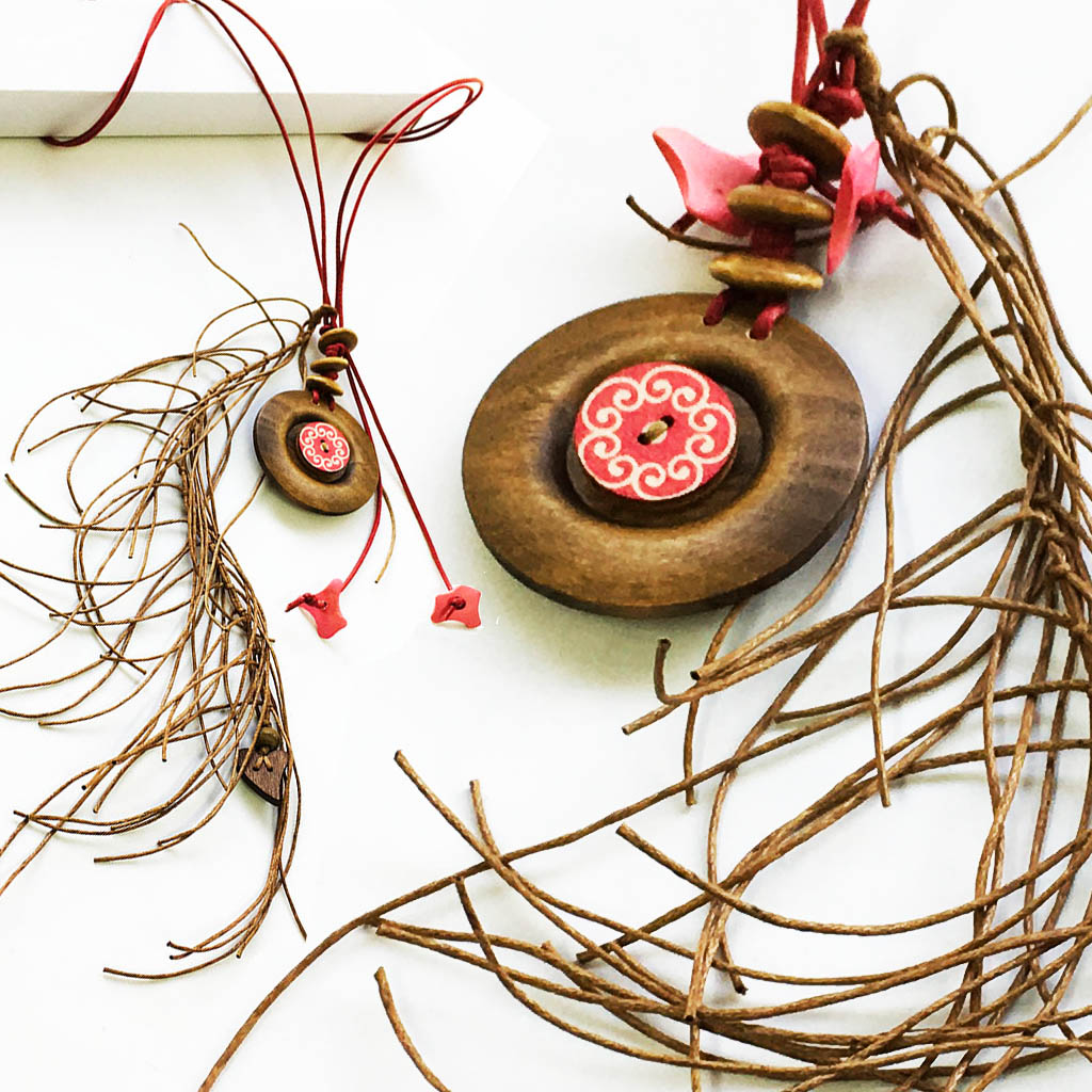 υλικά/πάχος: 3 χιλ. ξύλινες χάντρες σχήμα, 2 χιλ. x 1,8 εκ. διάμετρος ξύλινα κουμπιά με σχέδια σε διάφορα χρώματα, 3 χιλ. x 5 εκ. διάμετρο ξύλινο κουμπί σε καφέ χρώμα, 1 χιλ./2 χιλ. βαμβακερά σχοινιά σε γήινες αποχρώσεις και σκούρο φούξια χρώμα, 1 χιλ. ξύλινες χάντρες σε χρώμα ανοιχτό φούξια