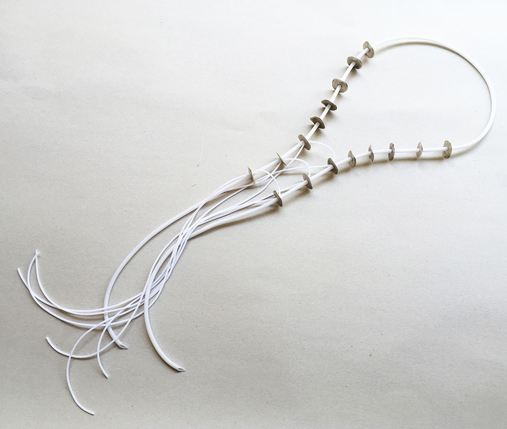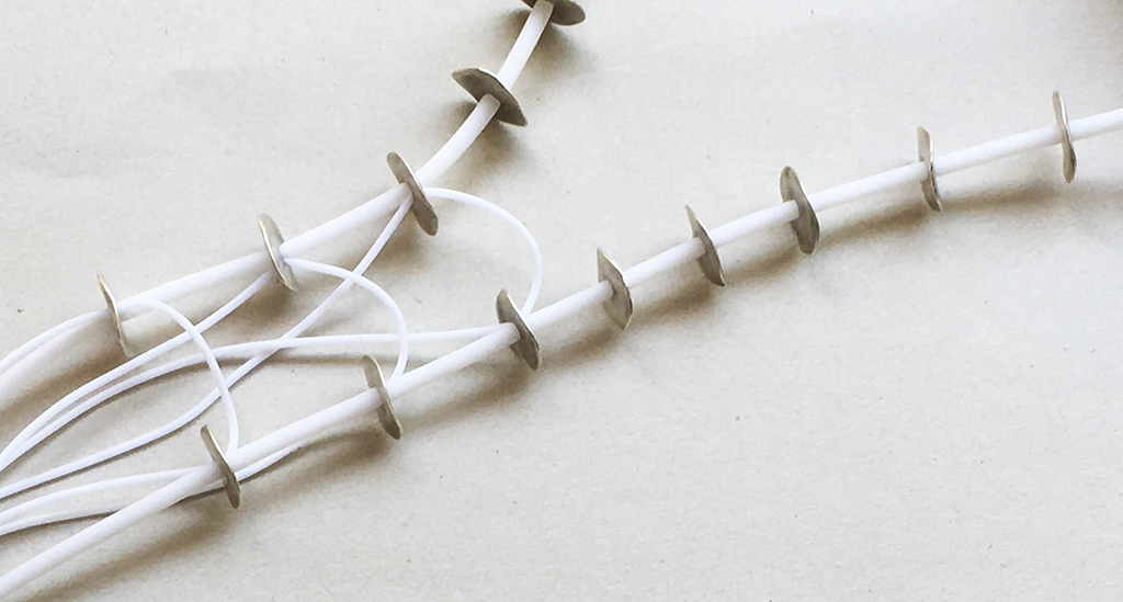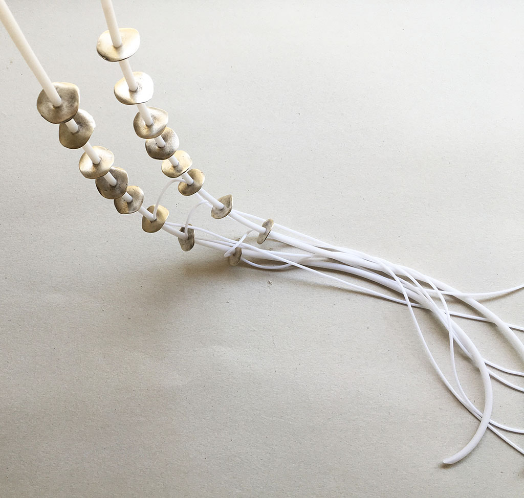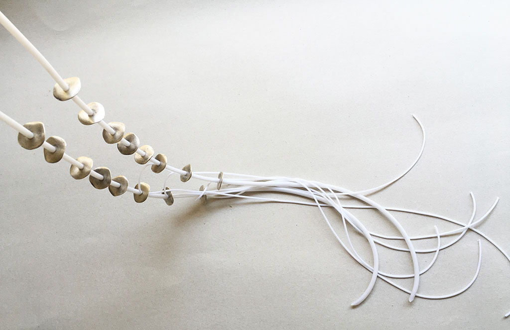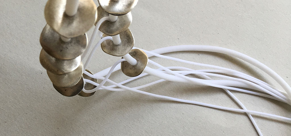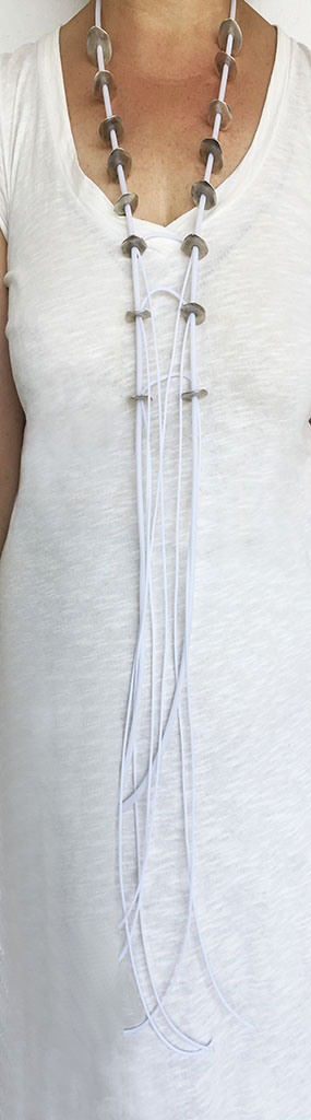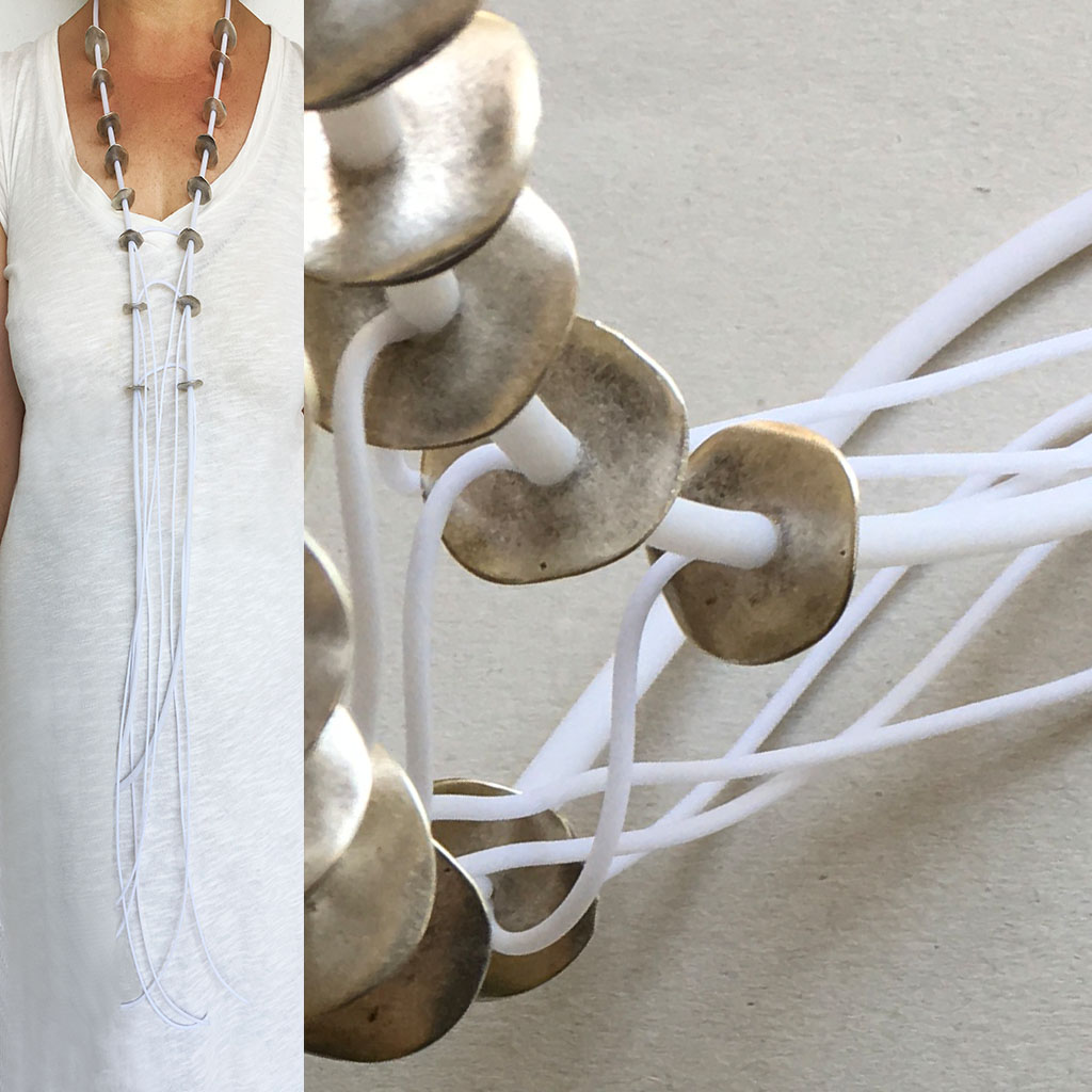 υλικά/πάχος: 2,2 εκ. διάμετρος με πάχος 0,5 χιλ /16 μεταλλικές χάντρες σε σχήμα ροδέλας, 2 χιλ./4 χιλ. άσπρο καουτσούκ