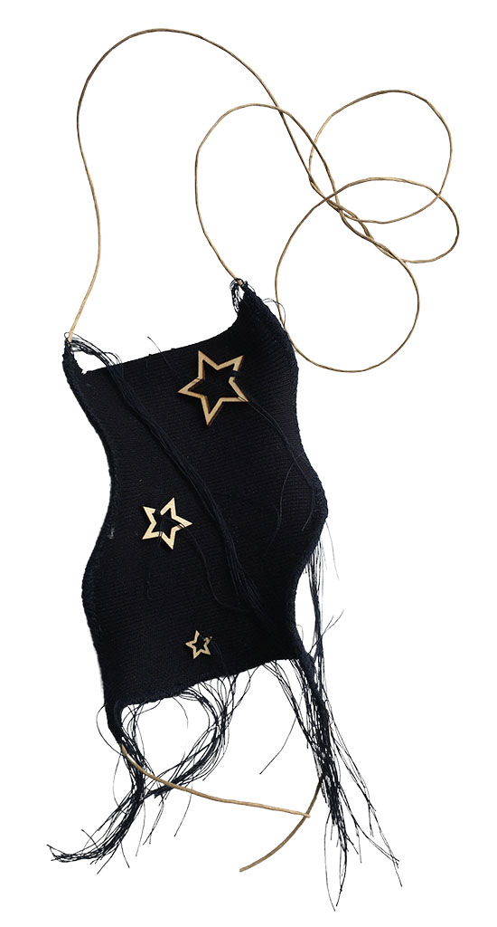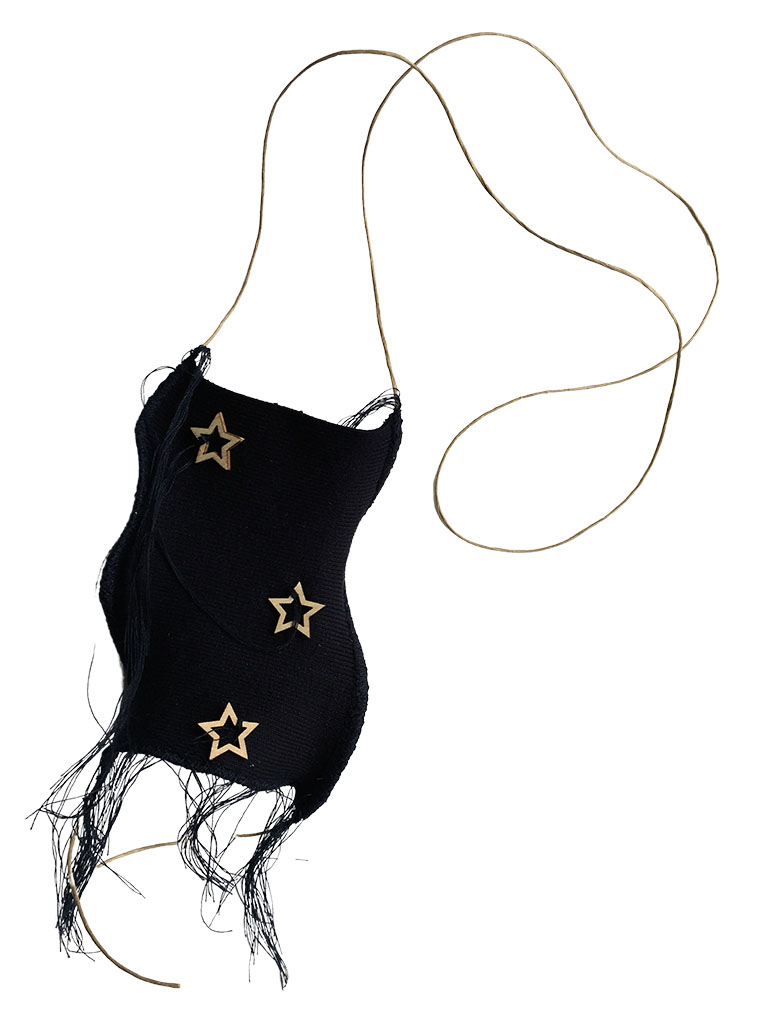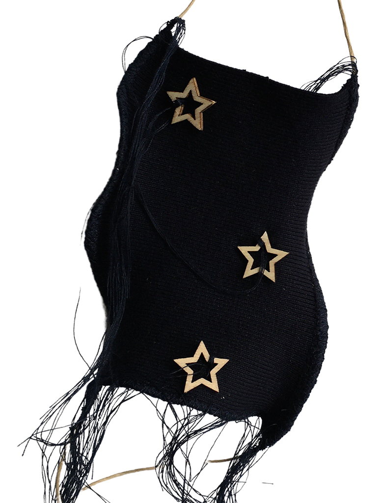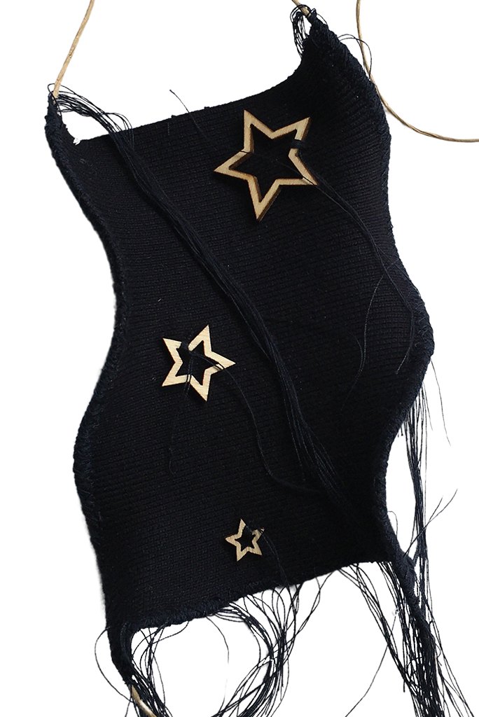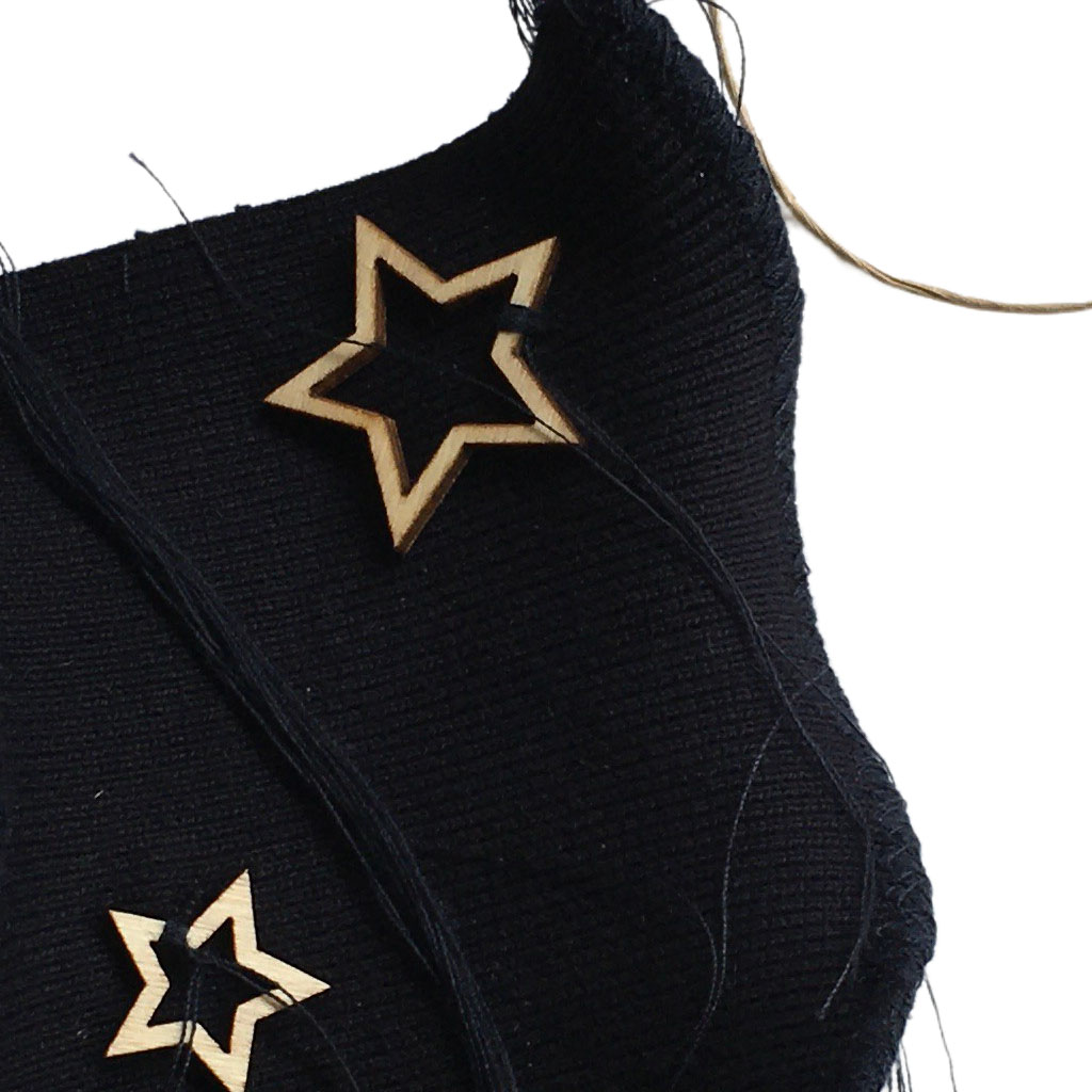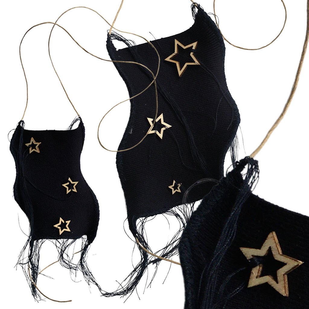 υλικά: ύφασμα σε μπλε χρώμα 13 εκ x 9 εκ., ξύλινες χάντρες 0,9/1,5/2,5 εκ, χρώμα του ξύλου, σχοινί από χόρτο 1 χιλ, μπλε βαμβακερή κλωστή