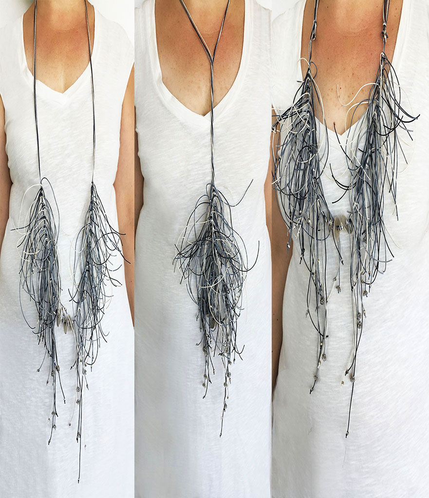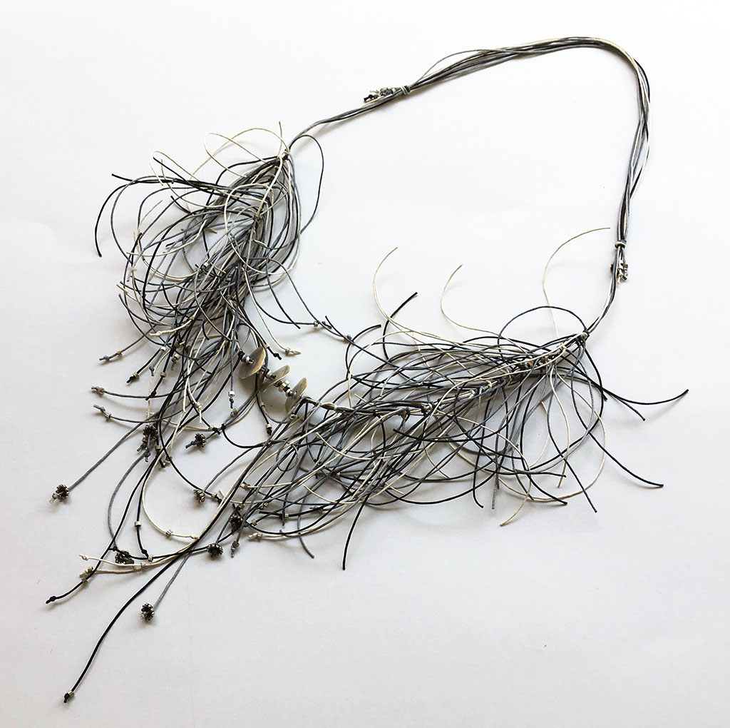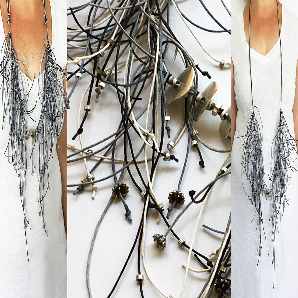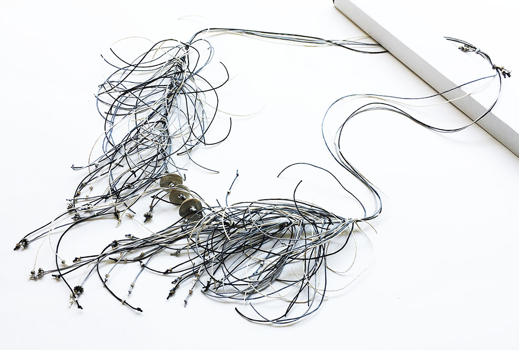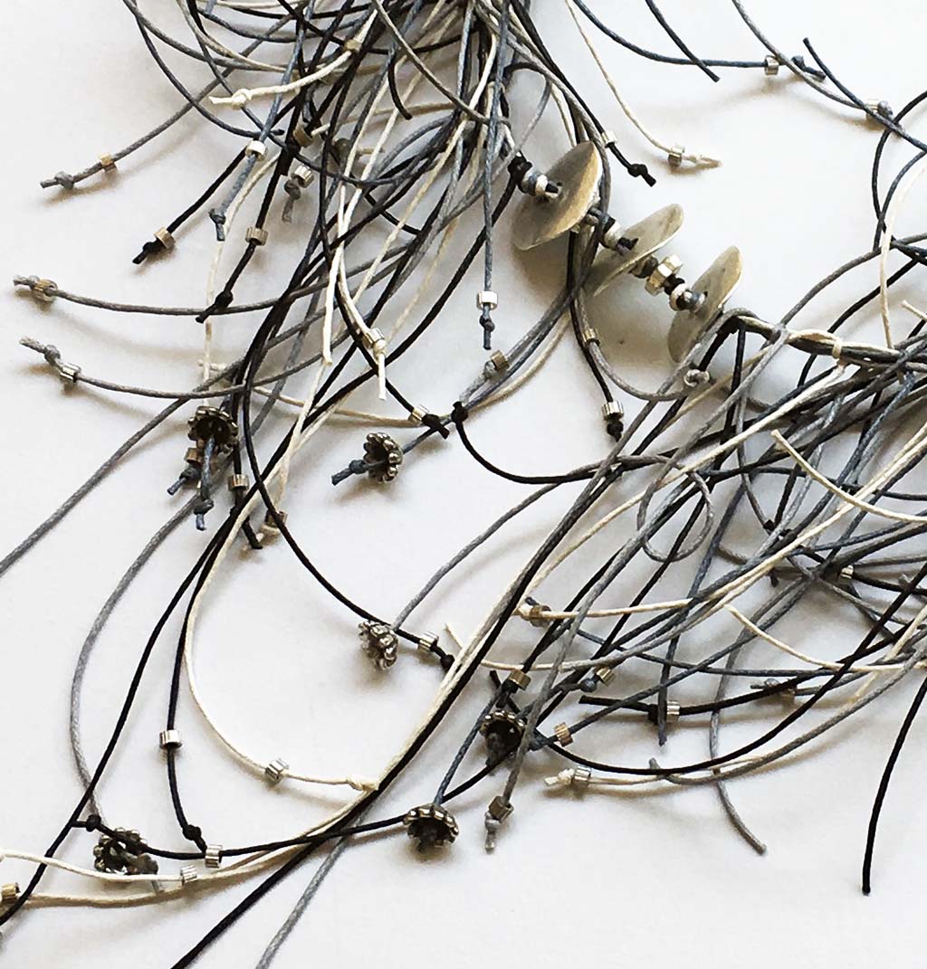 υλικά/πάχος: 0,5 εκ. x 2,2 εκ. διάμετρος-ροδέλα/6 χιλ. διάμετρος x 4 εκ.-λουλούδι/3 χιλ. x 2 χιλ. διάμετρος-σωλινάκι μεταλλικές χάντρες, 3 χιλ. x 6 χιλ. χάντρα από επαργυρωμένο πηλό, 1 χιλ. βαμβακερά σχοινιά σε γκρι, εκρού, μαύρο