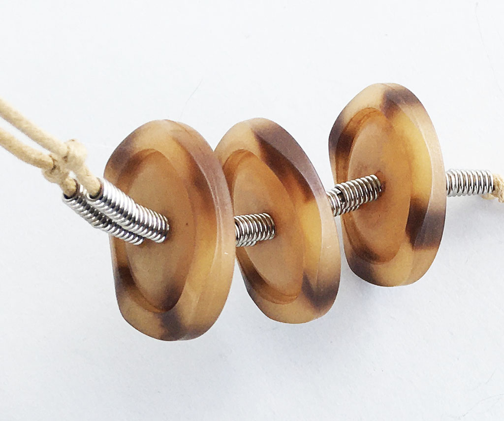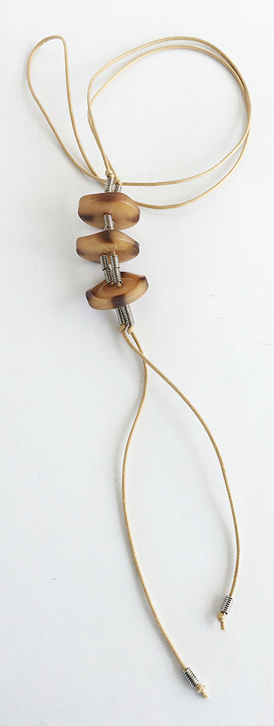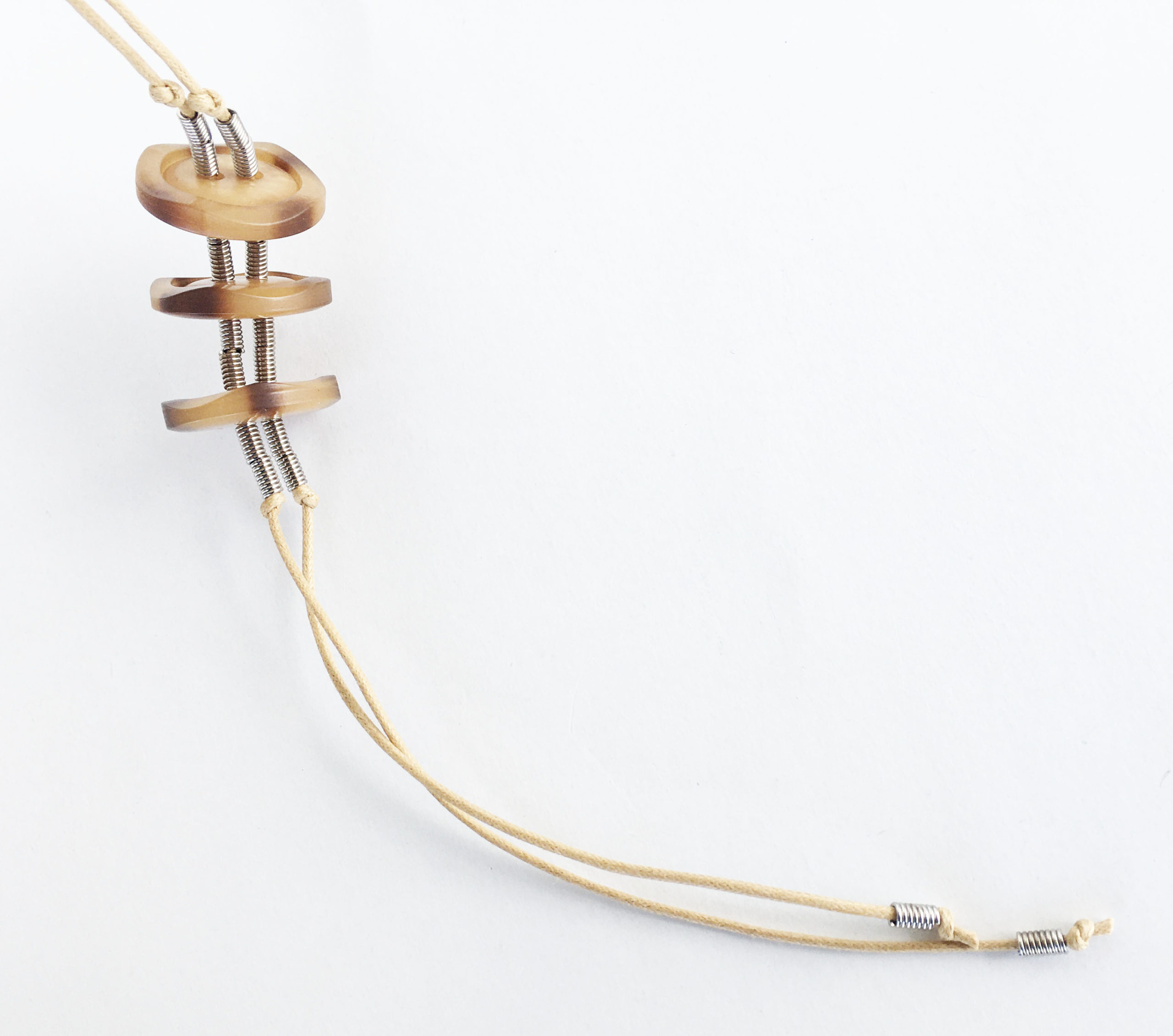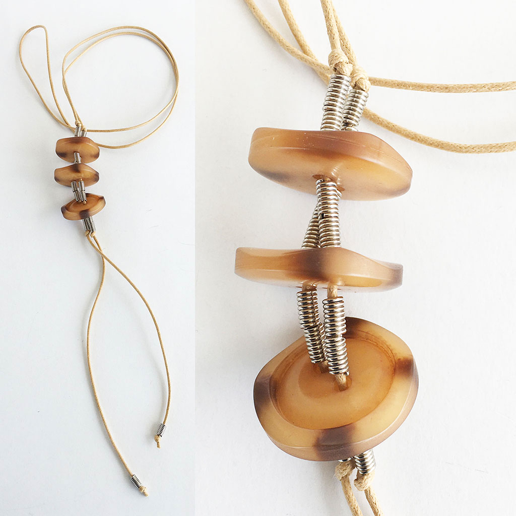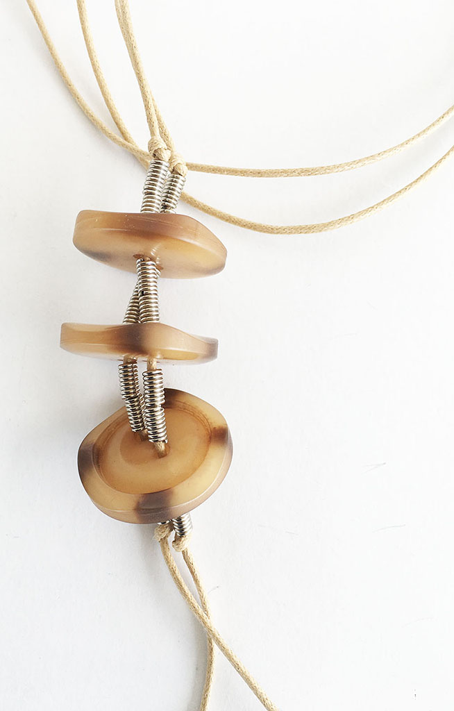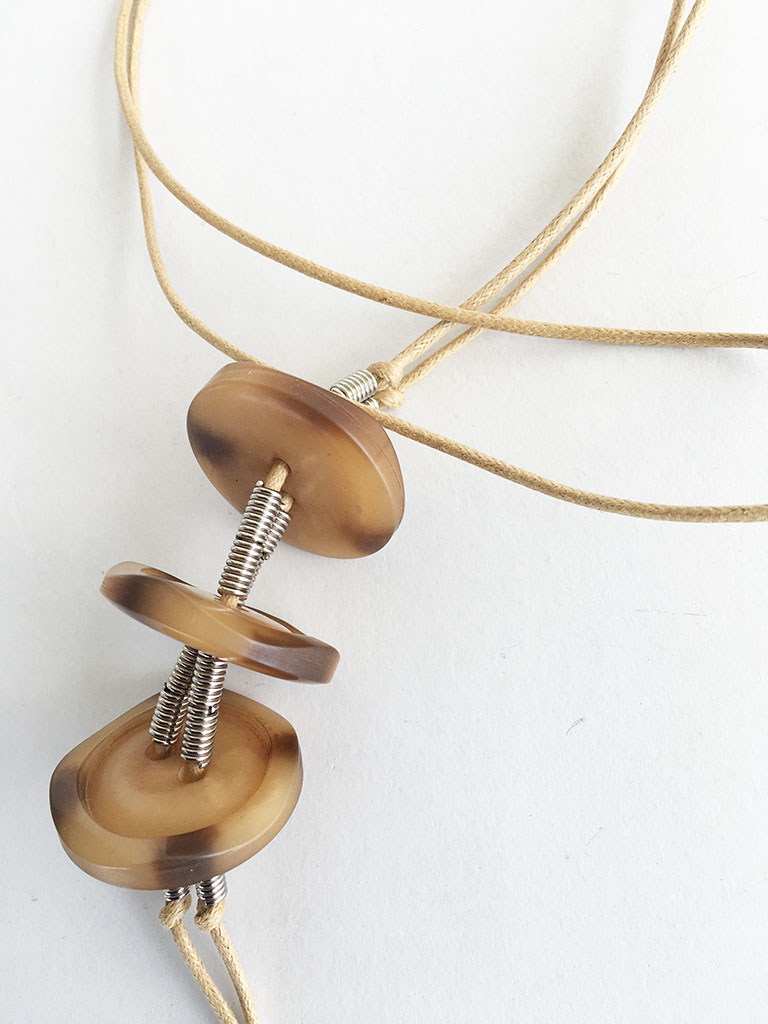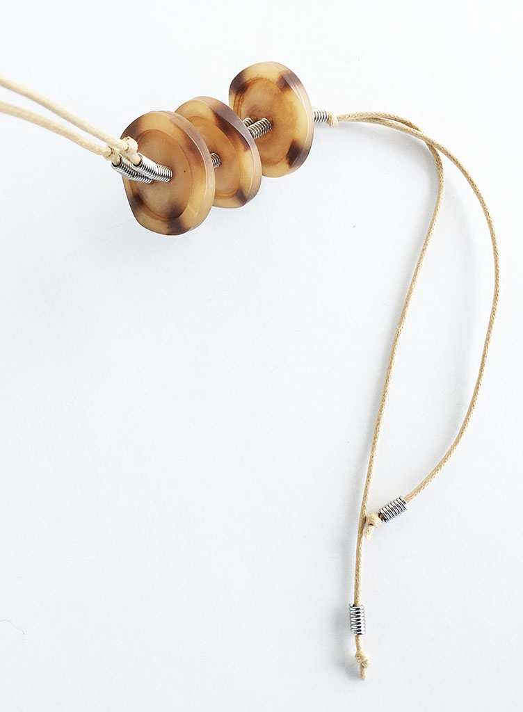 υλικά: 2 χιλ. βαμβακερό σχοινί σε χρώμα μπεζ, 3 χιλ. x 6 χιλ. ανάγλυφη μεταλλική χάντρα σχήμα σωλήνα, 4 χιλ. x 3 εκ. διάμετρο συνθετικά κουμπιά σε καφέ αποχρώσεις