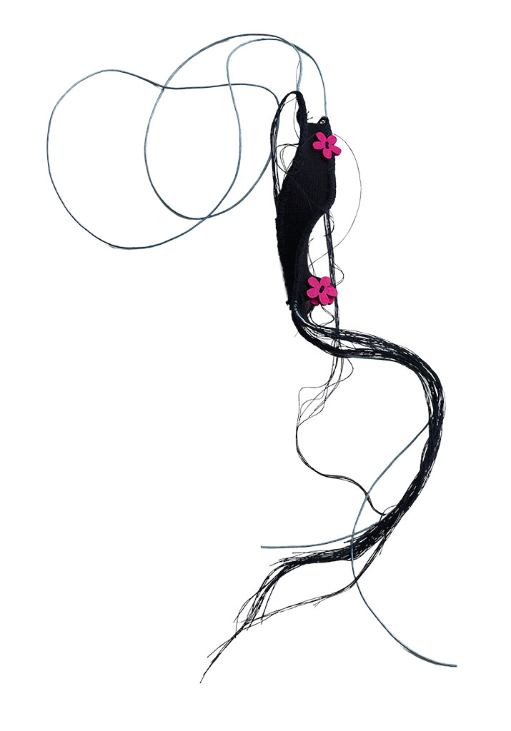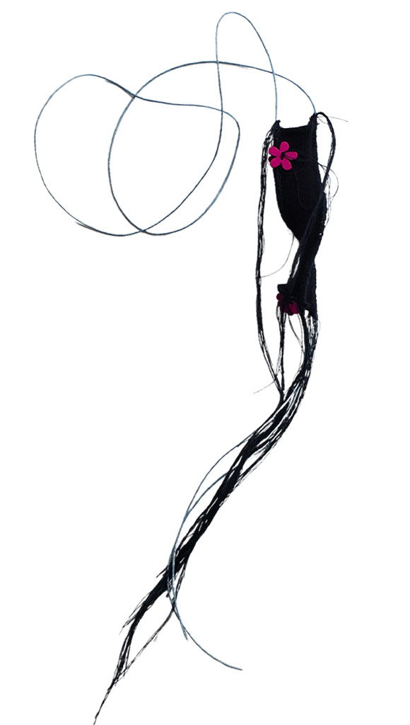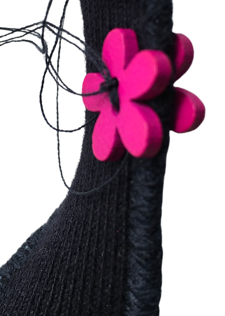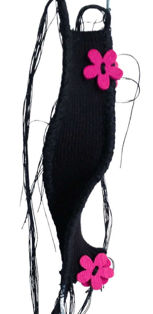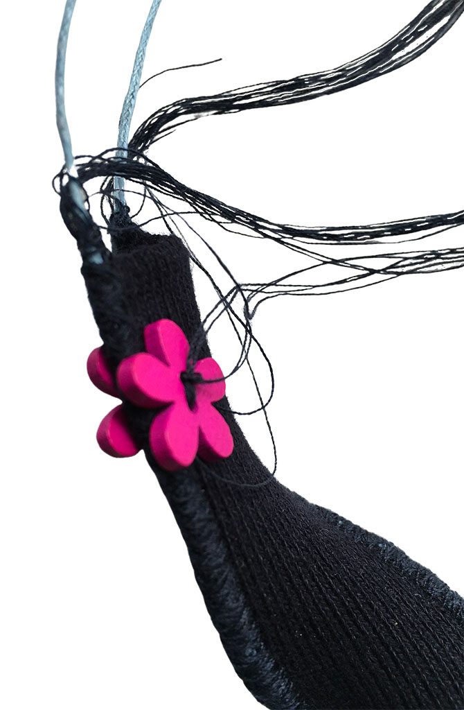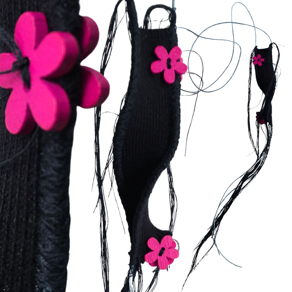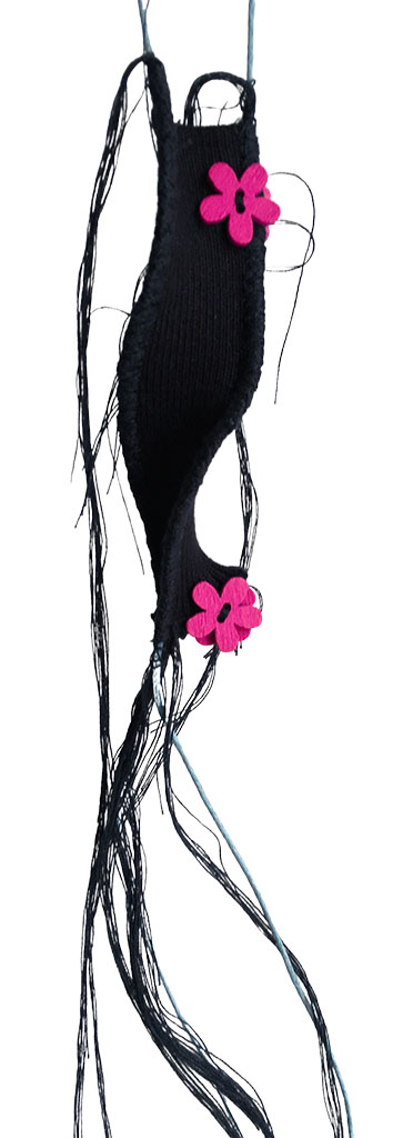 υλικά: ύφασμα σε μπλε χρώμα 2,5 εκ x 10 εκ, 4 ξύλινεςφούξια χάντρες1 εκ σχήμα λουλούφι, , βαμβακερό γαλάξιο σχοινί 1 χιλ, μπλε βαμβακερή κλωστή