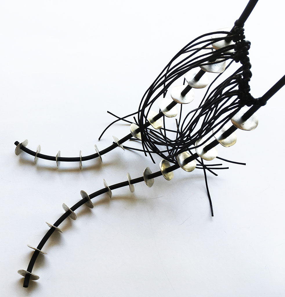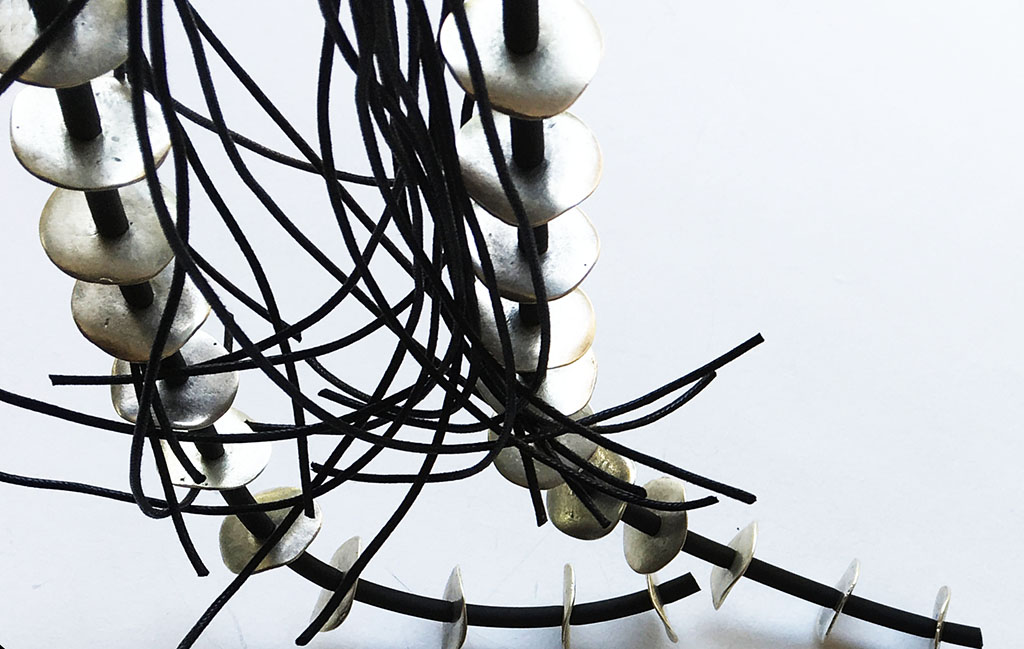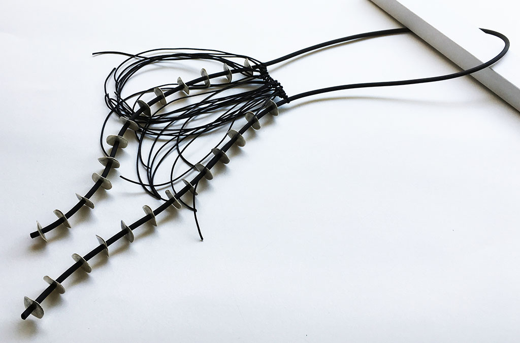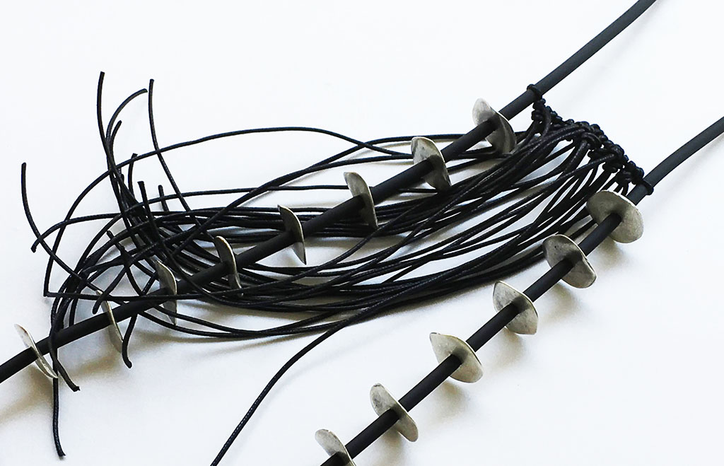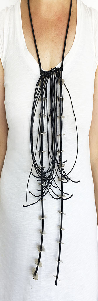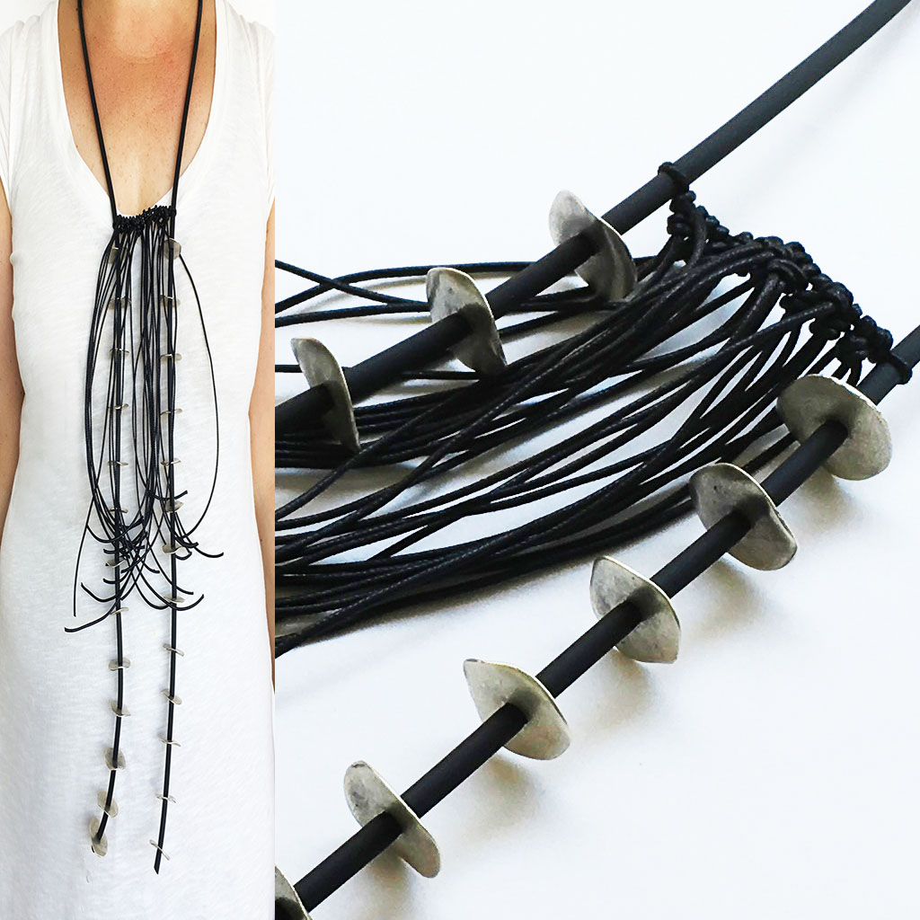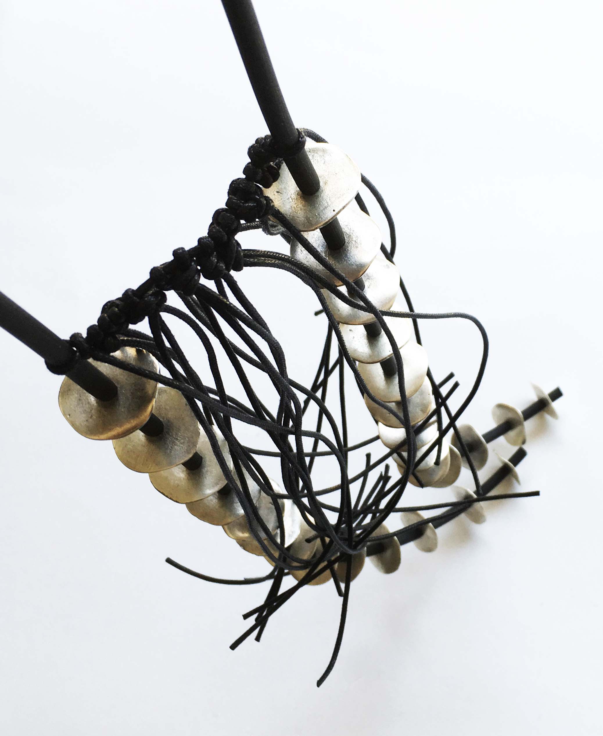 υλικά/πάχος: 0,5 χιλ. x 2,2 εκ. μεταλλικές χάντρες σε σχήμα ροδέλας, 4 χιλ. μαύρο καουτσούκ, 2 χιλ. βαμβακερό σχοινί σε μαύρο χρώμα