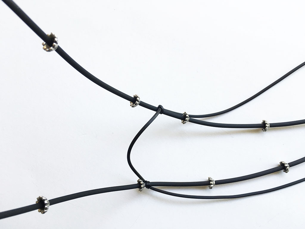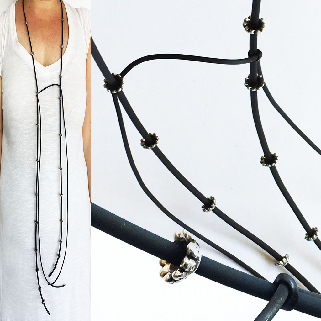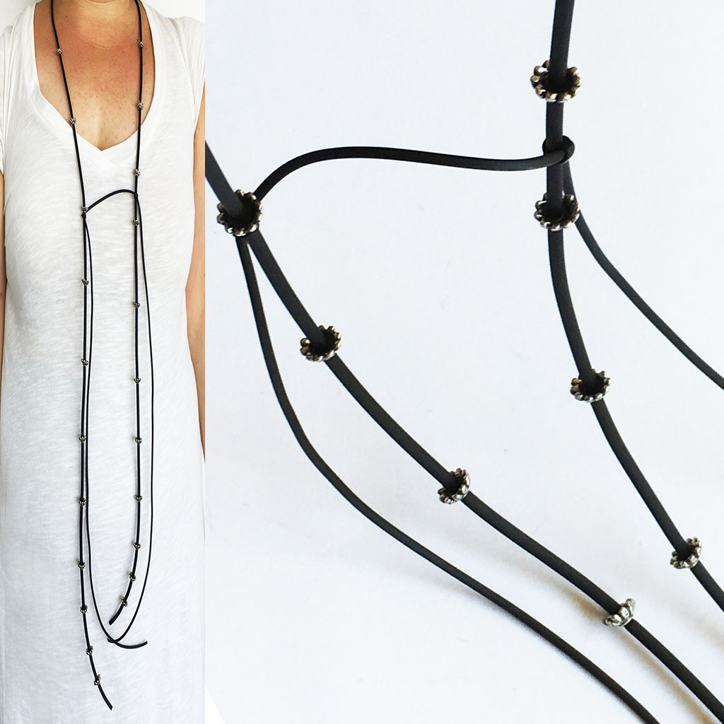 υλικά/πάχος: 5 χιλ. x 8 χιλ. διάμετρος ανάγλυφες μεταλλικές χάντρες σε σχέδιο λουλουδιού, 2 χιλ./3 χιλ. μαύρο καουτσούκ