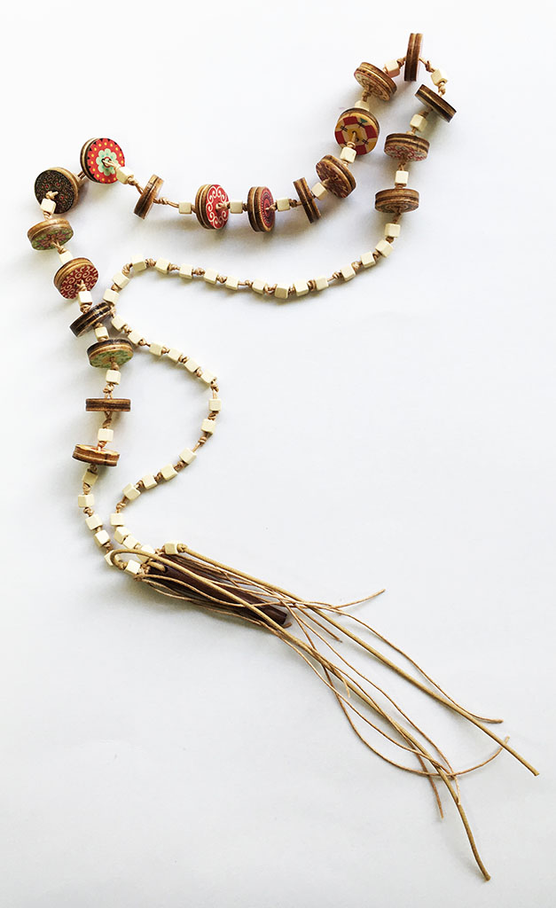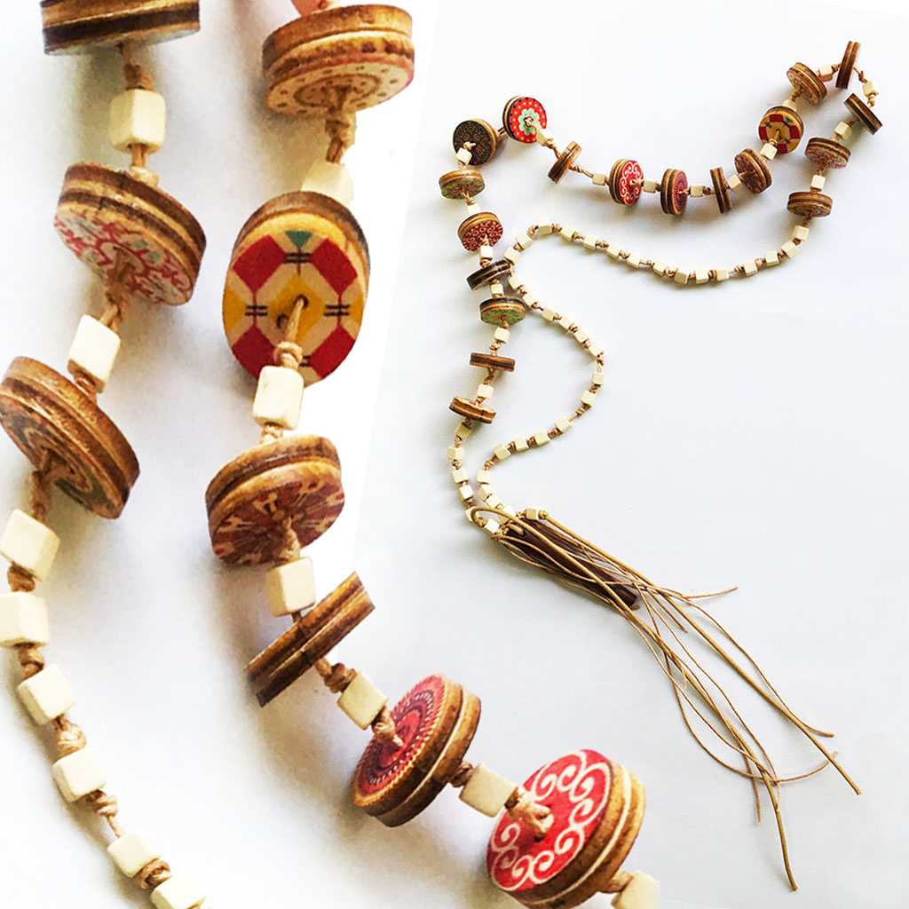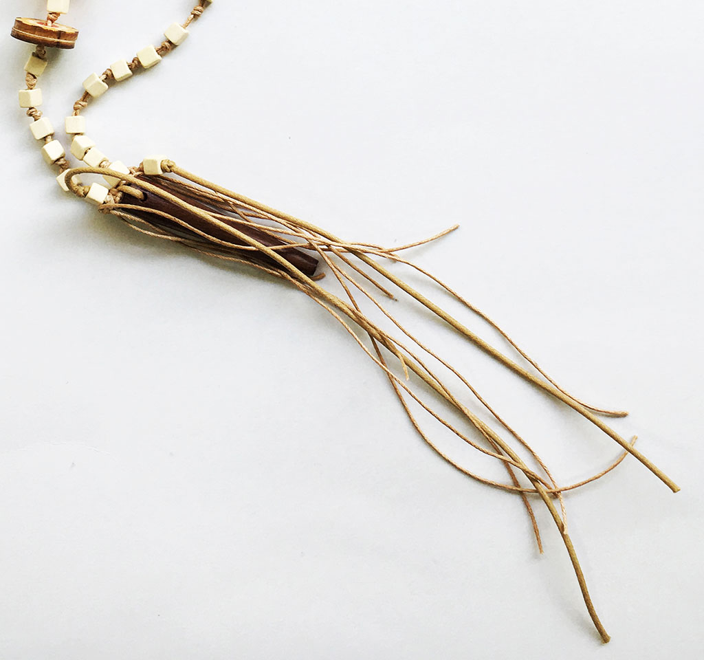 υλικά: 5 χιλ. χάντρες από πηλό σε μπεζ χρώμα, 6,3 εκ. x 1 εκ/5 χιλ. ξύλινη χάντρα σε καφέ χρώμα, 2 χιλ. x 2εκ. ξύλινα κουμπιά με σχέδια σε διάφορα χρώματα, 1 χιλ./2 χιλ. μπεζ βαμβακερό σχοινί