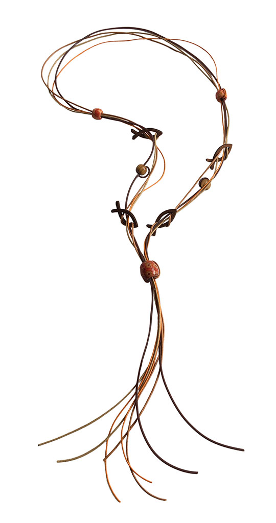υλικά/: 2 μπεζ καφέ ξύλινες στρογγυλές χάντρες 1εκ x 1 εκ , 2 πορτοκαλί μπεζ ξύλινες στρογγυλές χάντρες 1εκ x 1 εκ με αφηρημένο σχέδιο, 2 ξύλινες καφέ χάντρες σχήμα ψαριού 3,5 εκ x 1,5 εκ, ξύλινη χάντρα με γεωμετρικά σχέδια σε μπεζ-καφέ χρώματα με φόντο πορτοκαλί 1,8 εκ Χ 1,8 εκ, βαμβακερό σχοινί 2χιλ σε πορτοκαλί/ώχρα/δέρματος χρώμα, 3 χιλ καφέ καουτσούκ σχοινί