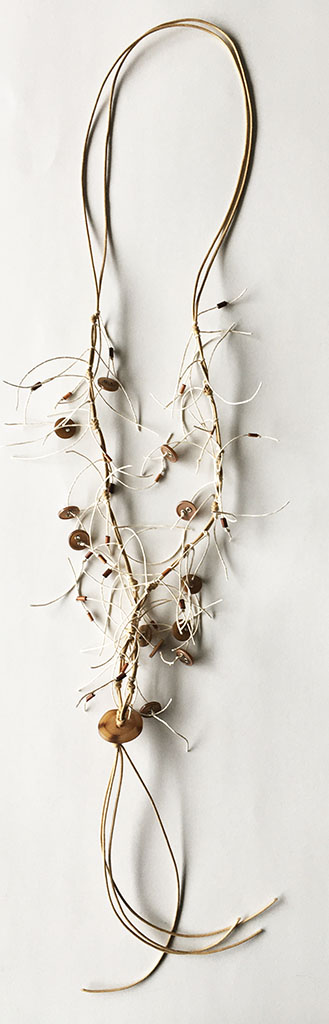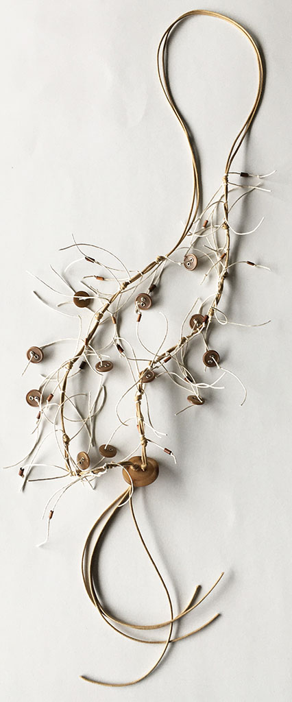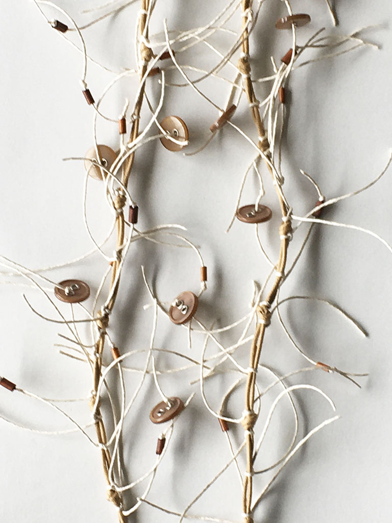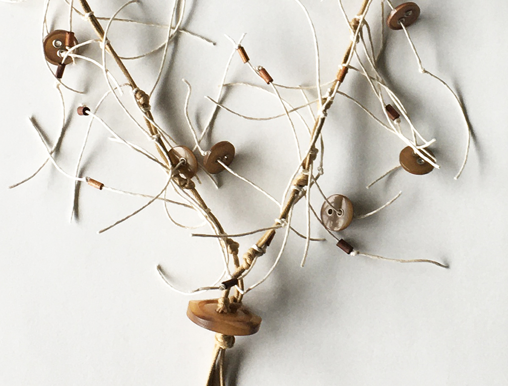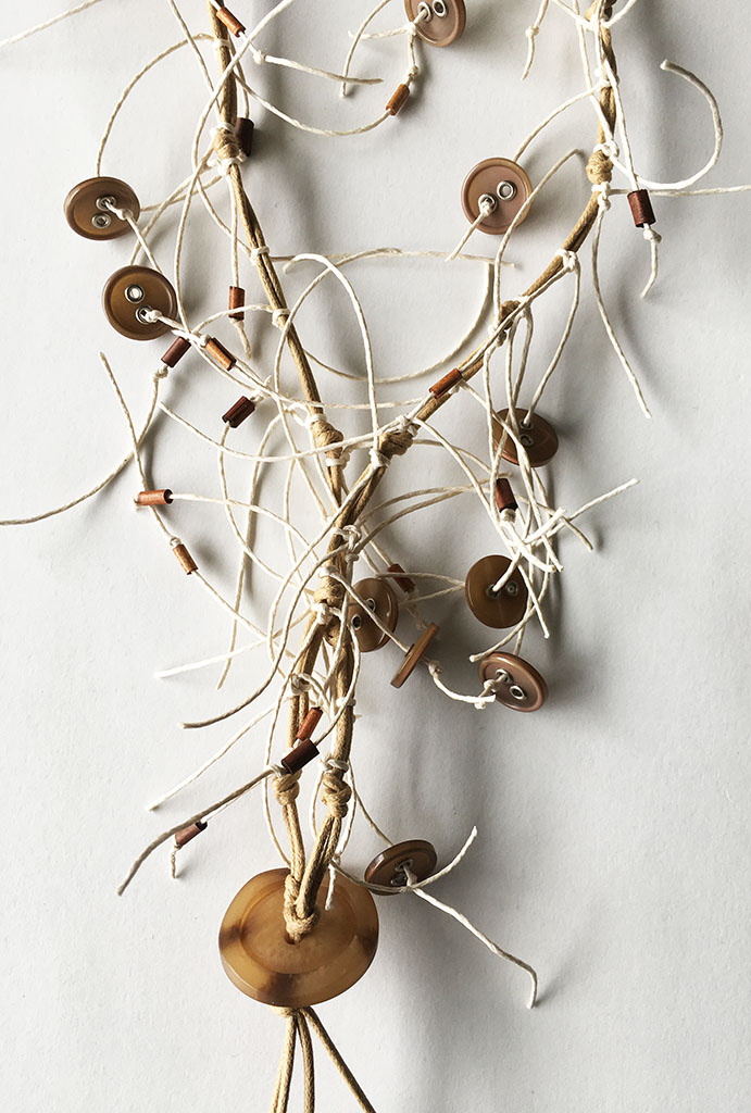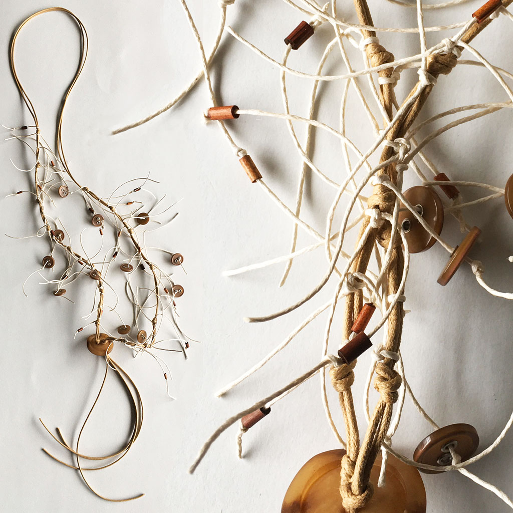 υλικά: 6 χιλ. ξύλινες χάντρες σωλινάκια σε γήινες αποχρώσεις, 1 χιλ. x 1,5 εκ. διάμετρος κοκάλινα κουμπία σε σκούρο μπεζ χρώμα, 5 χιλ. x 3 εκ. κοκάλινο κουμπί σε καφε μπεζ χρώμα, 1 χιλ./2 χιλ. βαμβακερά σχοινιά σε μπεζ και ανοιχτό εκρού χρώμα