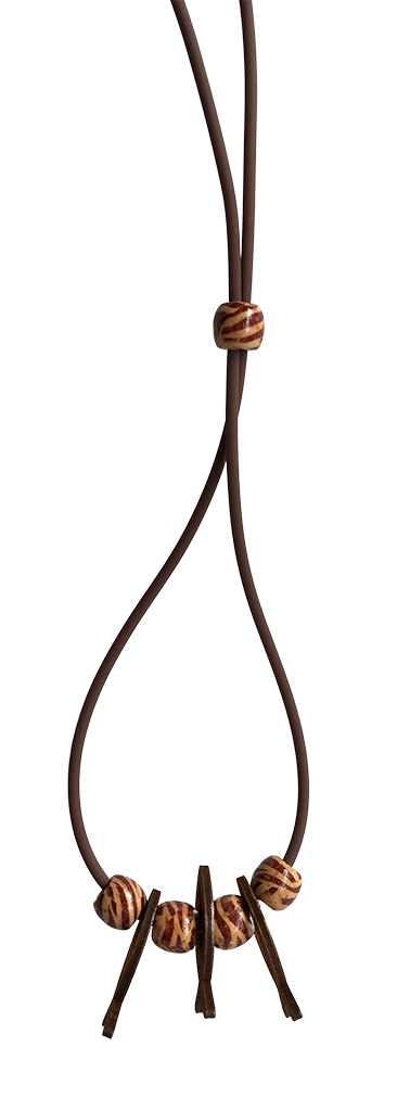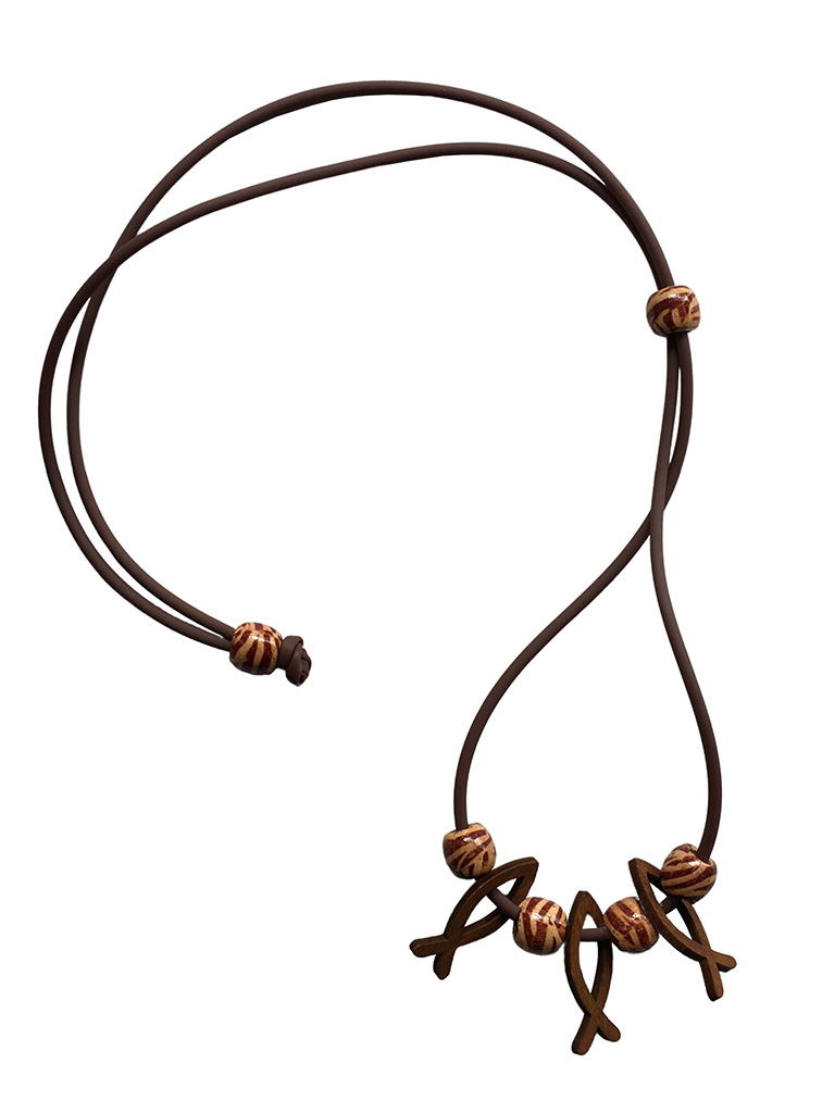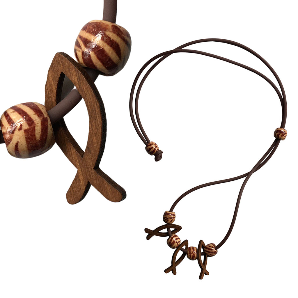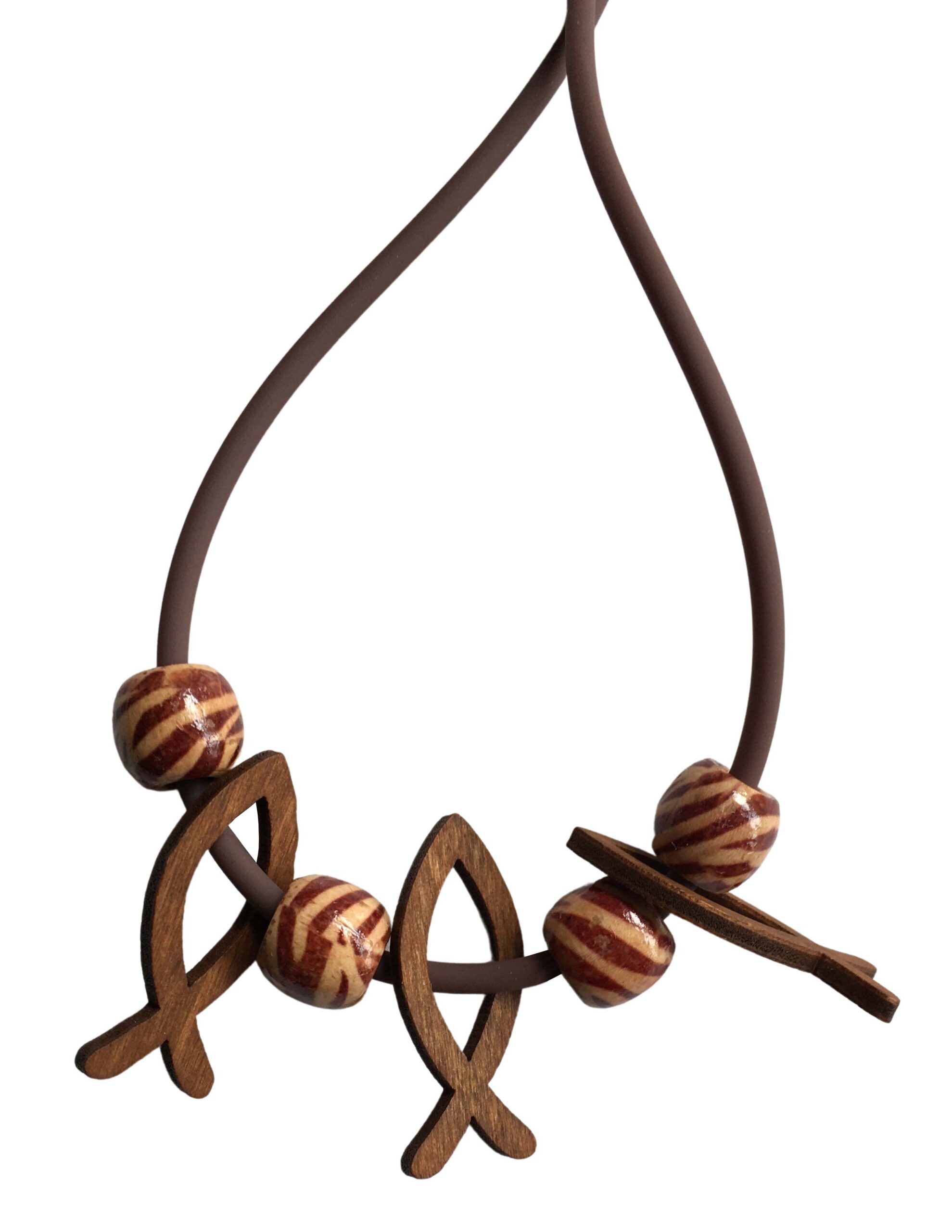 υλικά: 6 ξύλινες καμπυλόγραμμες χάντρες 1εκ x 1 εκ (όπου 1 ρυθμιζόμενη χάντρα για το πέρασμα του κεφαλιού , 2χιλ. καφέ καουτσούκ 3 χιλ, 3 ξύλινες καφέ χάντρες σχήμα ψαριού 3,5 εκ x 1,5 εκ