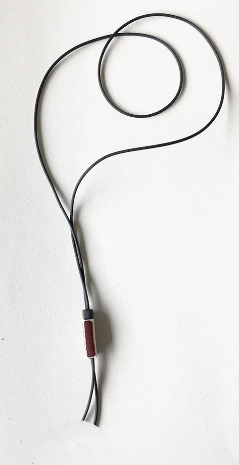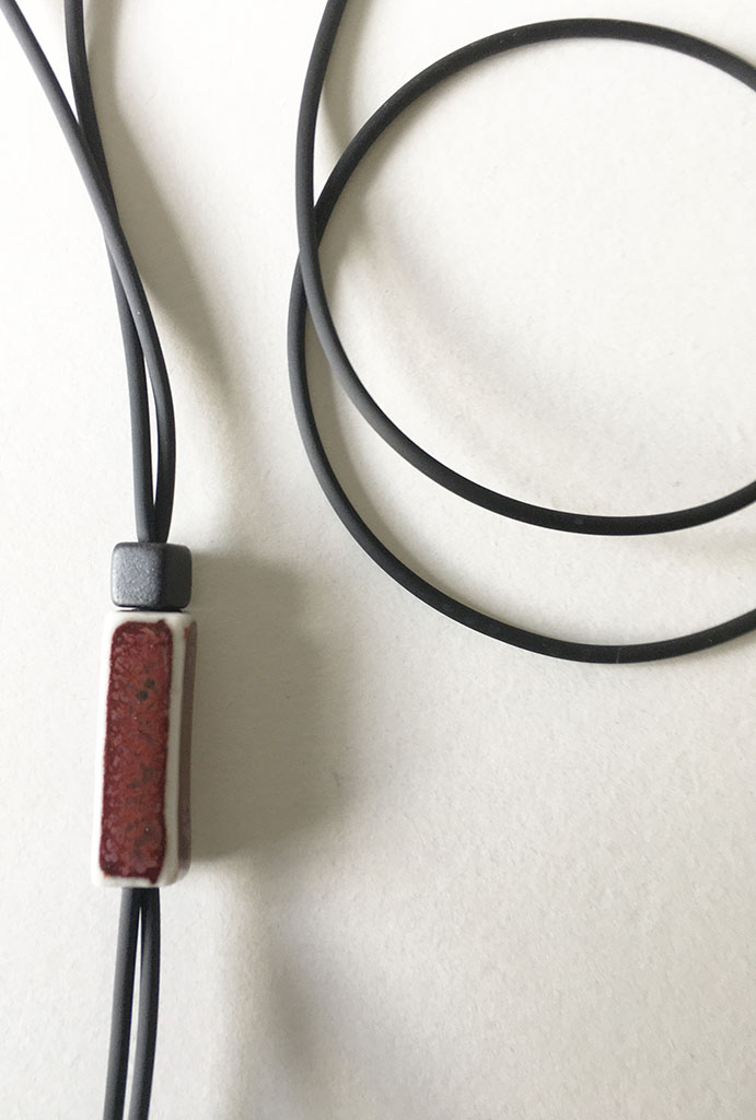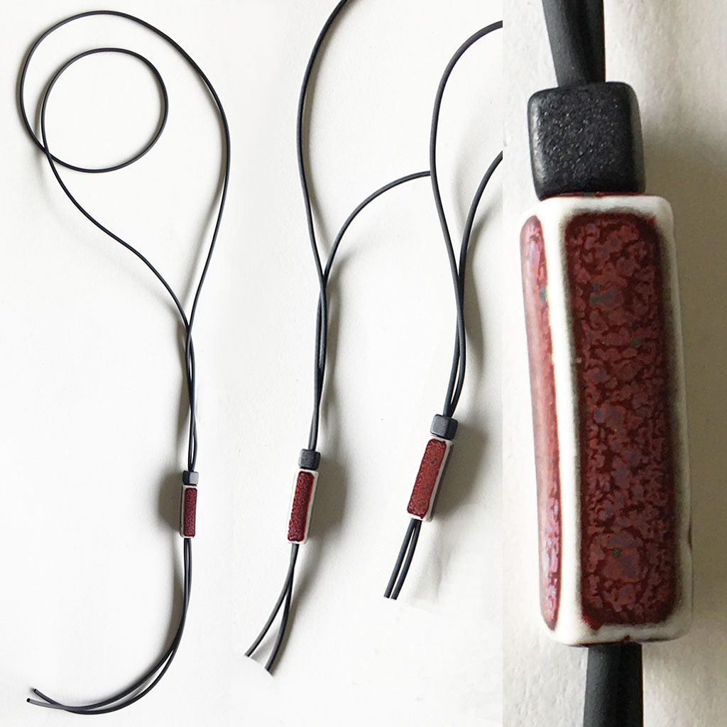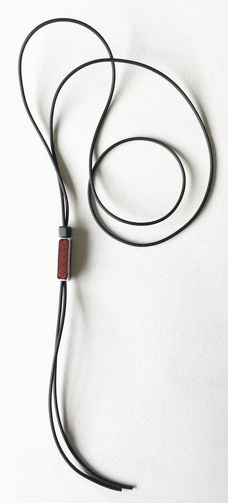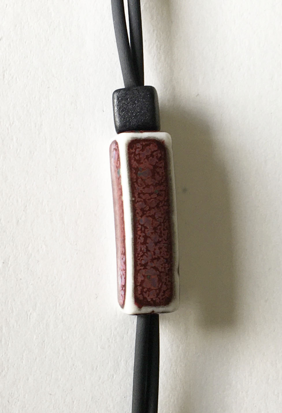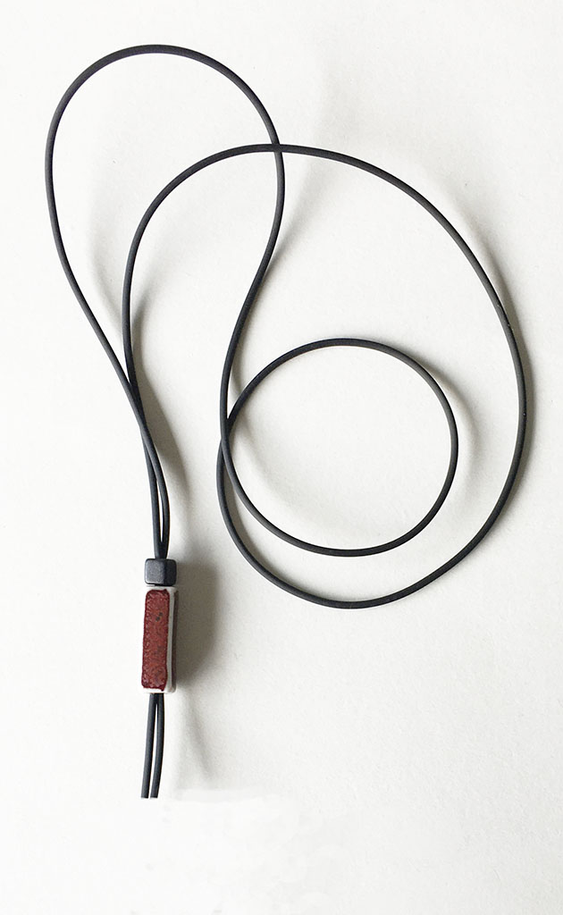 υλικά: 5 χιλ. τετράγωνη χάντρα από πηλό σε μαύρο χρώμα, 7 χιλ. x 3 εκ. χάντρα από πηλό σε μπορντώ χρώμα, 2 χιλ. μαύρο καουτσούκ