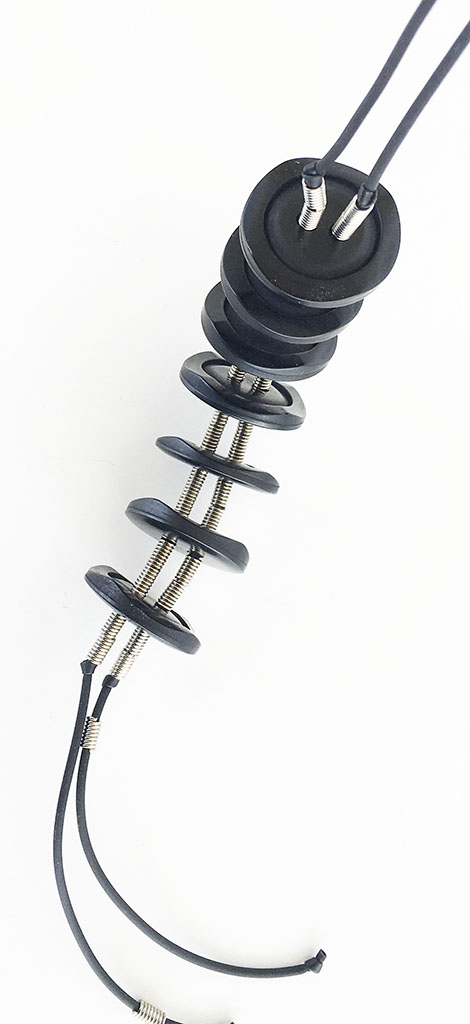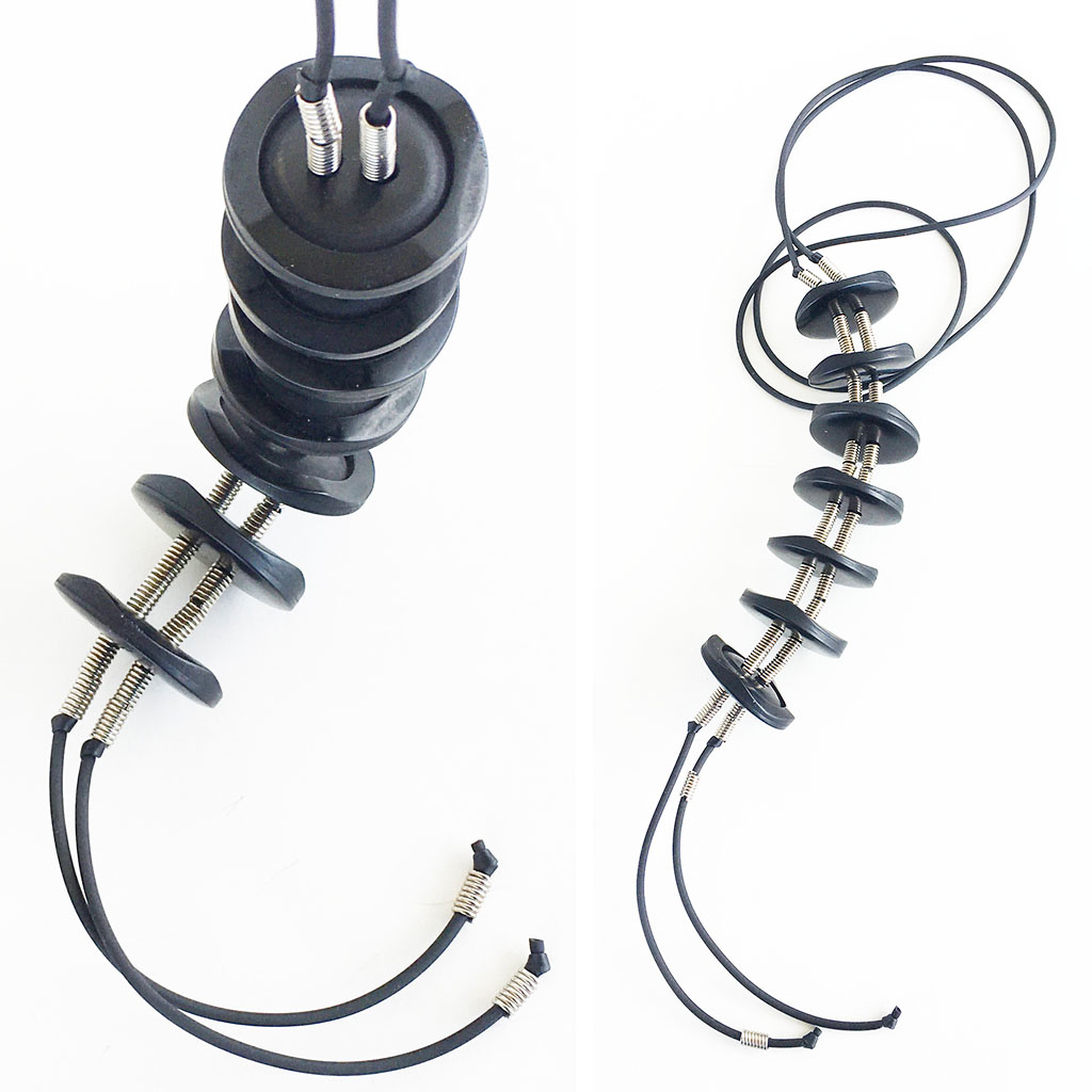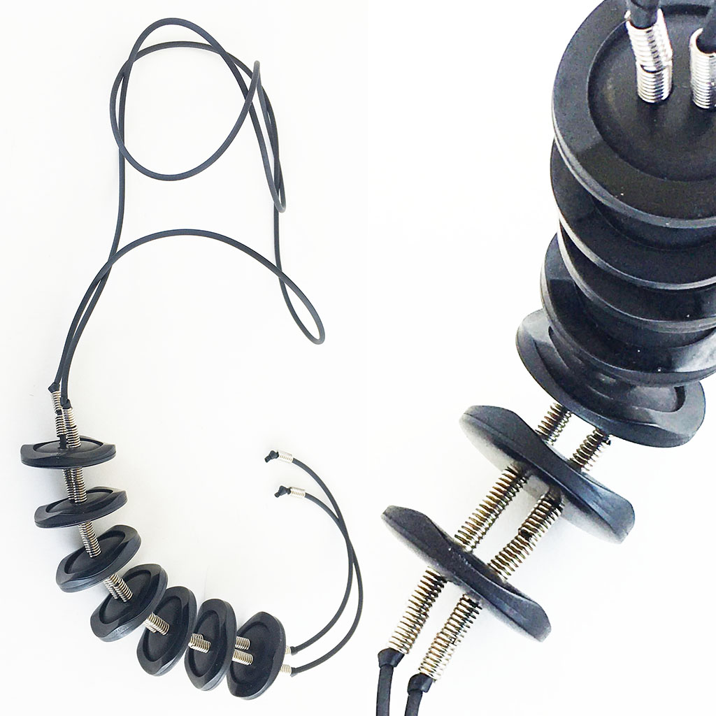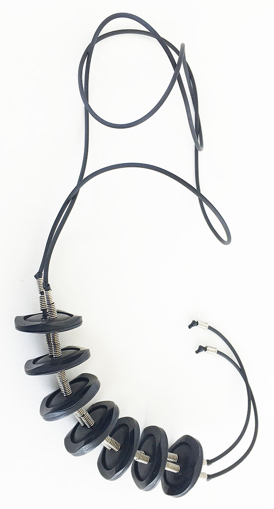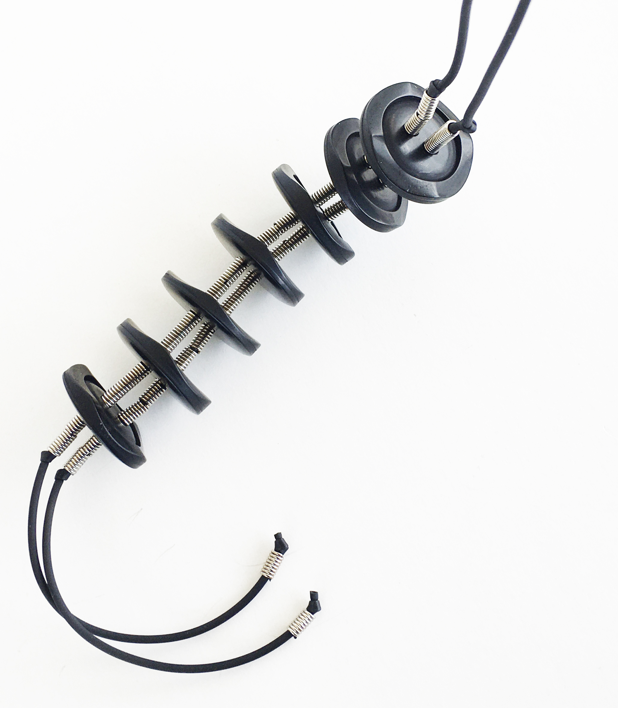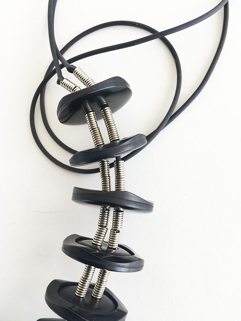 υλικά: 2 χιλ. μαύρο καουτσούκ, 3 χιλ. x 6 χιλ. ανάγλυφη μεταλλική χάντρα σχήμα σωλήνα, 4 χιλ. x 3 εκ. διάμετρο συνθετικό κουμπί σε μαύρο χρώμα