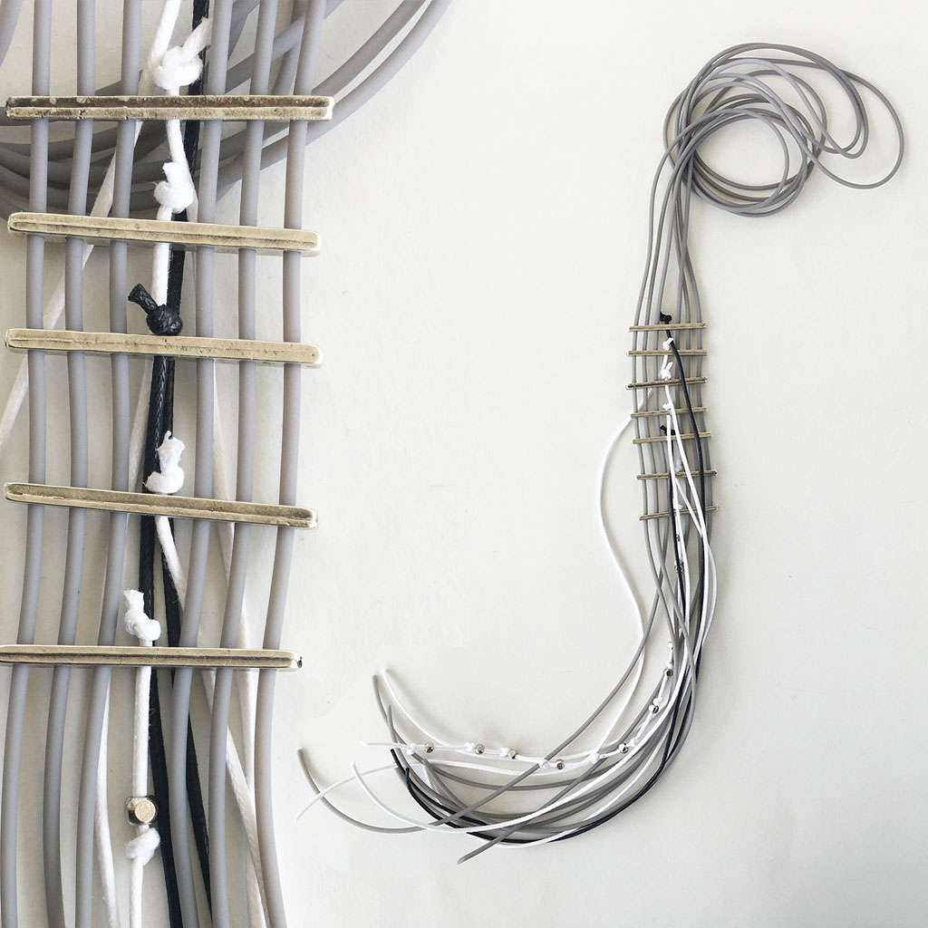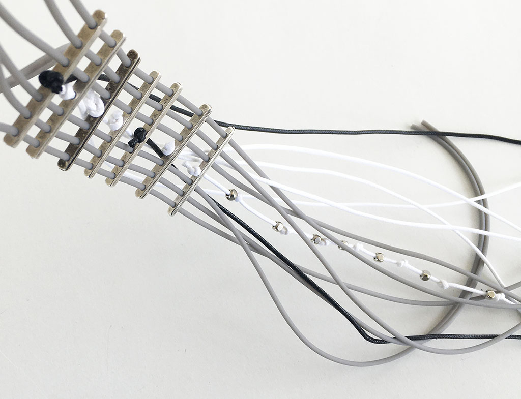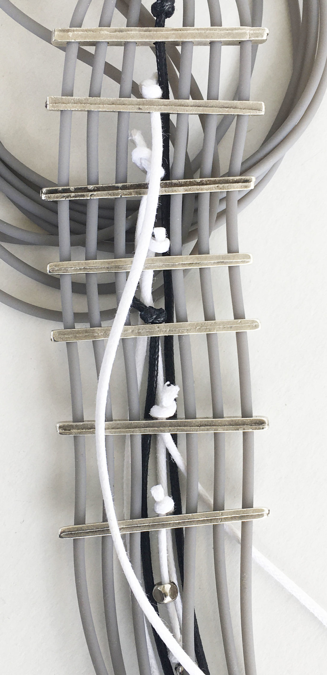 υλικά/πάχος: 2 χιλ. x 4 χιλ. μεταλλικές χάντρες σχήμα ράβδοι, 2 χιλ. γκρι καουτσούκ, 1 χιλ. βαμβακερό σχοινί σε άσπρο και μαύρο χρώμα, 2 χιλ. τετράγωνες μεταλλικές χάντρες