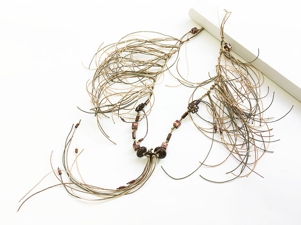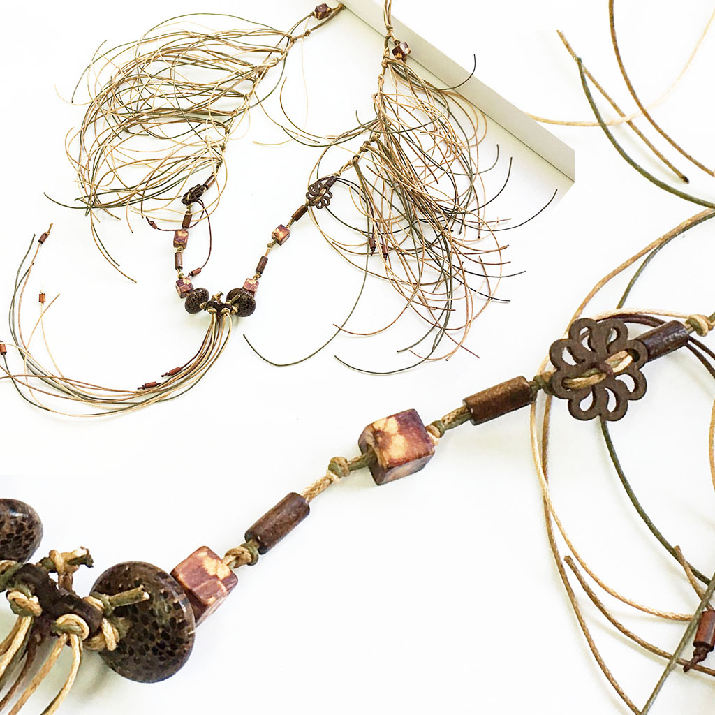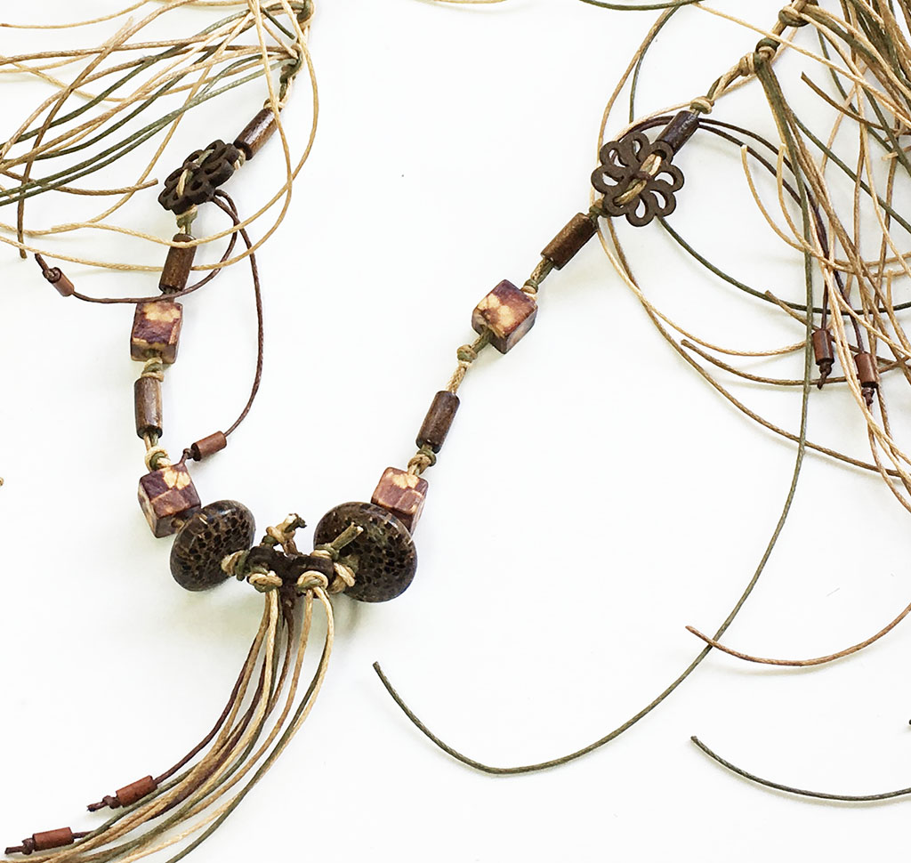 υλικά/πάχος: 8 χιλ. ξύλινες τετράγωνες ζωγραφισμένες χάντρες γήινες αποχρώσεις, 6χιλ./1 εκ. ξύλινες χάντρες σχήμα σωλήνα καφέ αποχρώσεις, 7 χιλ. x 2 εκ. ξύλινες χάντρες σχήμα ρόμβος καφέ αποχρώσεις, 2 χιλ. x 1,8 εκ. ξύλινα κουμπιά σχήμα λουλουδιού σε σκούρο καφές, 1 χιλ. βαμβακερό σχονί σε καφέ, χακί, μπεζ χρώμα