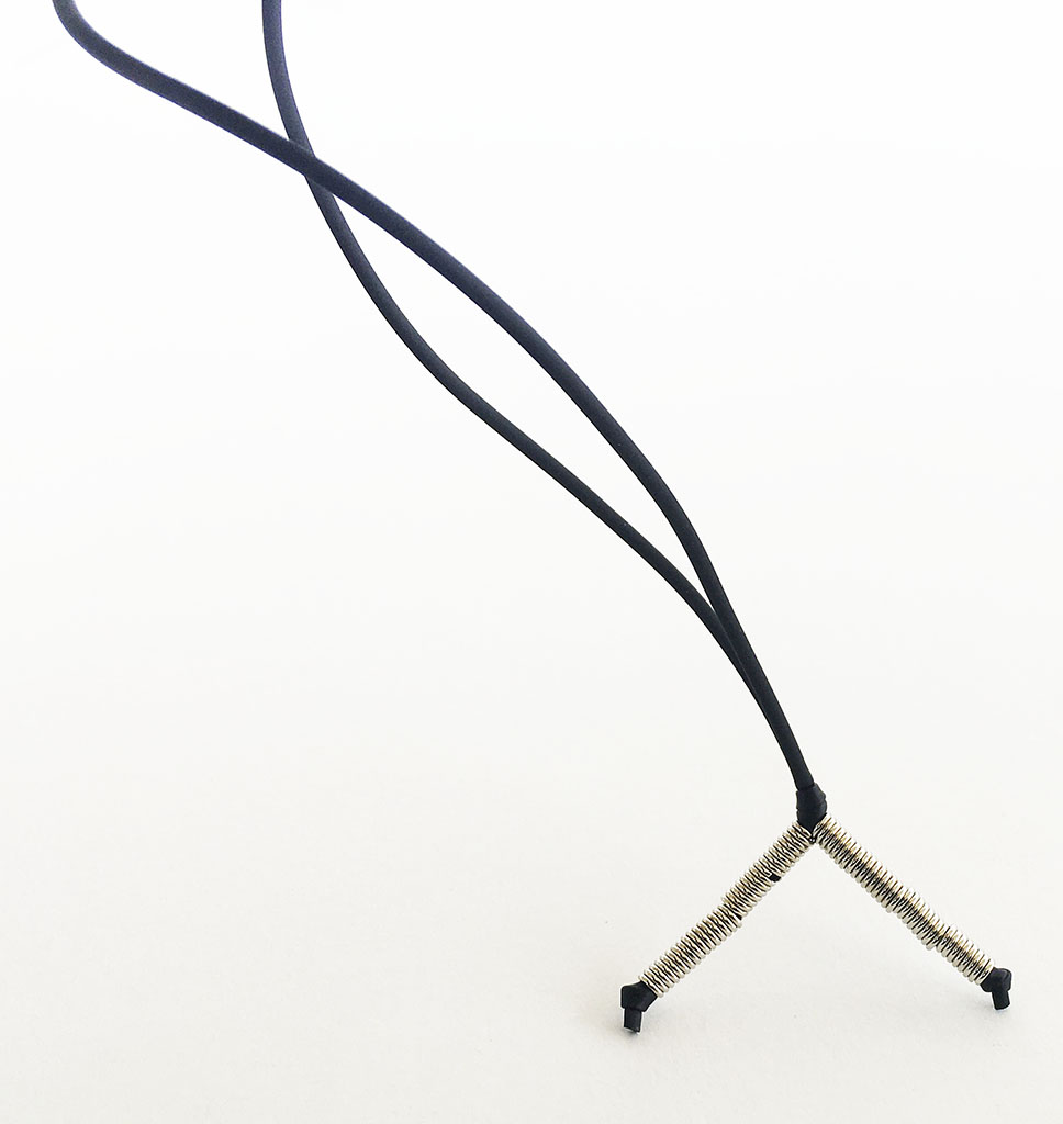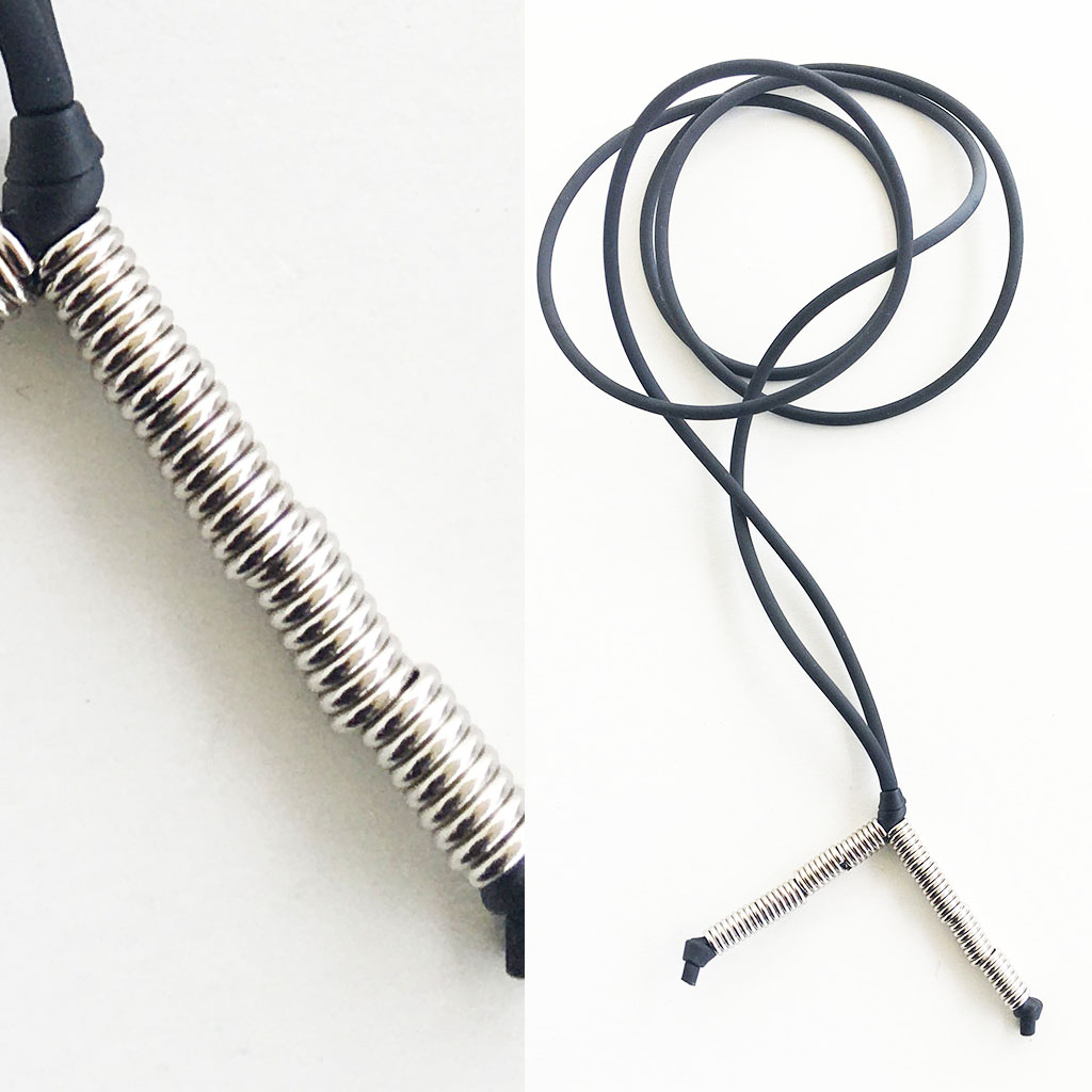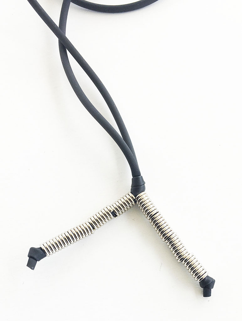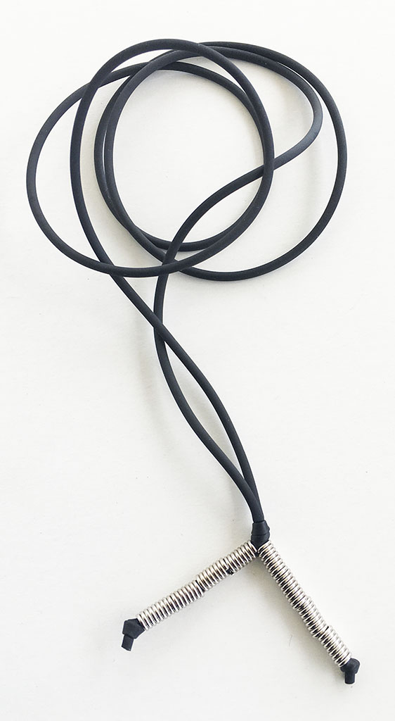 υλικά: 2 χιλ. μαύρο καουτσούκ, 3 χιλ. x 6 χιλ. ανάγλυφη μεταλλική χάντρα σχήμα σωλήνα