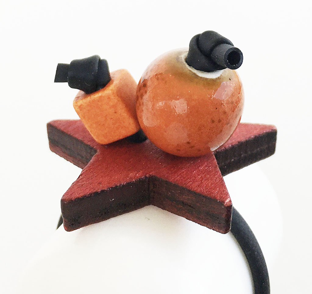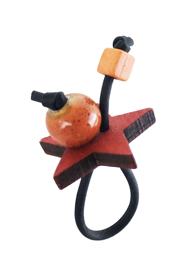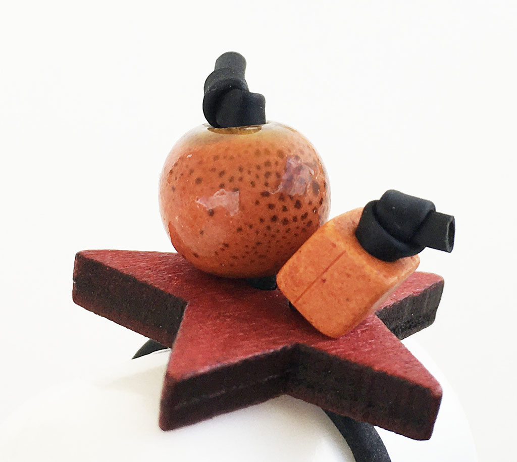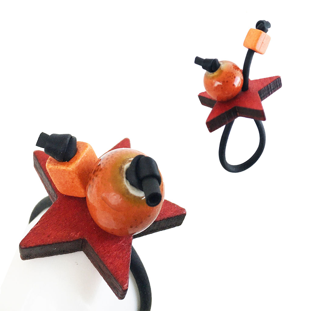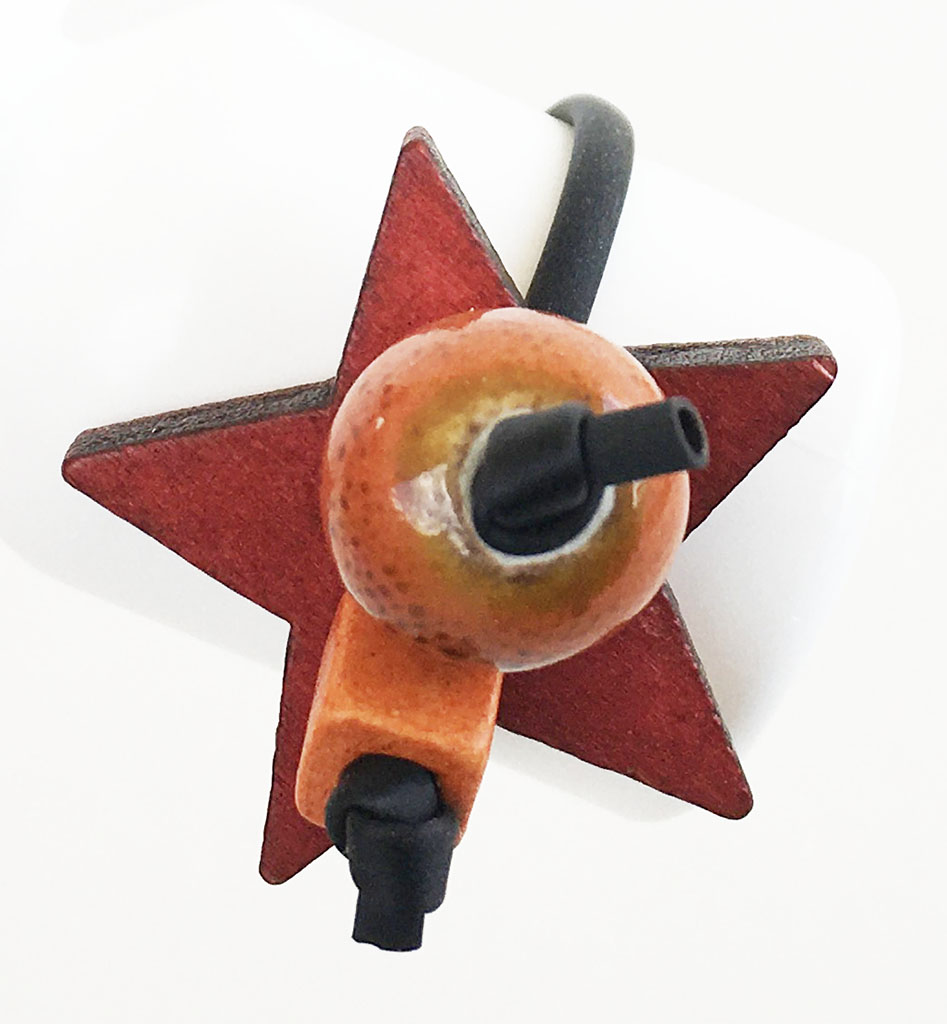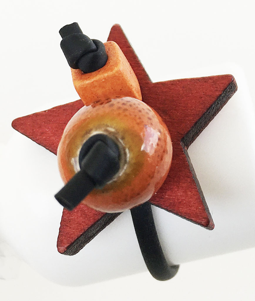 υλικά: 2 χιλ. μαύρο καουτσούκ, 10 χιλ. διάμετρος χάντρα από πηλό σε πορτοκαλί χρώμα με καφέ στίγματα, 5 χιλ. τετράγωνη χάντρα από πηλό σε πορτοκαλί χρώμα, 4 χιλ. X 2,5 εκ. ξύλινη επιφάνεια σχήμα αστέρι σε κόκκινη απόχρωση