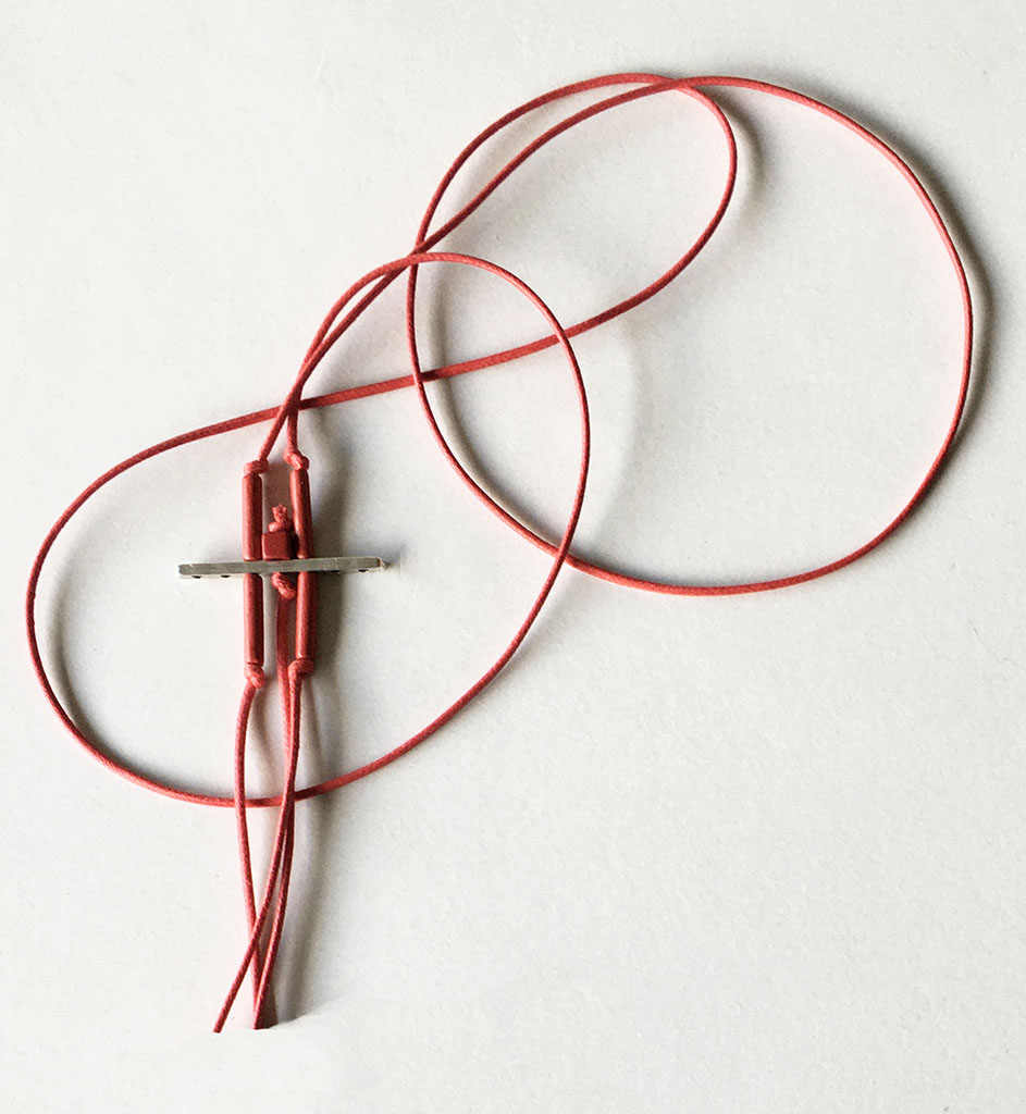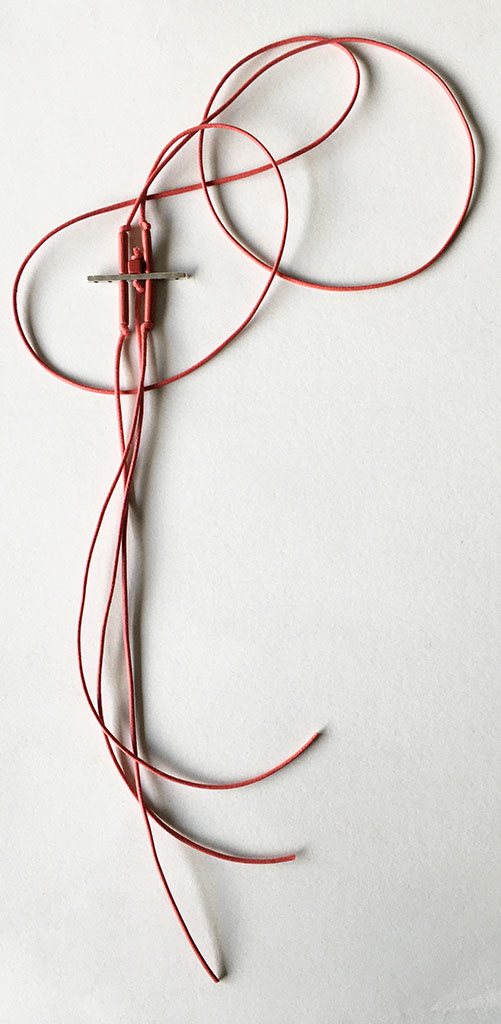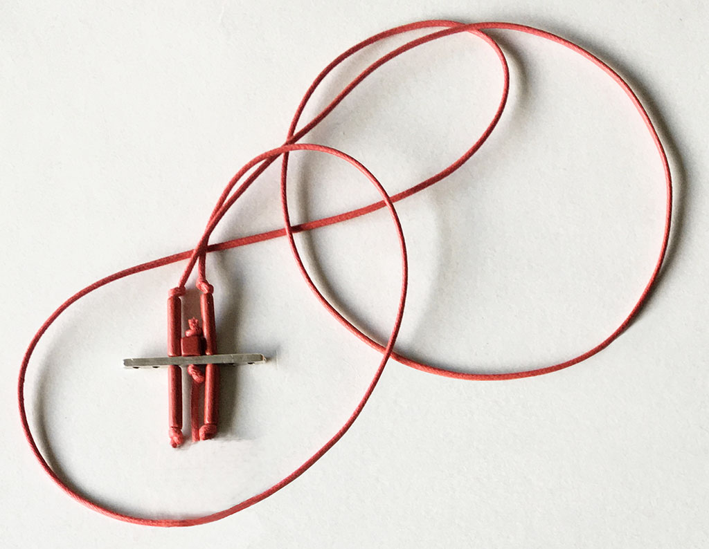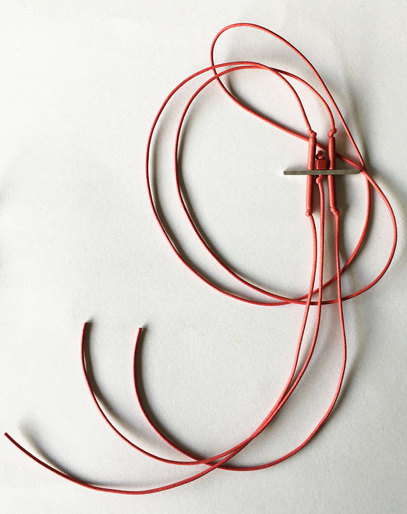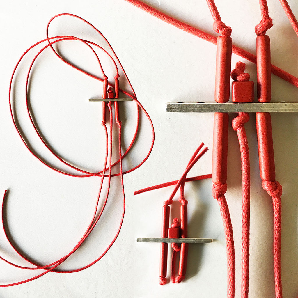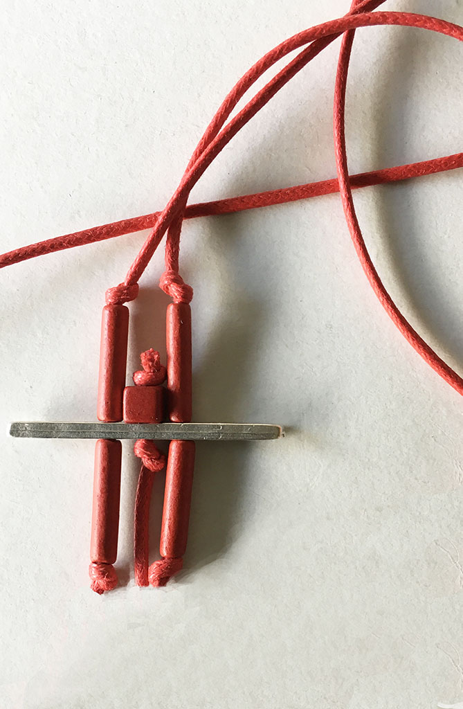 υλικά: 5 χιλ. τετράγωνη χάντρες από πηλό σε κόκκινο χρώμα, 1,7 εκ. χάντρα από πηλό σε σχήμα σωλήνα σε κόκκινο χρώμα, 2 χιλ. x  4 εκ. μεταλλική χάντρα, 2 χιλ. βαμβακερό σχοινί σε κόκκινο χρώμα