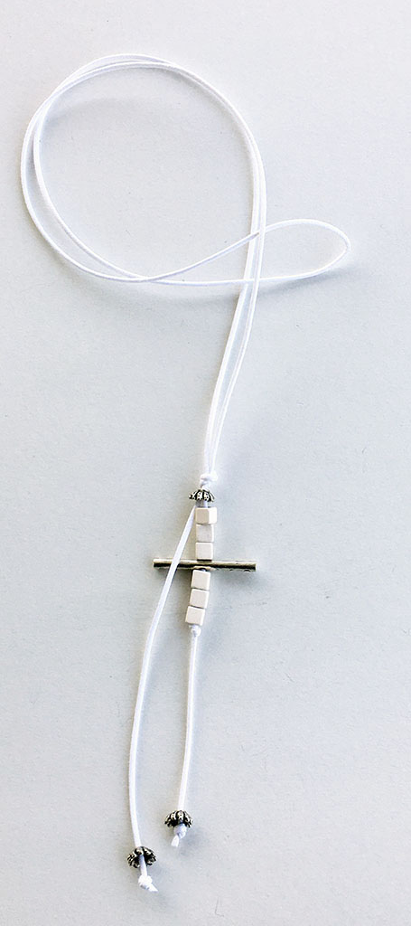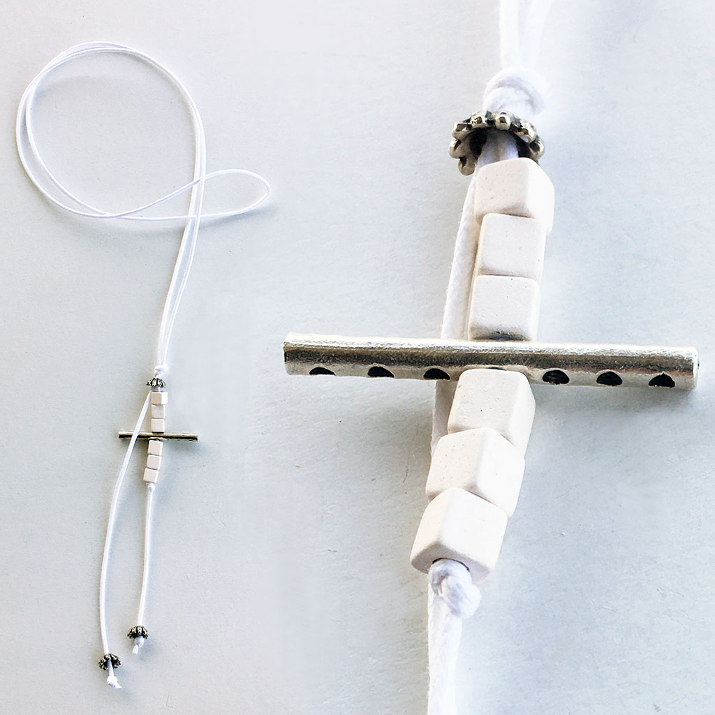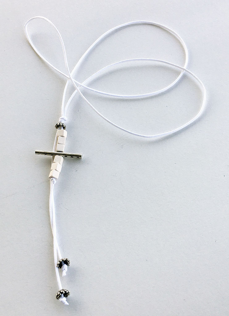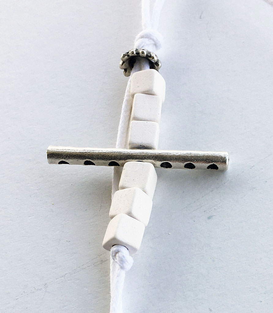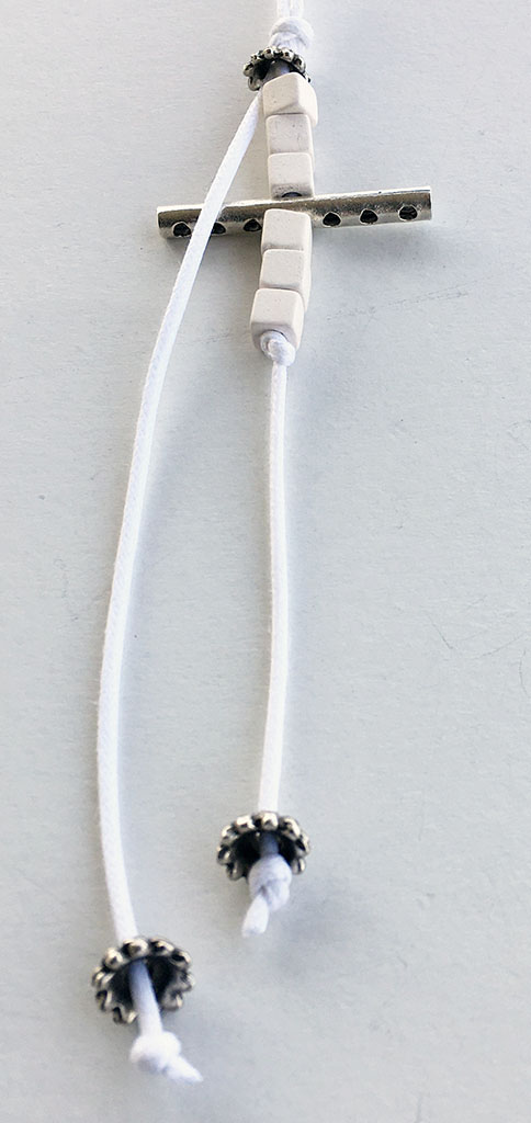 υλικά: 2 χιλ. άσπρο βαμβακερό σχοινί, 5 χιλ. χάντρες από πηλό σε άσπρο χρώμα, 2 χιλ. x  3,4 εκ. μεταλλική χάντρα, 5 χιλ  x 6 χιλ. μεταλλική χάντρα