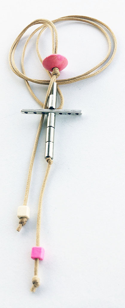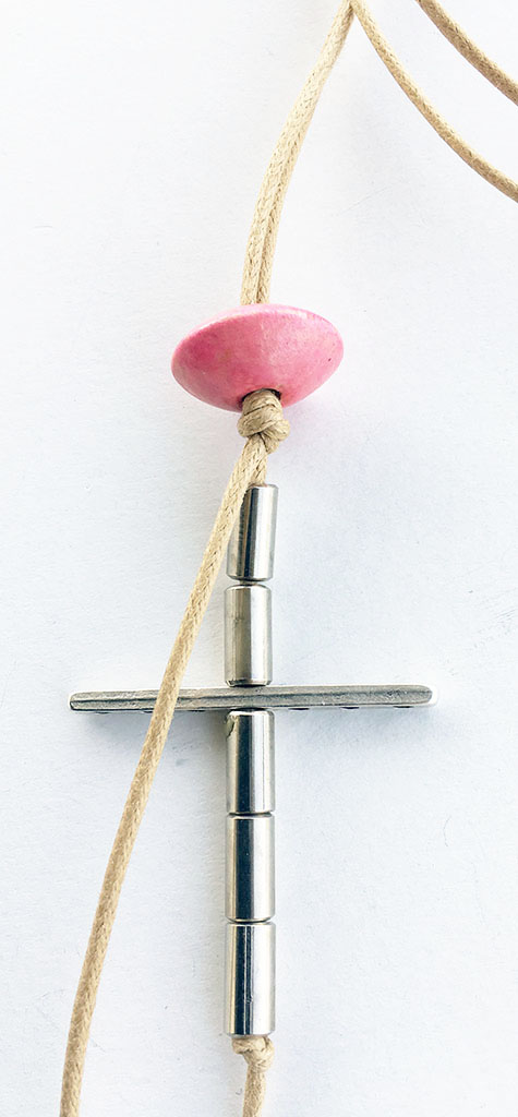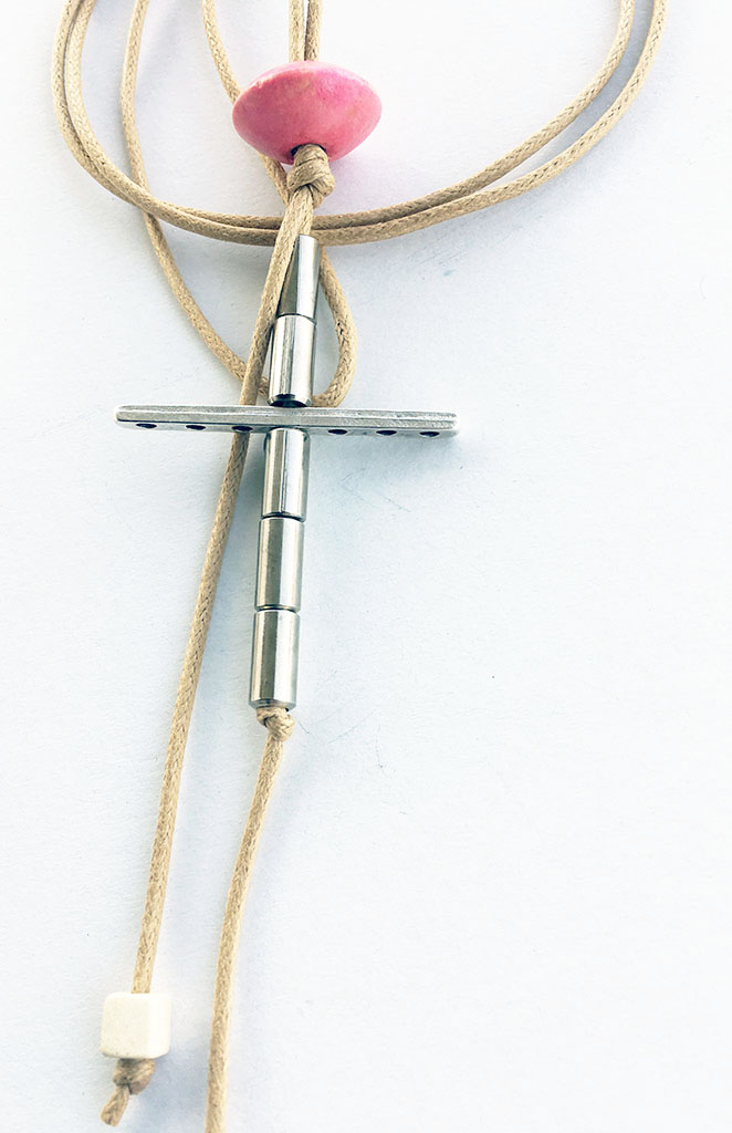 υλικά: 2 χιλ. μπεζ βαμβακερό σχοινί, 1 εκ. x 5 χιλ. μεταλλικές χάντρες σχήμα σωλήνα, 8 χιλ. x 1,5 εκ. ξύλινες χάντρες σε ροζ χρώμα, 5 χιλ. χάντρες από πηλό σε μπεζ και ροζ χρώμα, 2 χιλ. x 4 εκ. μεταλλικές χάντρες