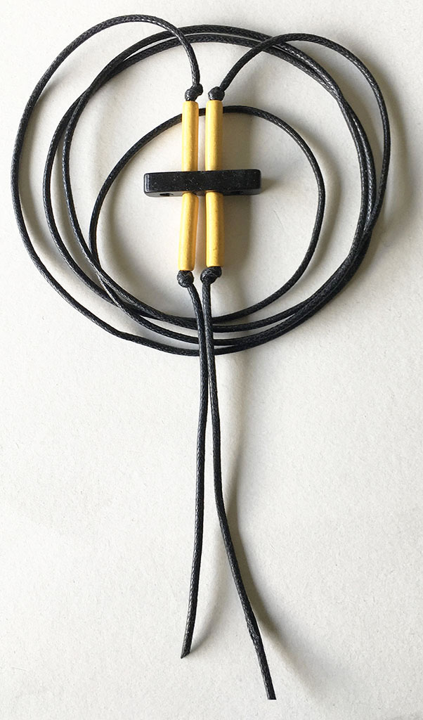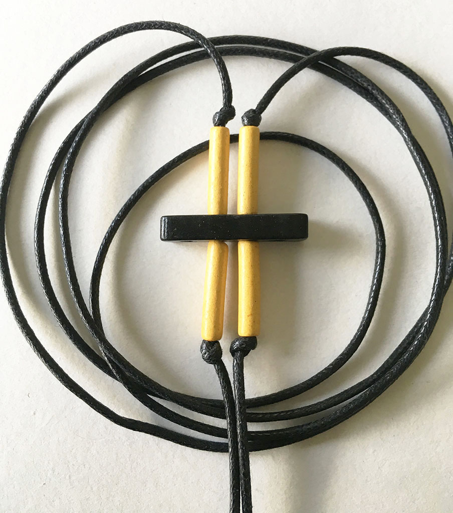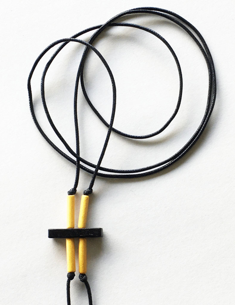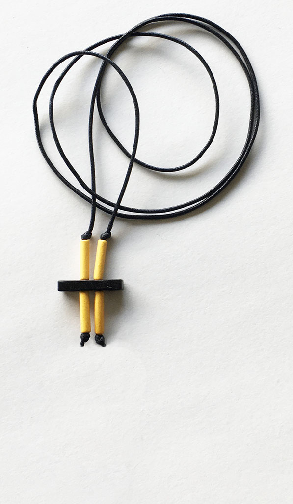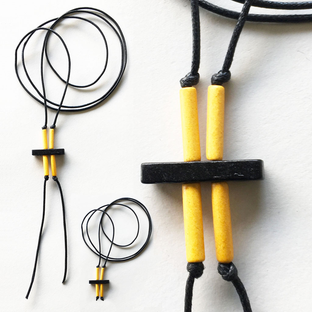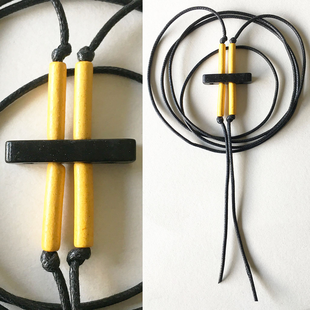 υλικά: 5 χιλ. x  2,5 εκ. χάντρες από πηλό σε μαύρο χρώμα, 1,7 εκ. χάντρες από πηλό σε κίτρινο χρώμα, 2 χιλ. μαύρο βαμβακερό σχοινί