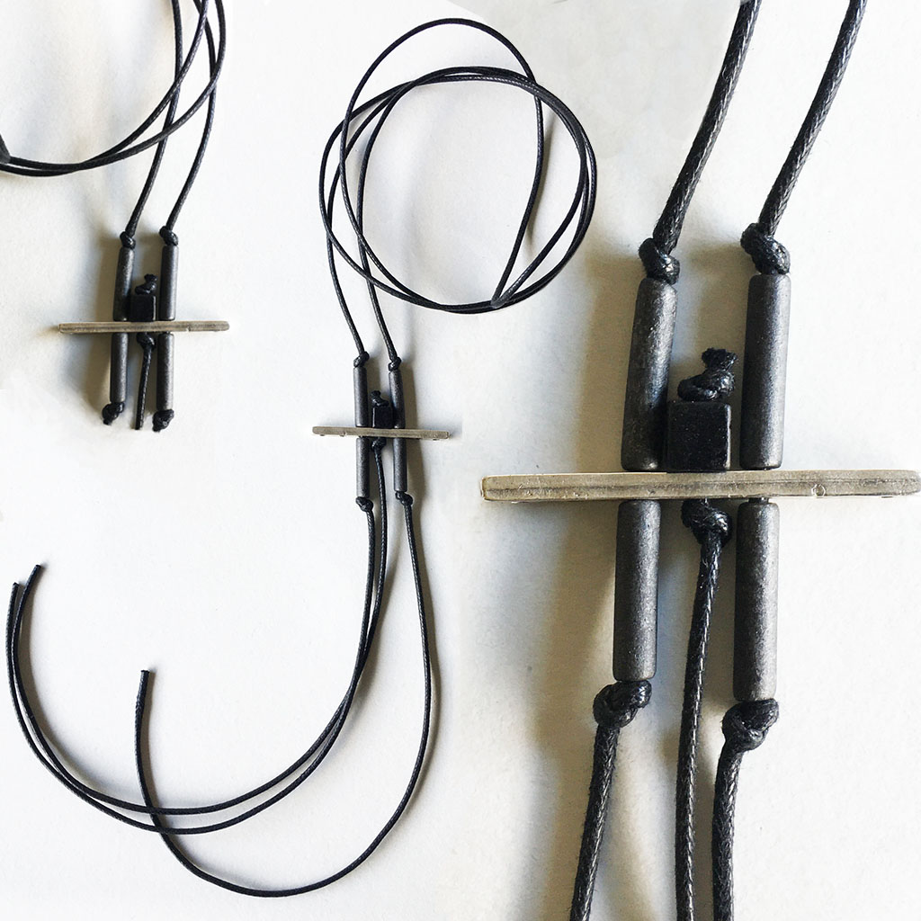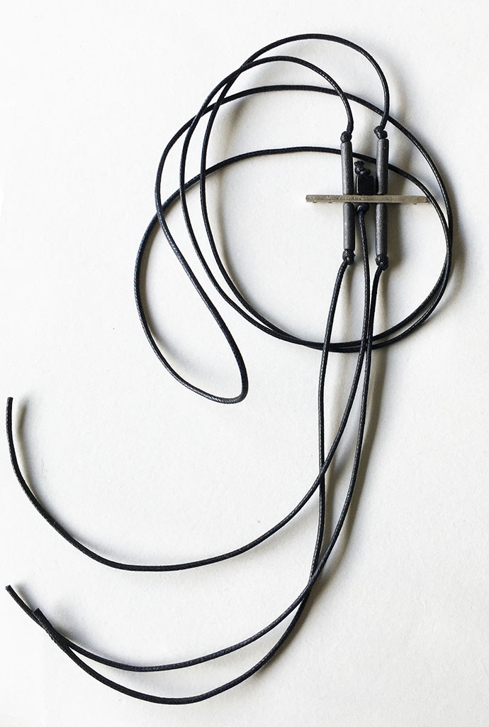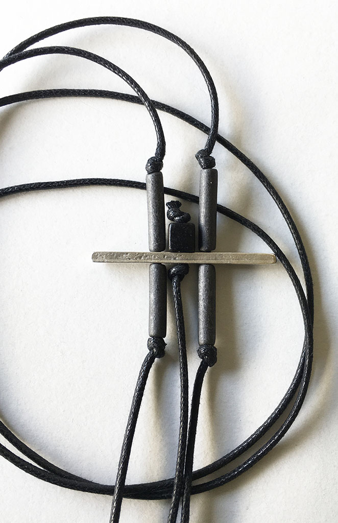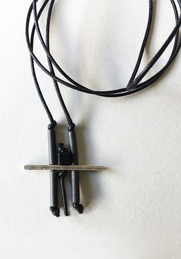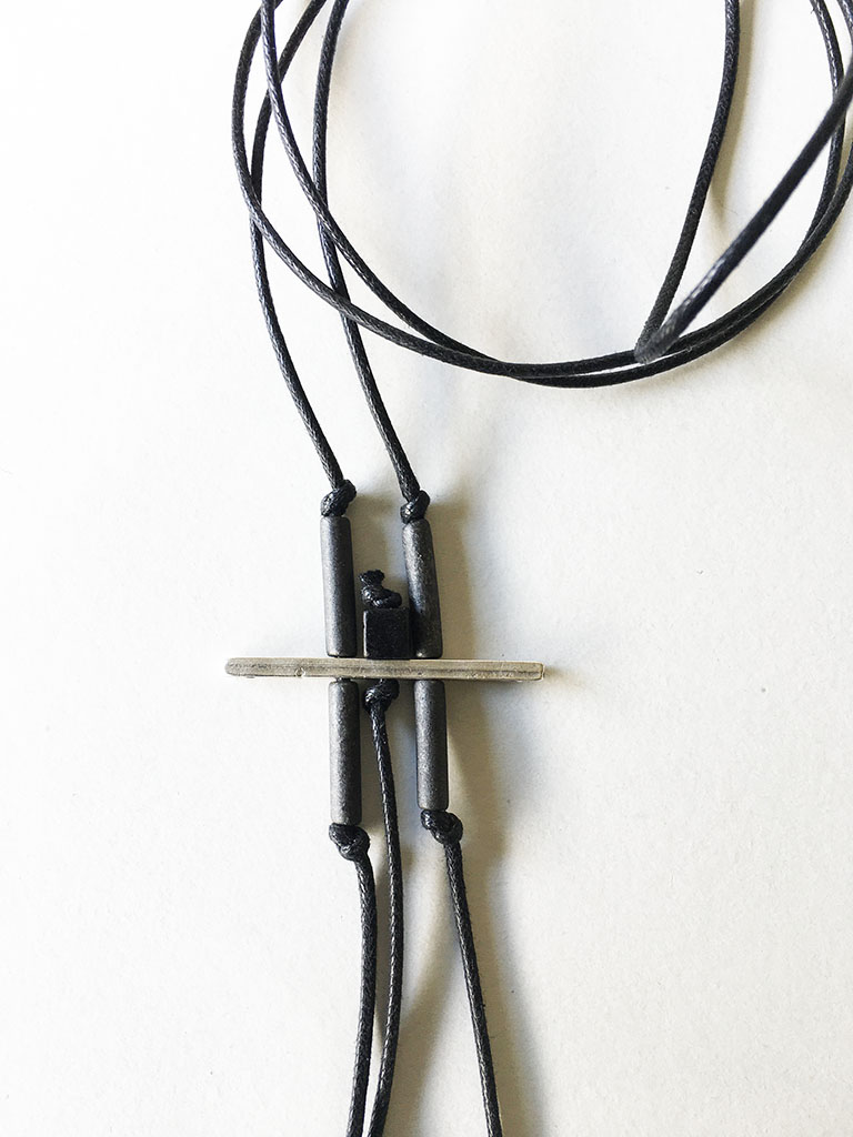 υλικά: 5 χιλ. τετράγωνη χάντρες από πηλό σε μαύρο χρώμα, 1,7 εκ. χάντρα από πηλό σε σχήμα σωλήνα σε σκούρο γκρι χρώμα, 2 χιλ. x 4 εκ. μεταλλική χάντρα, 2 χιλ. βαμβακερό σχοινί σε μαύρο χρώμα