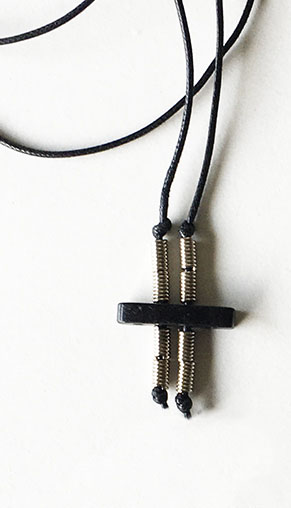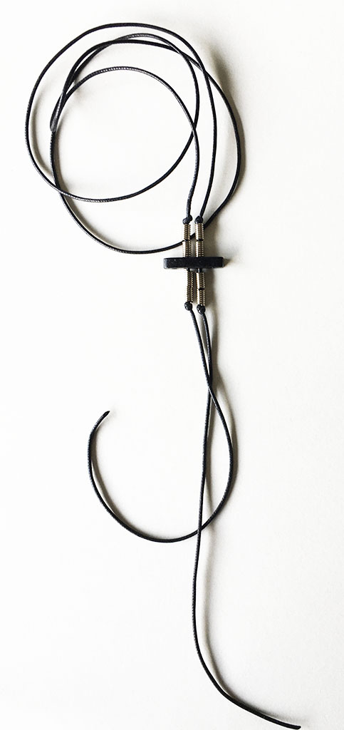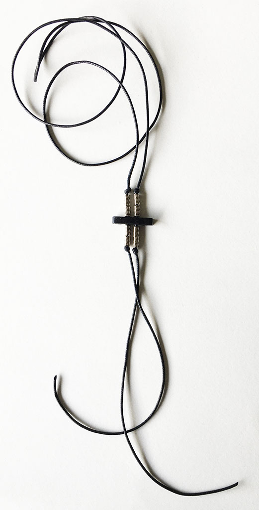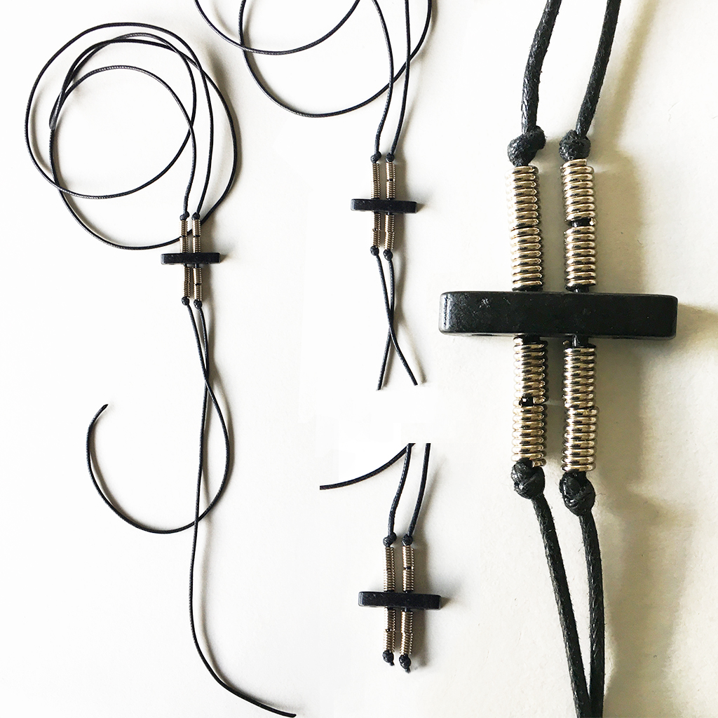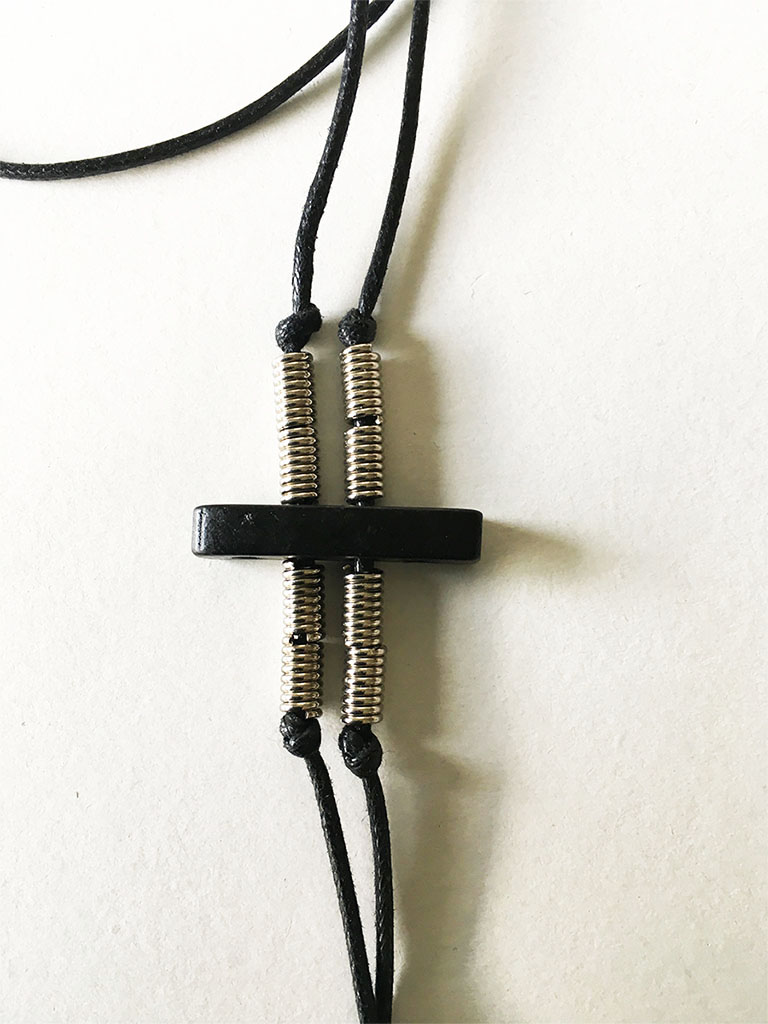 υλικά: 5 χιλ. x 2,5 εκ. χάντρα από πηλό σε μαύρο χρώμα, 3 χιλ. x 7 χιλ. μεταλικές χάντρες σχήμα σωλήνα, 2 χιλ. μαύρο βαμβακερό σχοινί