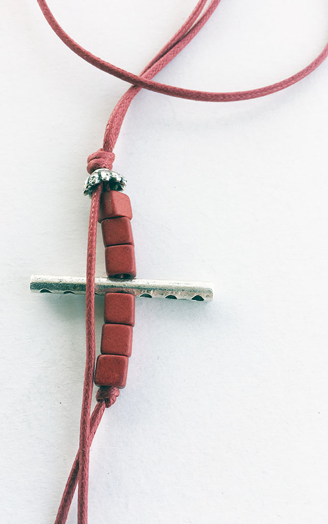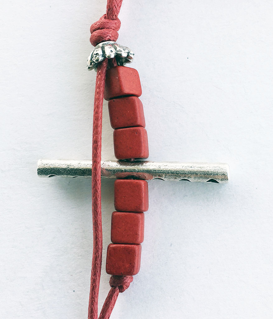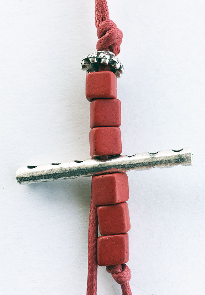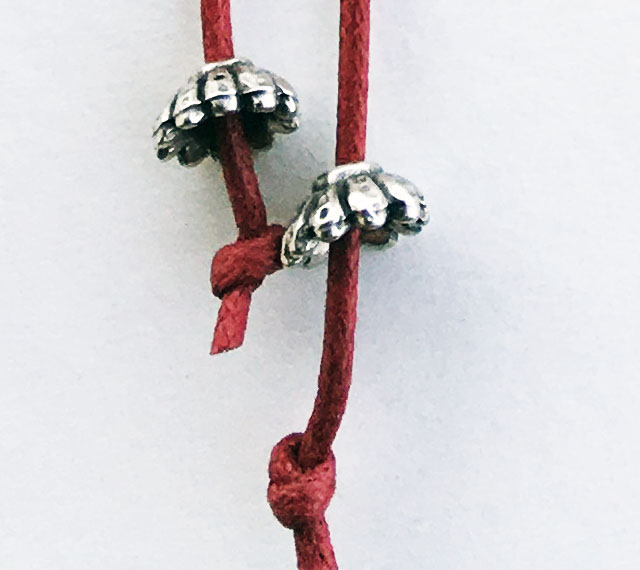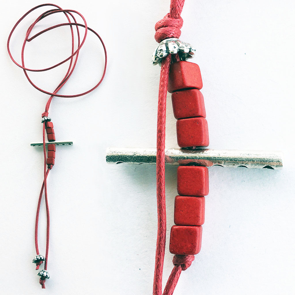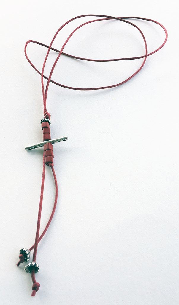 υλικά: 2 χιλ. σκούρο κόκκινο βαμβακερό σχοινί, 5 χιλ. χάντρες από πηλό σε σκούρο κόκκινο χρώμα, 2 χιλ. x 3,4 εκ. μεταλλική χάντρα, 5 χιλ x 6 χιλ. μεταλλική χάντρα