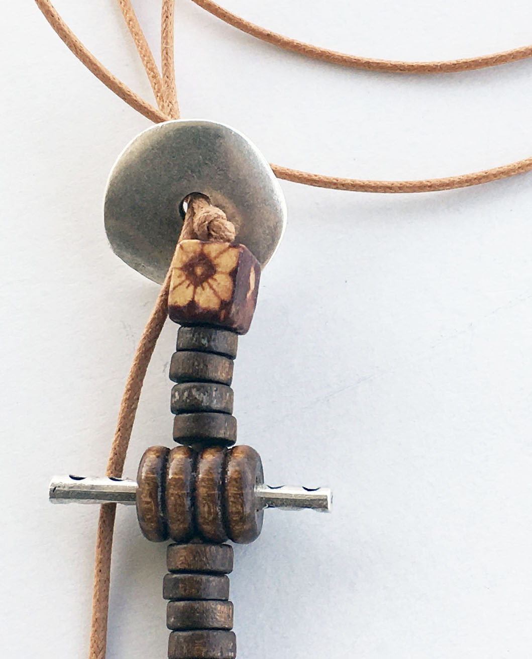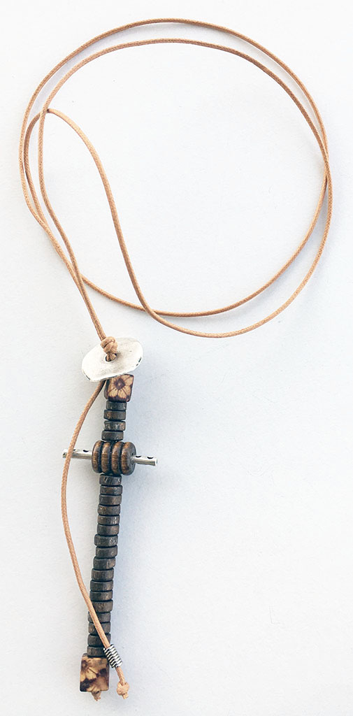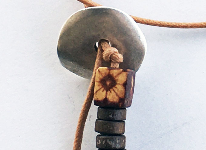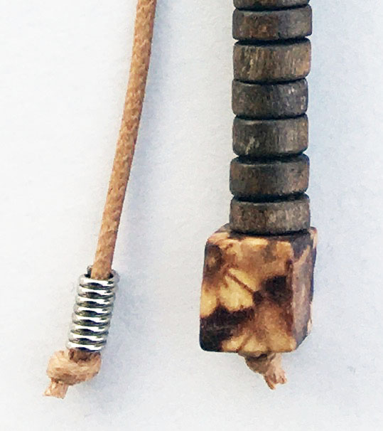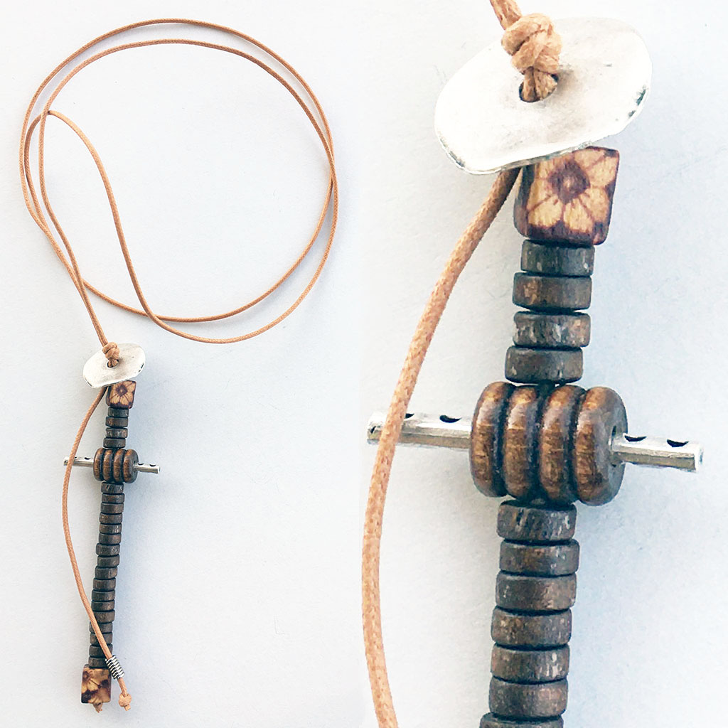 υλικά: 2 χιλ. βαμβακερό σχοινί σε σκούρο μπεζ, 2 χιλ. x 6χιλ. ξύλινες χάντρες σχήμα ροδέλας σε καφέ χρώμα, 1 εκ. τετράγωνη ξύλινη ζωγραφισμένη χάντρα σε γήινες αποχρώσεις, 1 εκ. x 1,2 εκ. ανάγλυφη ξύλινη χάντρα σε καφέ χρώμα, 0,5 χιλ. x 2,2 εκ. διάμετρος μεταλλική χάντρα, 2 χιλ. x 3,3 εκ. μεταλλική χάντρα, 6 χιλ. μεταλλική χάντρα σε σχήμα σωλήνα