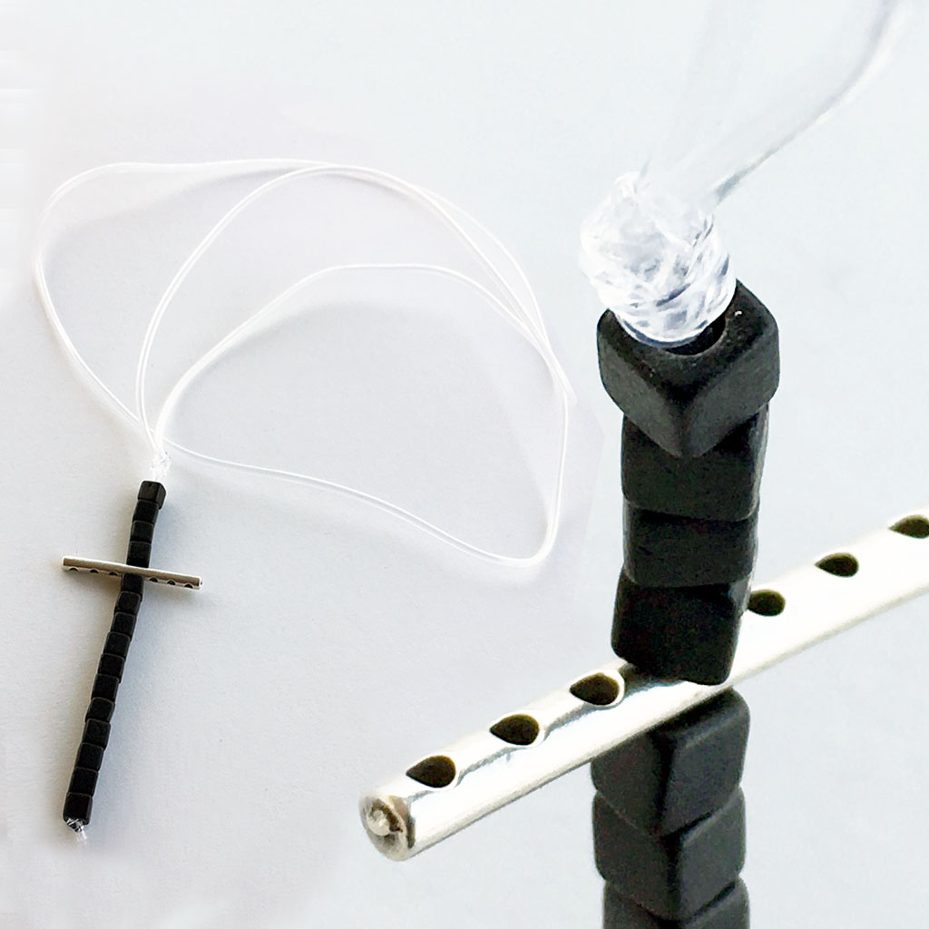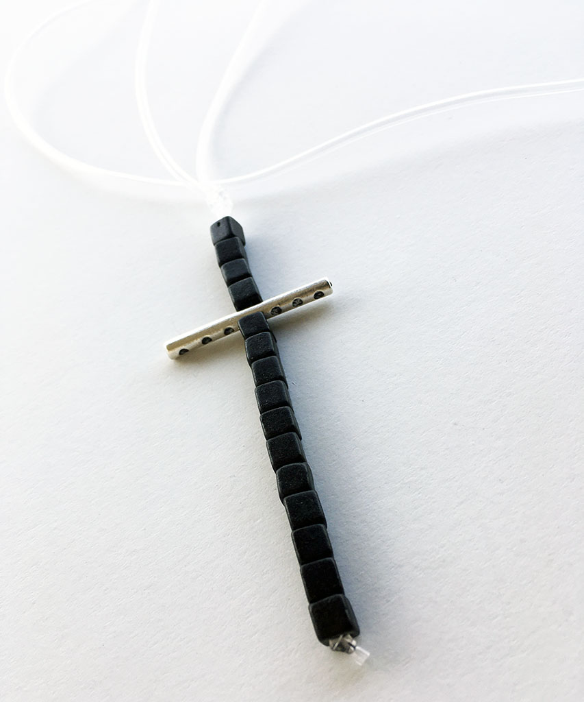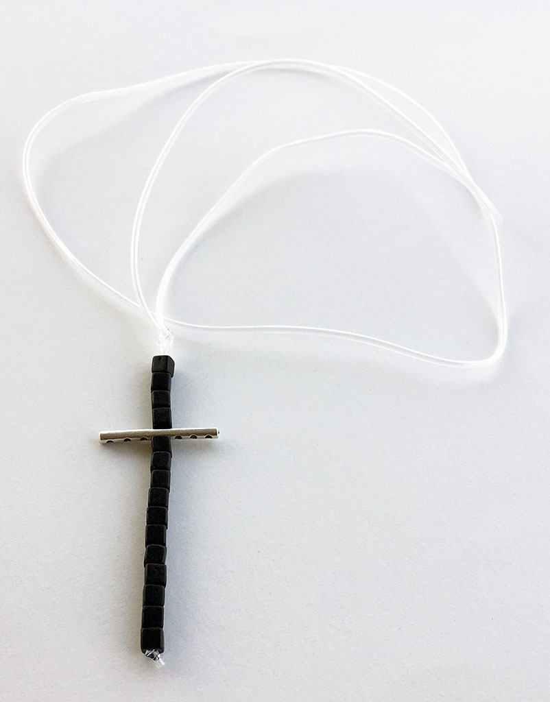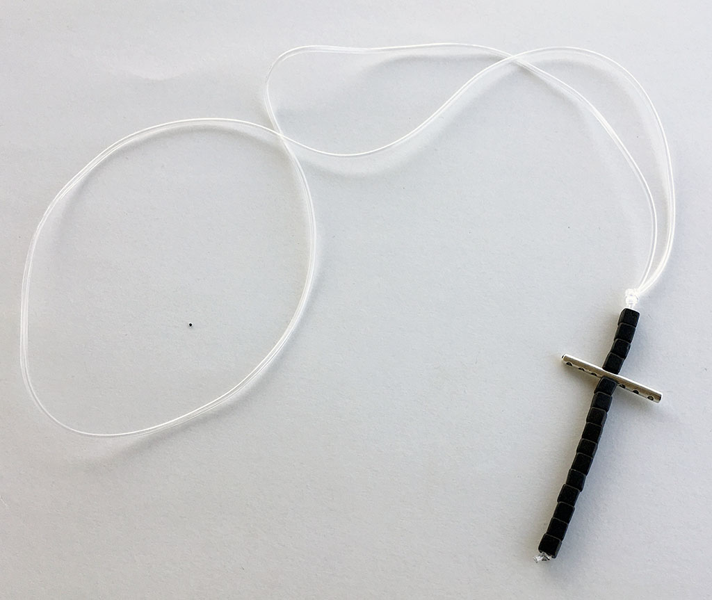 υλικά: 5 χιλ. χάντρες από πηλό σε μαύρο χρώμα, 3 χιλ. x 3,4 εκ. μεταλλική χάντρα, 2 χιλ. διάφανο καουτσούκ