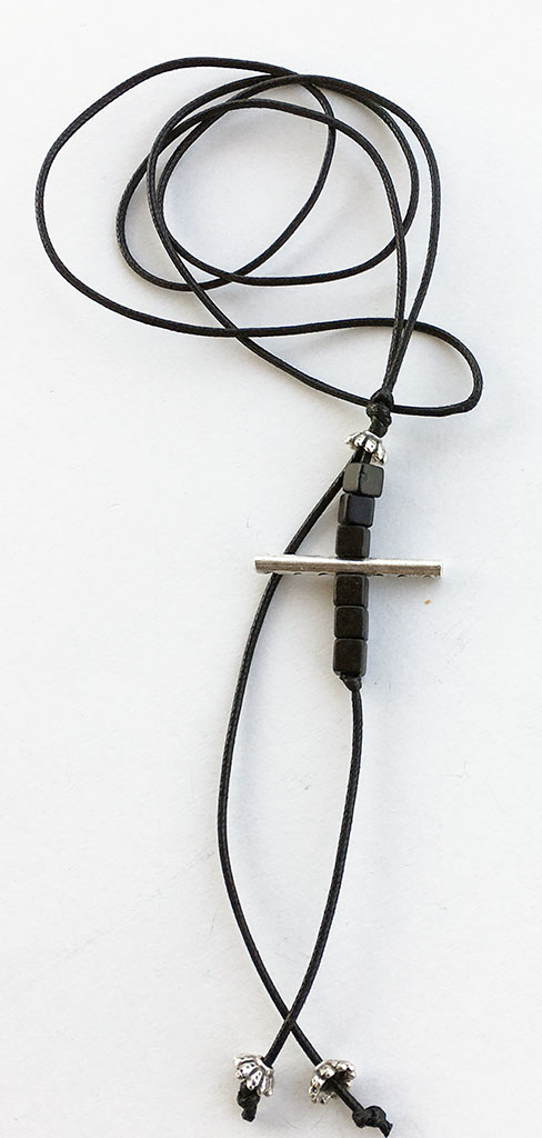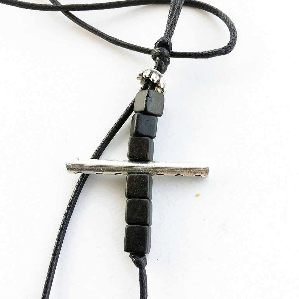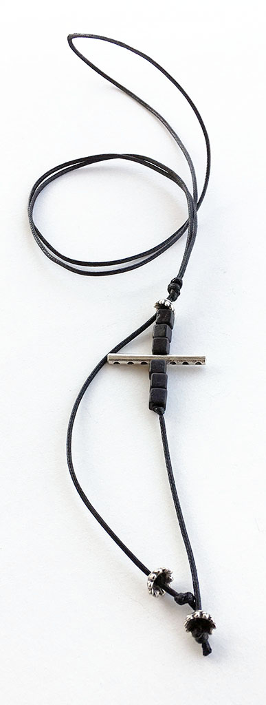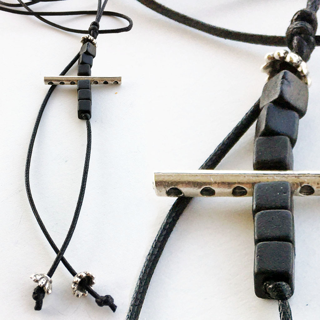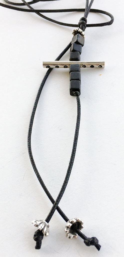 υλικά: 2 χιλ. μαύρο βαμβακερό σχοινί, 5 χιλ. χάντρες από πηλό σε μαύρο χρώμα, 2 χιλ. x 3,4 εκ. μεταλλική χάντρα, 5 χιλ x 6 χιλ. μεταλλική χάντρα