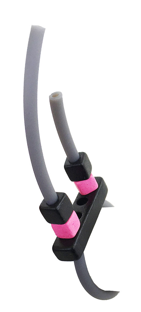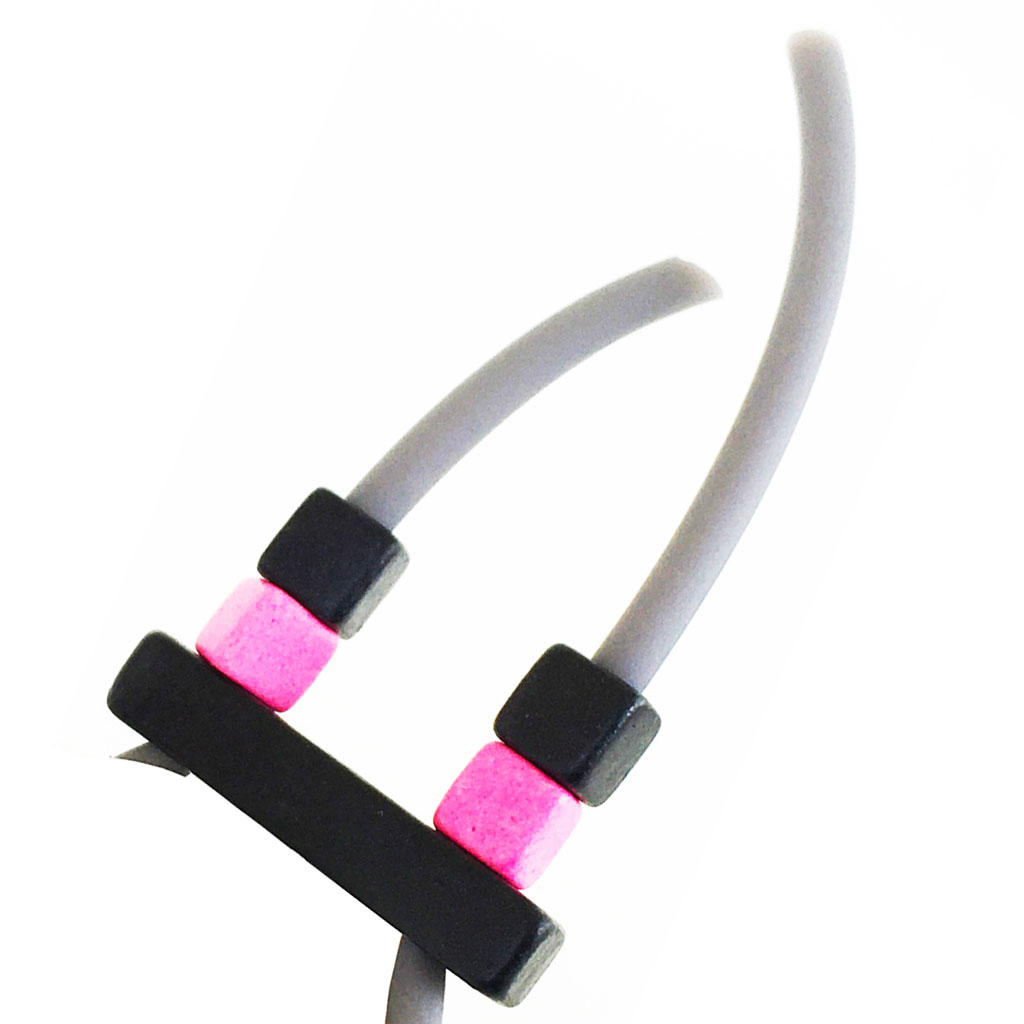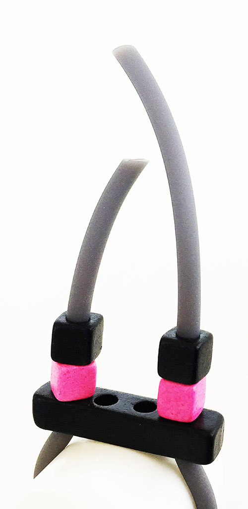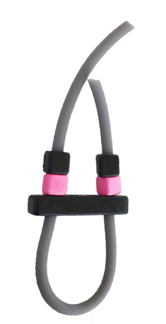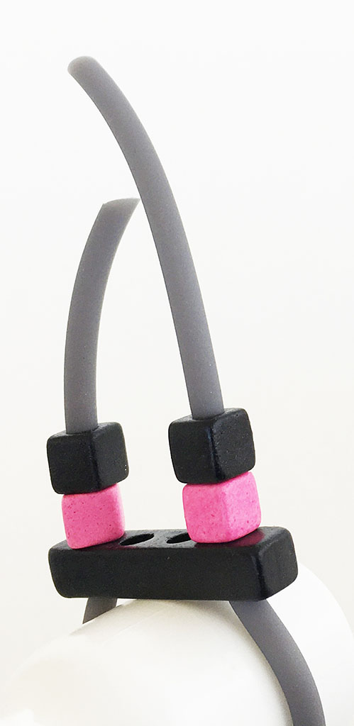 υλικά: 3 χιλ. μαύρο καουτσούκ, 5 χιλ. X 3 εκ. χάντρα από πηλό σε μαύρο χρώμα, 5 χιλ. τετράγωνες χάντρες από πηλό σε φούξια και μαύρο χρώμα