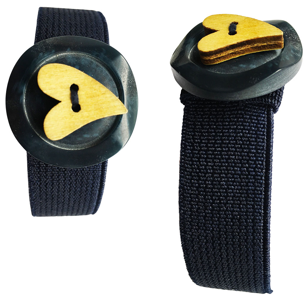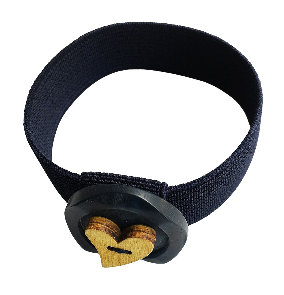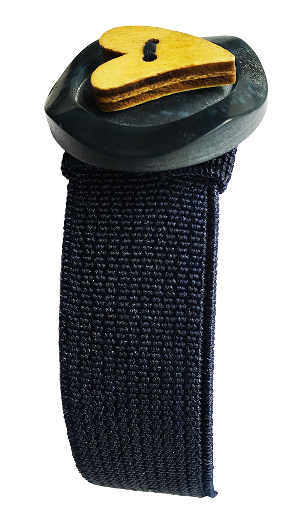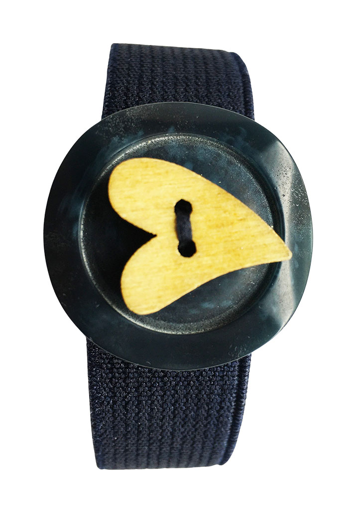 υλικά: λάστιχο σε μπλε χρώμα 2 εκ., μπλε κουμπί χάντρα διάμετρο 3 εκ, ξύλινο κουμπί χάντρα σχήμα καρδιάς 1,5 εκ x 2 εκ