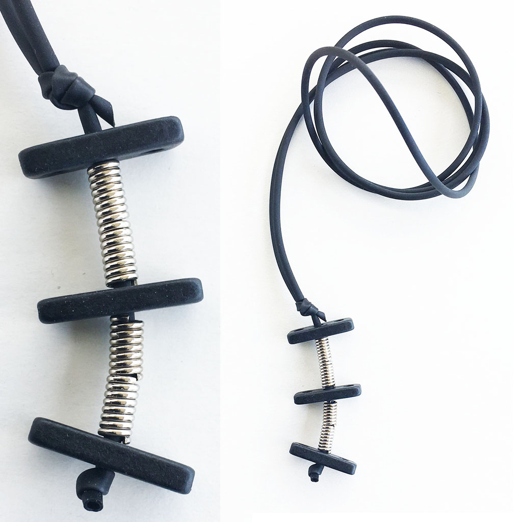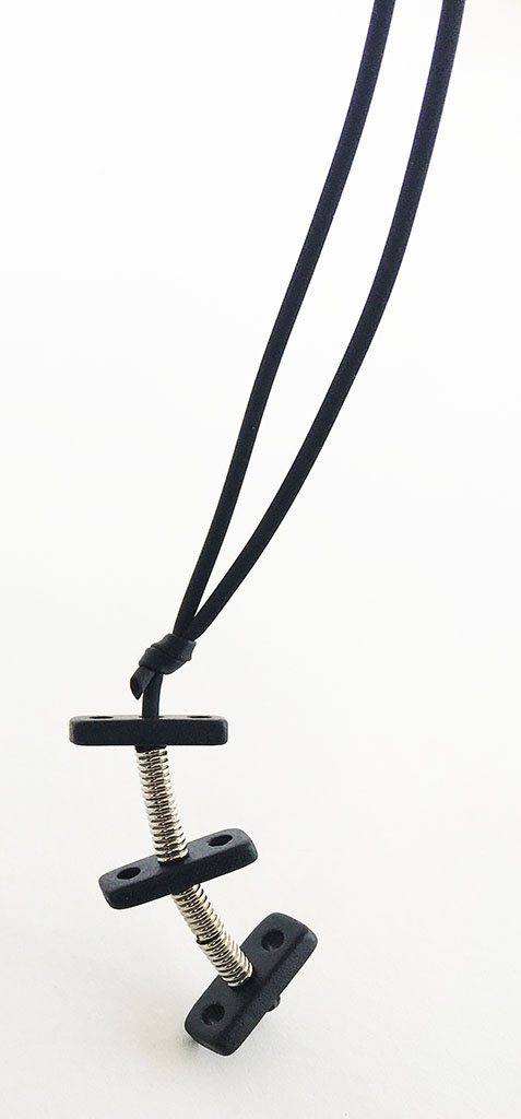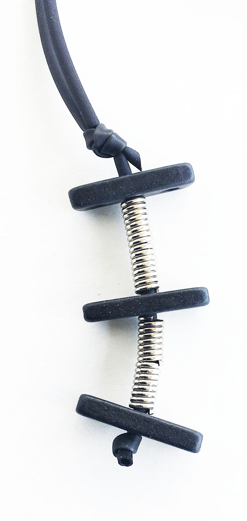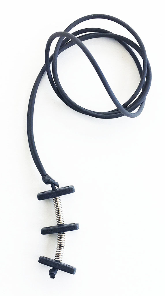 υλικά: 2 χιλ. μαύρο καουτσούκ, 3 χιλ. x 6 χιλ. ανάγλυφη μεταλλική χάντρα σχήμα σωλήνα, 2 χιλ. X 1,8 εκ. χάντρα από πηλό σε μαύρο χρώμα